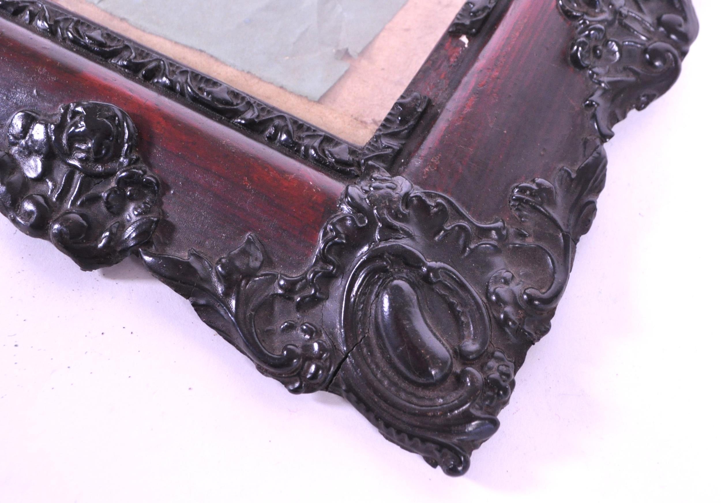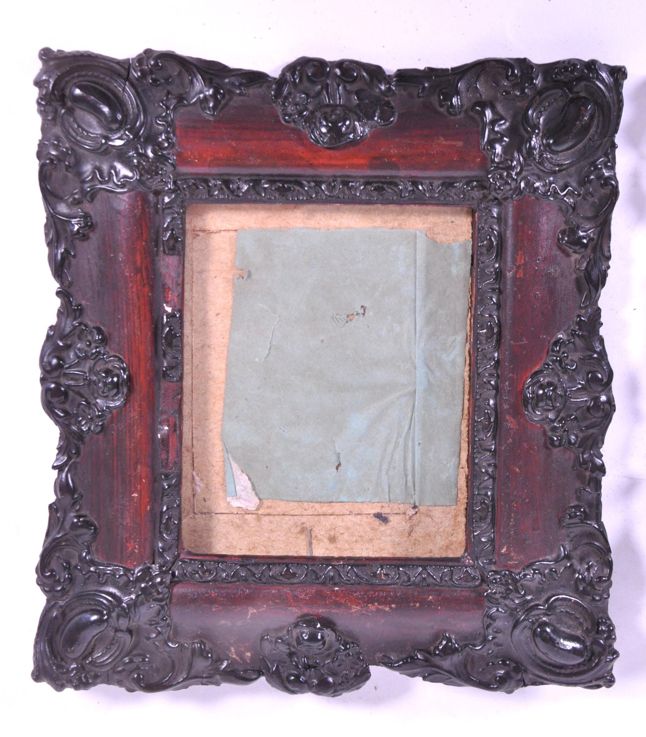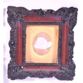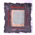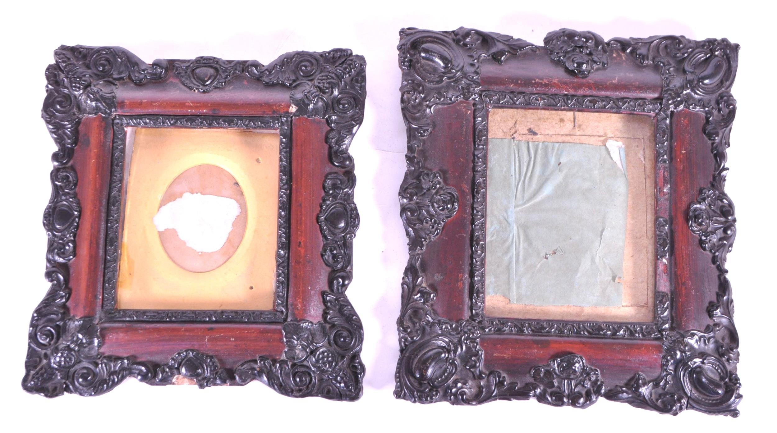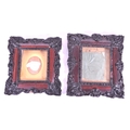 A pair of 19th century carved wooden carved frames. With an ebonised carved scrolled edge, central glass panel with backing and an inner frame border. AF.