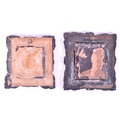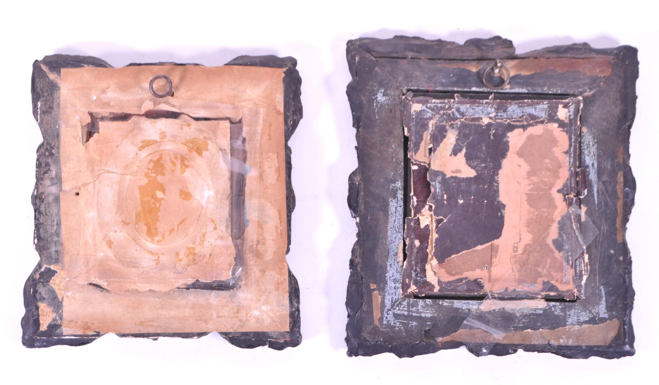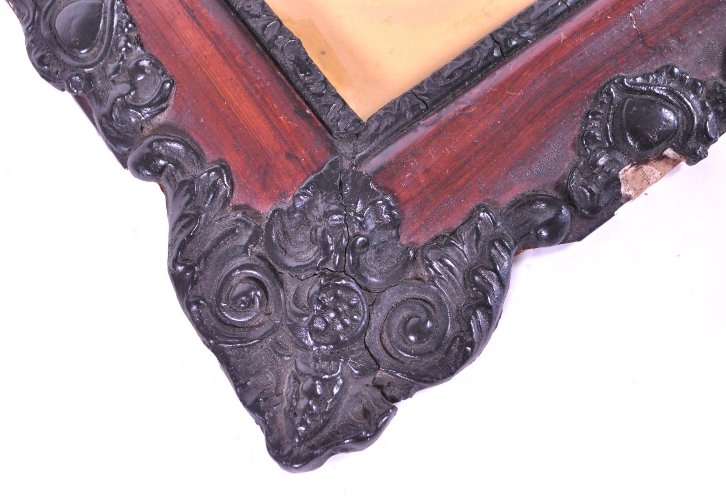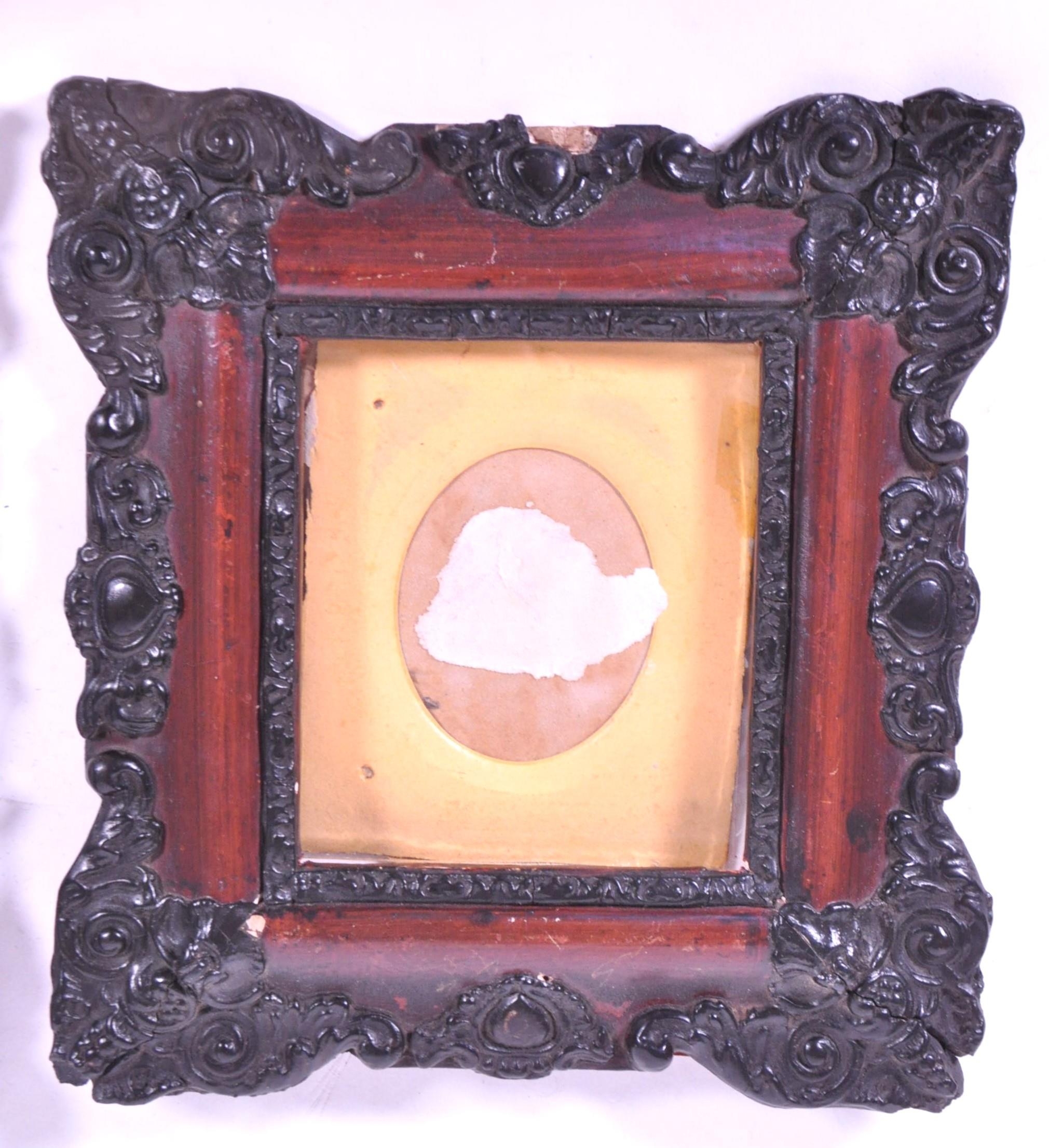 A pair of 19th century carved wooden carved frames. With an ebonised carved scrolled edge, central glass panel with backing and an inner frame border. AF.