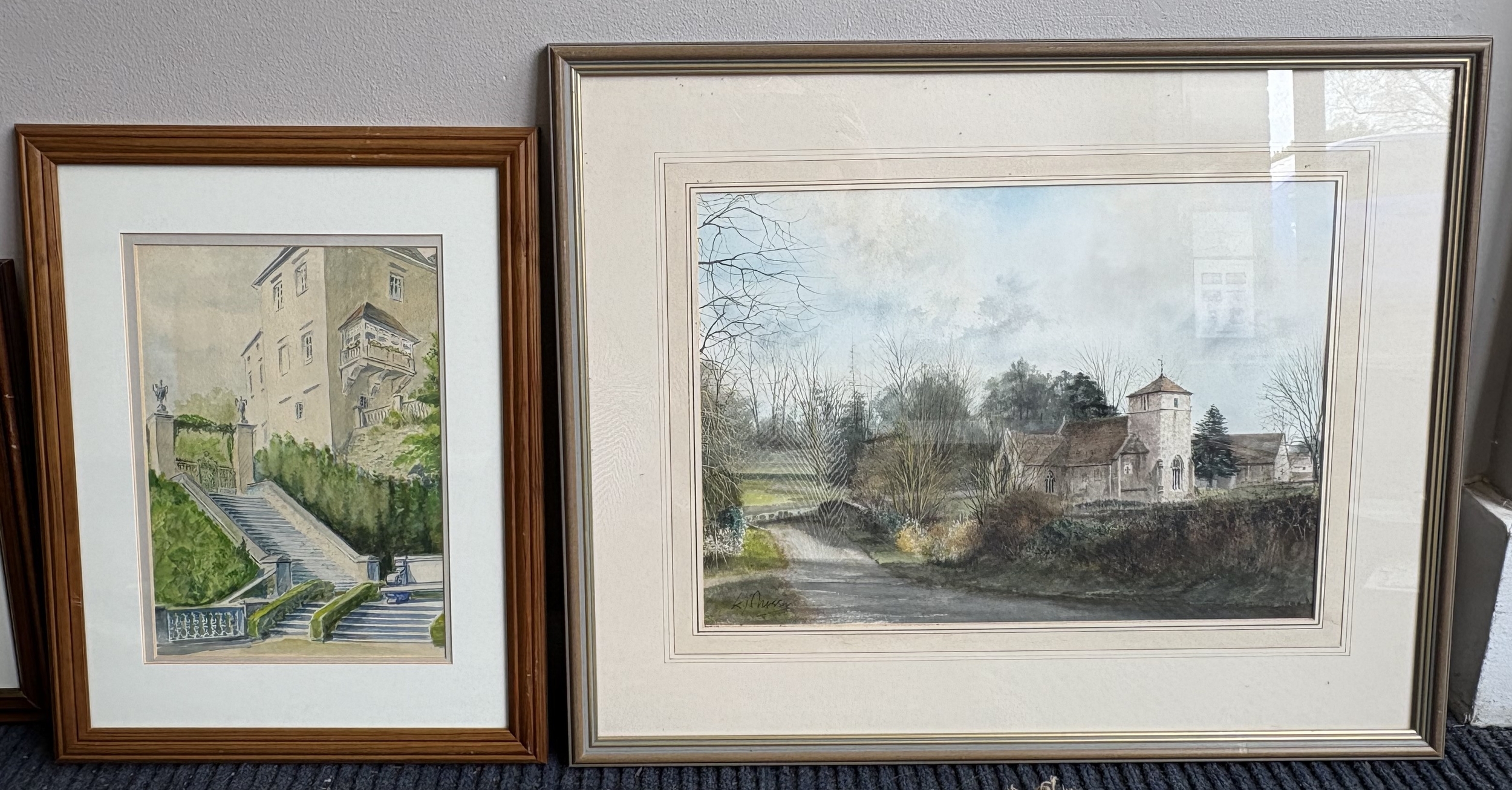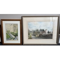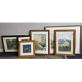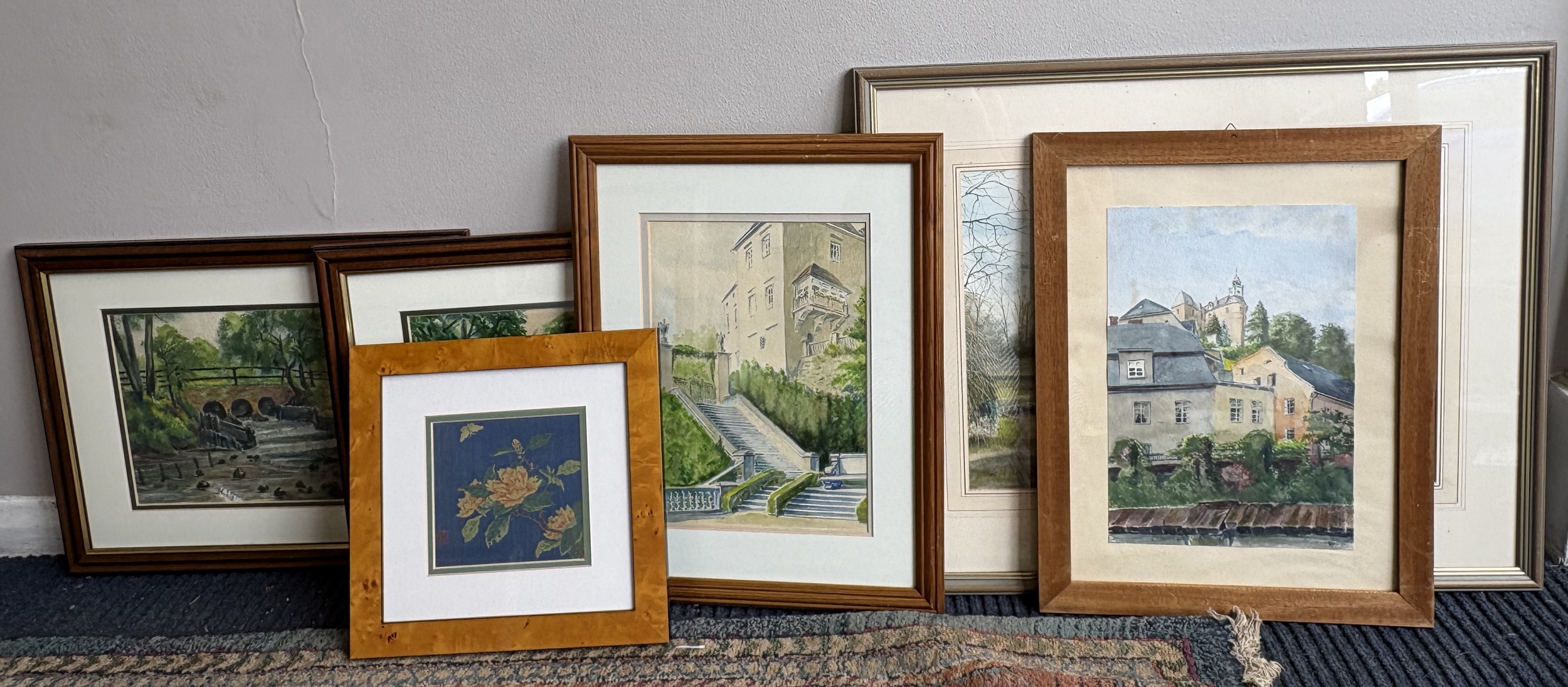 A selection of five gilt framed and glazed watercolours together with a framed and glazed silk. Various sizes. Est. £20 - £30.