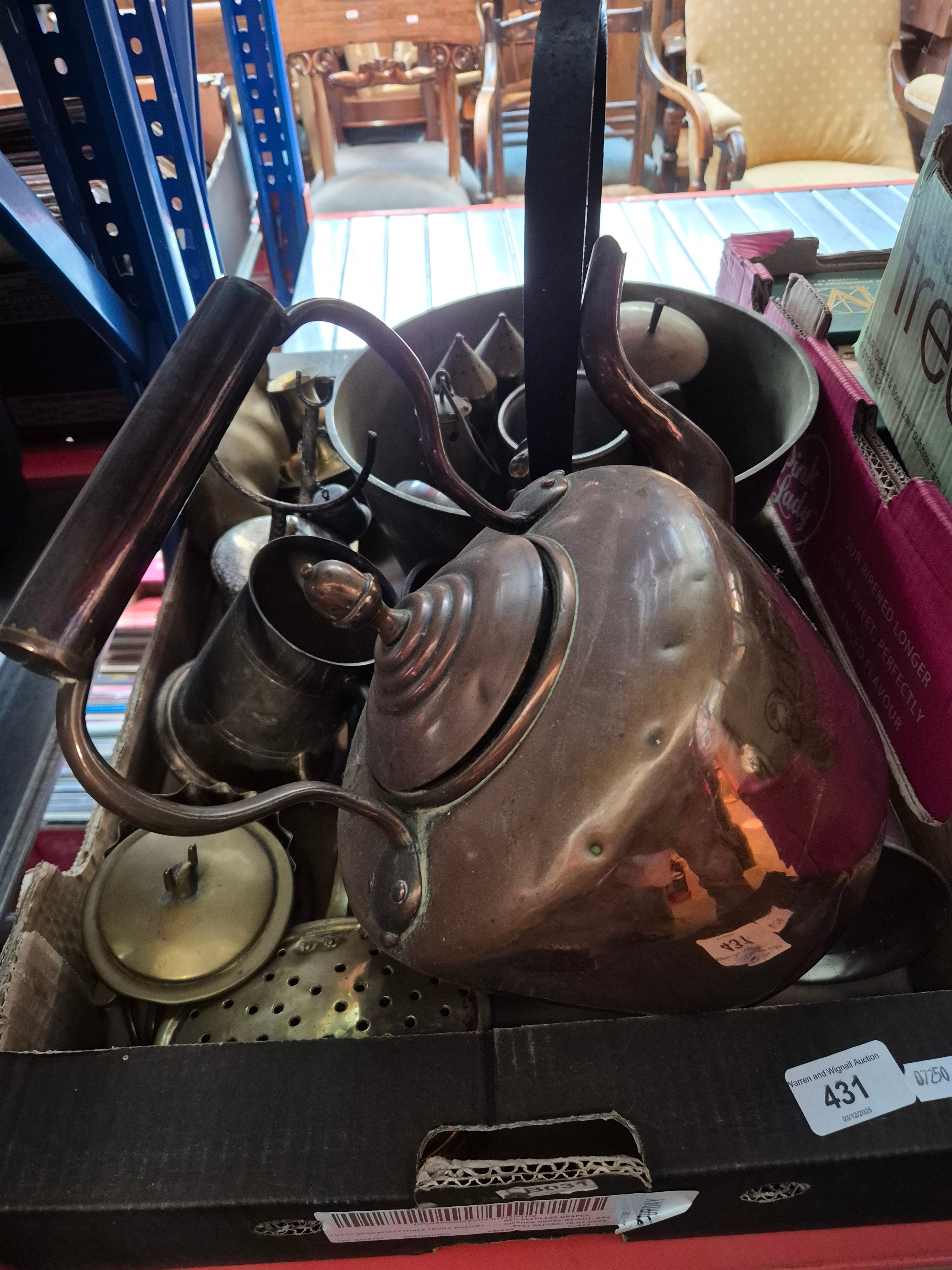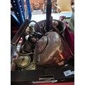 A box of metal ware including Copper kettle, brass jam pan, pewter tankards etc.