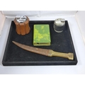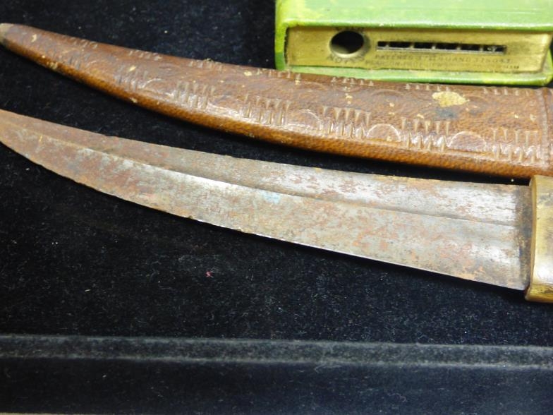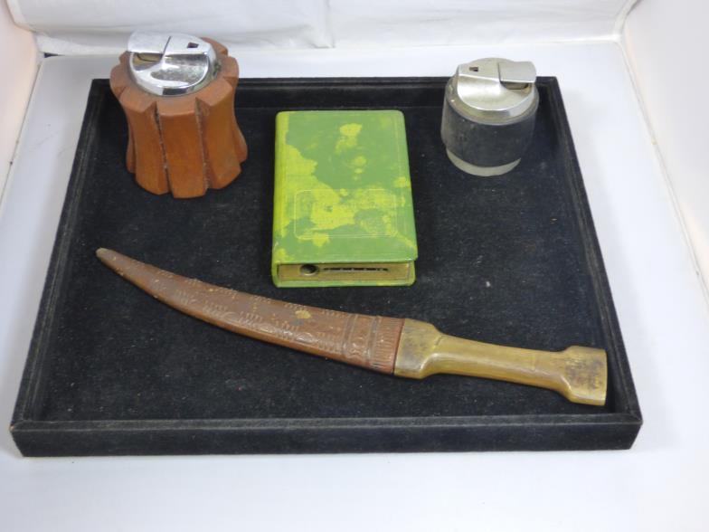 Mixed Tray of Collectibles including Retro Table Lighters, Preston Group Savings Book, and Horn Handled Arabic Jambiya