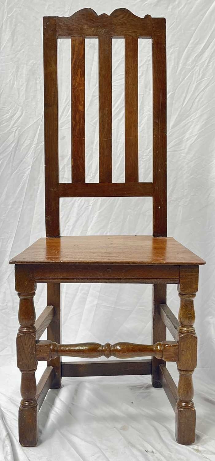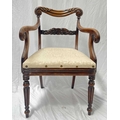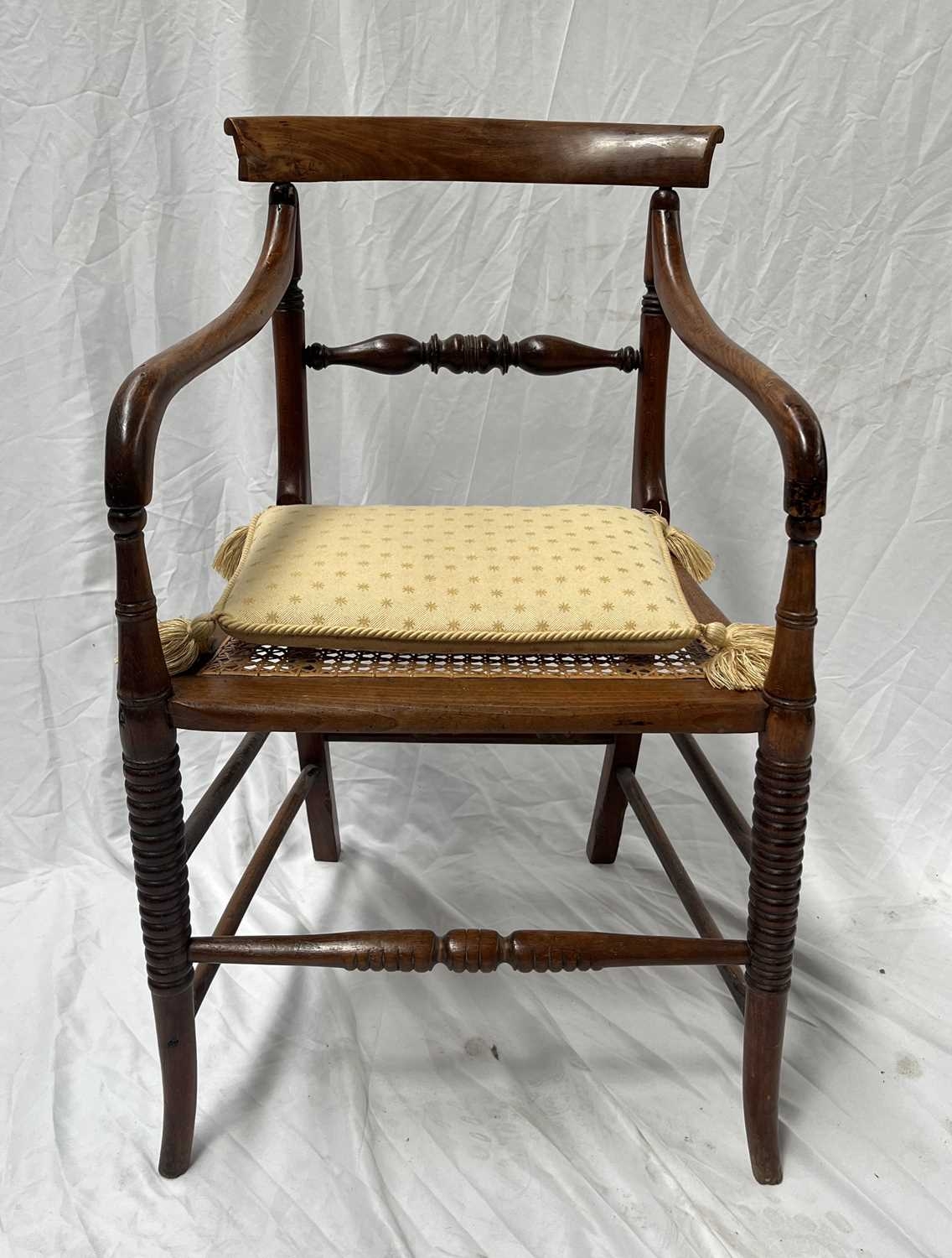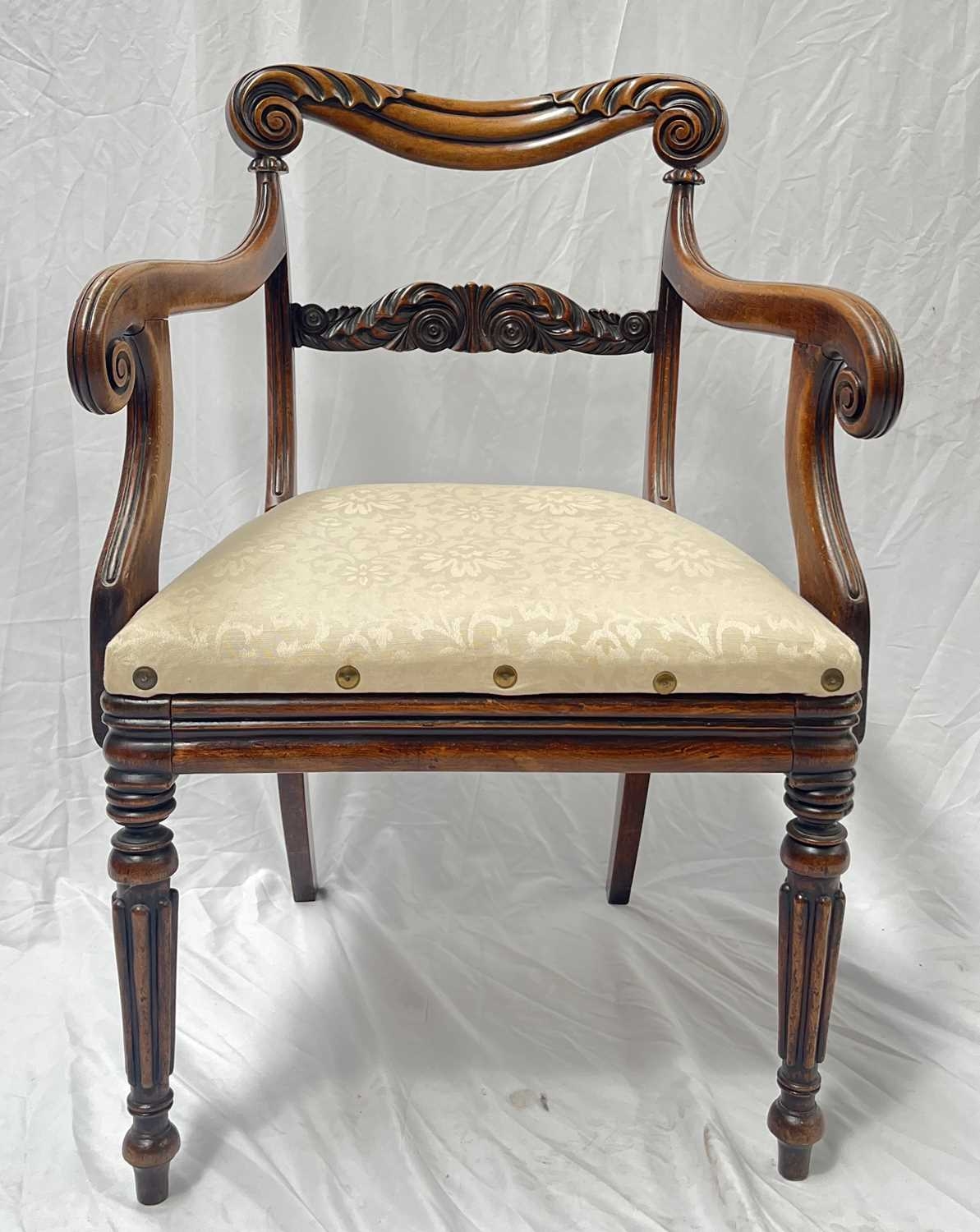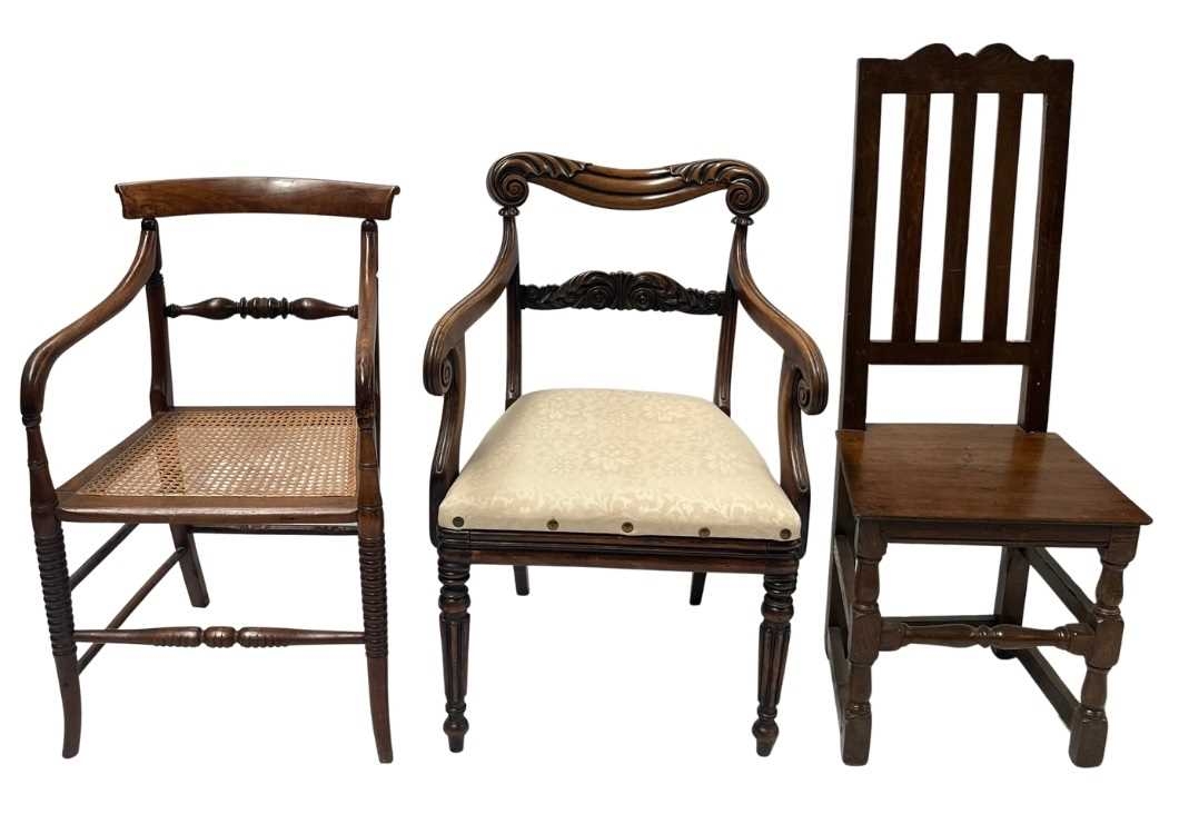 A regency mahogany armchair, scrolling top rail, carved splat, arms terminating in scrolls, drop in seat, reeded legs, in the manner of Gillows, approx; height 87cm, width 58cm, depth 50cm, together with a similar chair with caned seat and an 18th century country oak side chair with plank seat (3)