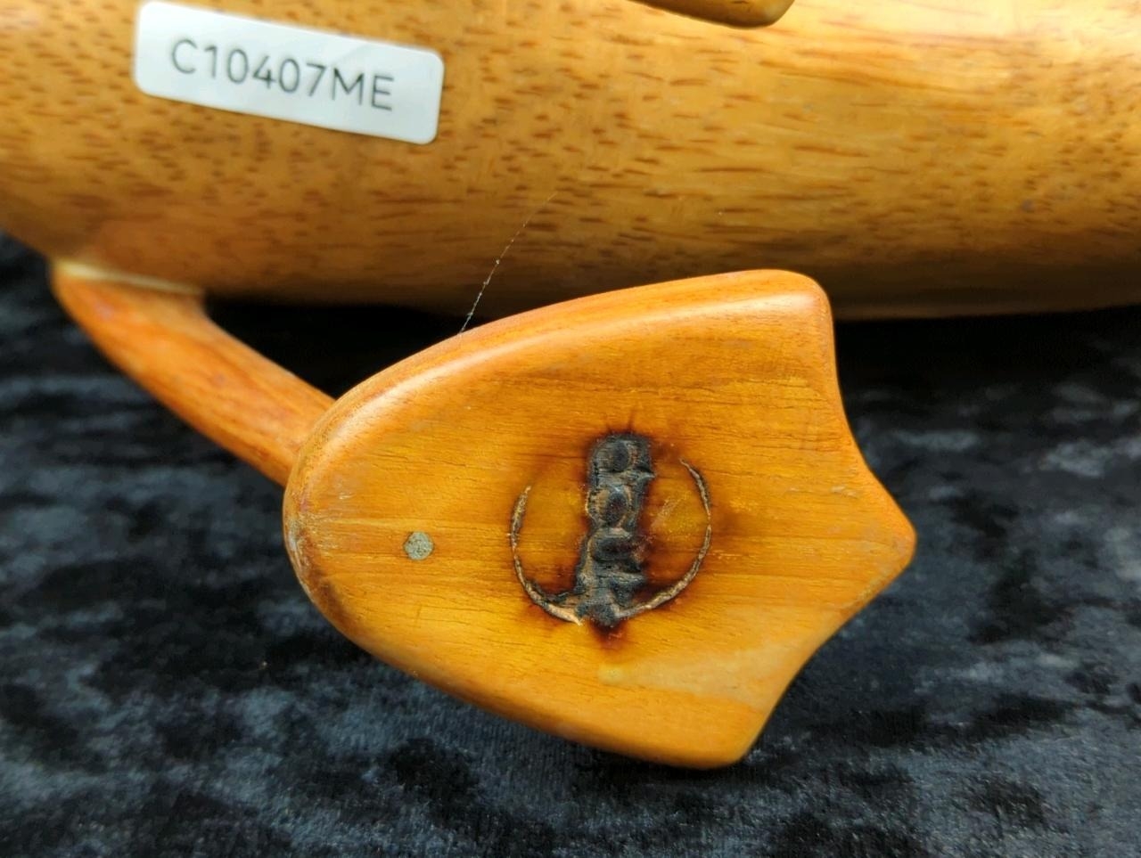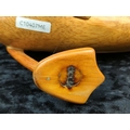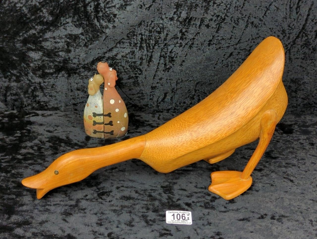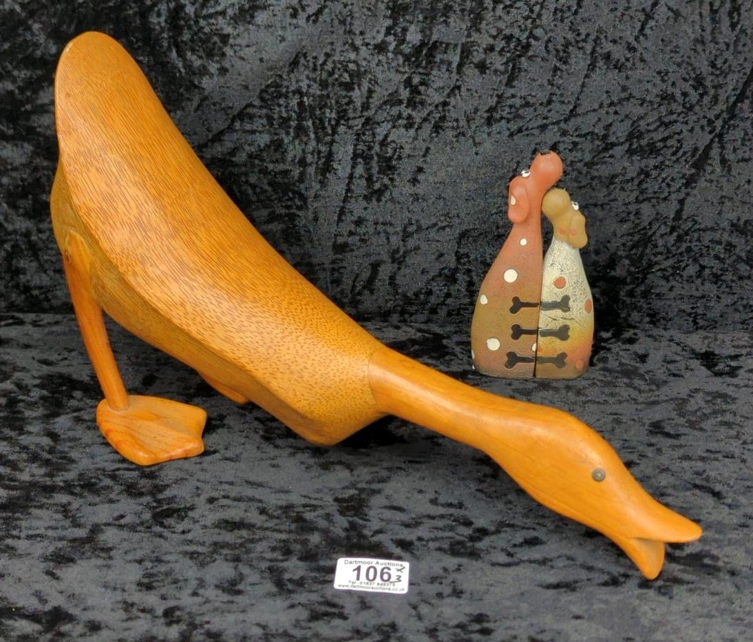 Hand-carved Indian Runner Duck ornament, made from bamboo root, by DCUK with stamp to base of one foot - The Original Wooden Duck Company (approx L42 cm) plus a pair of quirky ceramic dog figurines.