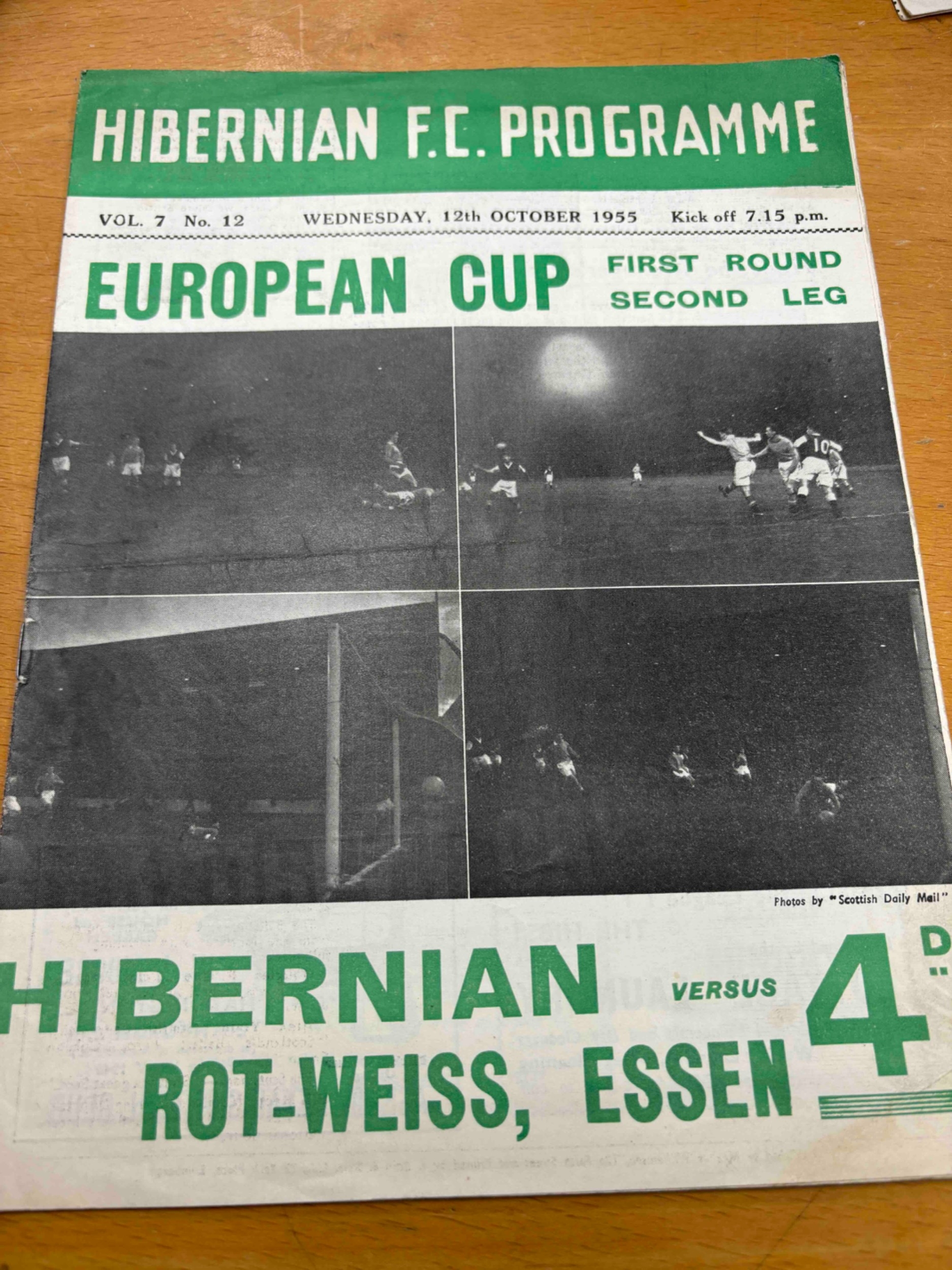 1955/56 Hibs v Rot Weiss Essen, European Cup, First Round, 2nd Leg. Although Hibs did not win the Scottish league they were entered by invitation.