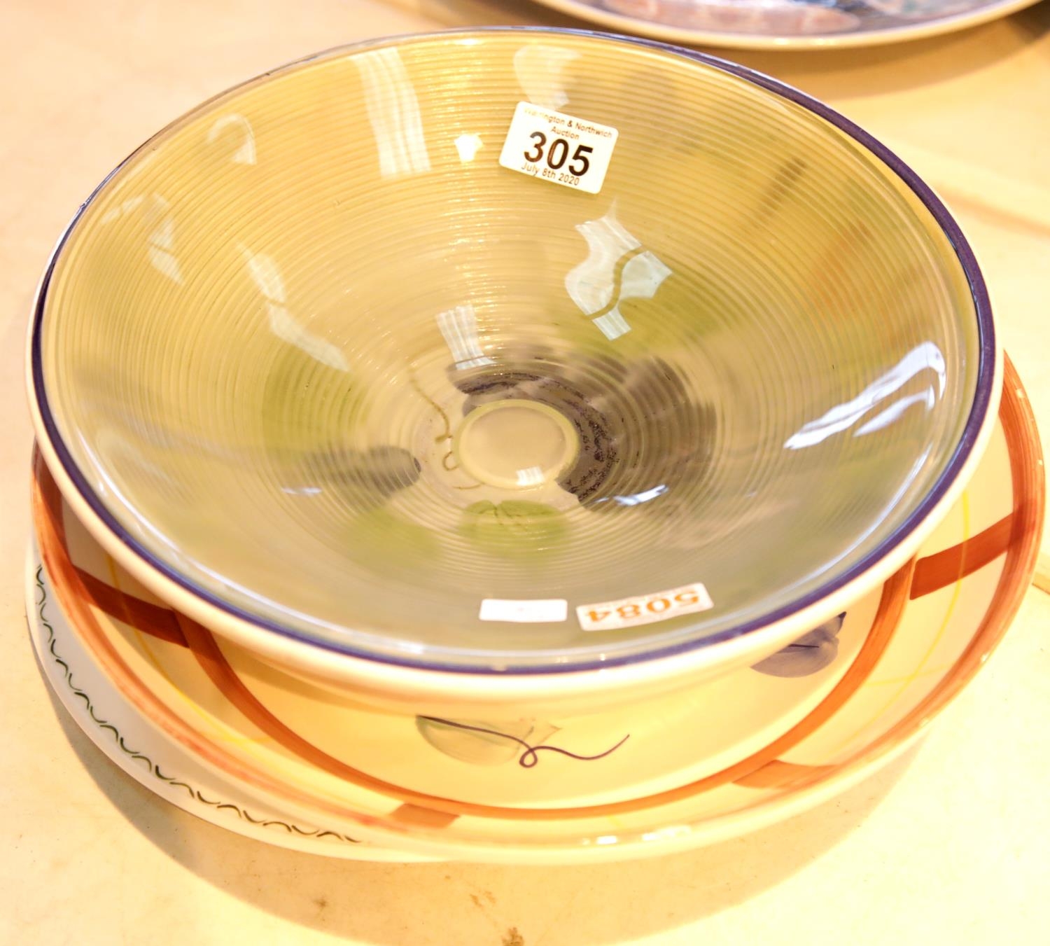 Two large ceramic bowls, a glass bowl and a charger. This lot is not available for in-house P&P.