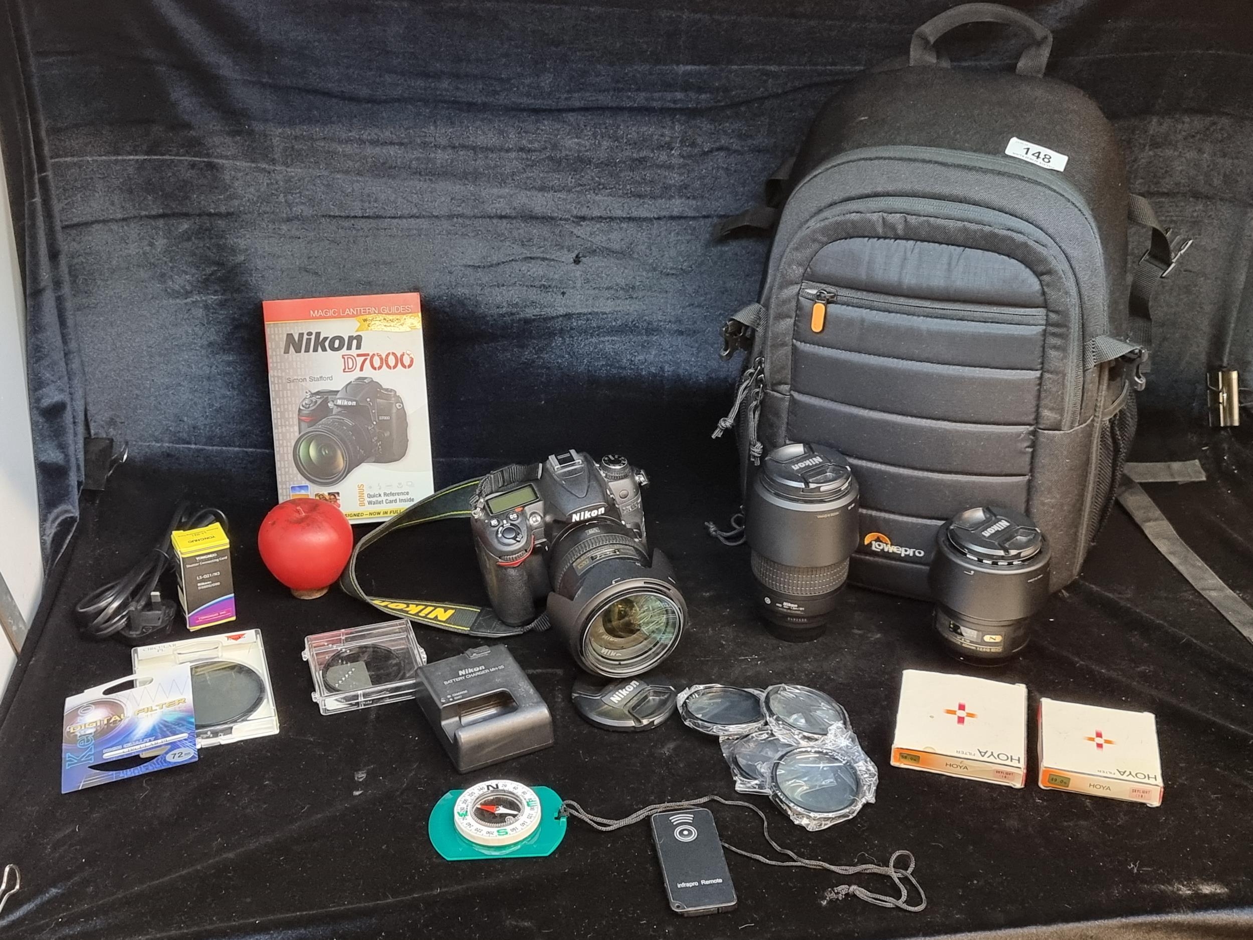 Star Lot: An excellent lot of photography equipment including a Nikon D7000 with a AF-S NIKKOR 18-200mm 1:3 5-5.6 G II ED lens, four macro lenses, a digital circular P filter, a NIKON AF NIKKOR 70-300mm 1:4-5.6 G lens, a NIKKOR 60mm 1:2.8 G ED lens, HOYA filters (49.0s & 58.0s), battery charger, instructions manual and more accessories. Includes super high quality camera bag. There is a super video of this lot on all our social media pages, Facebook, instagram and tic tok