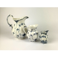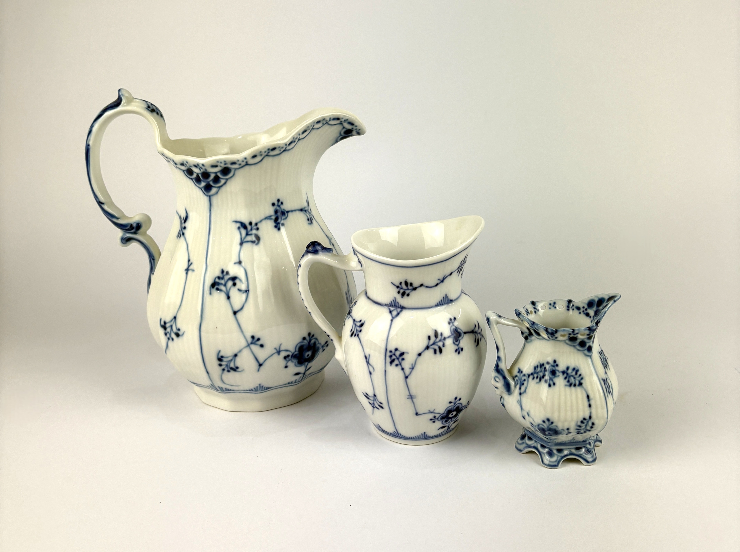Three Royal Copenhagen 'Blue Lace' porcelain baluster jugs, to include one shape no 443, 20cm high, and one shape no 392, 8cm