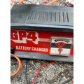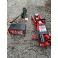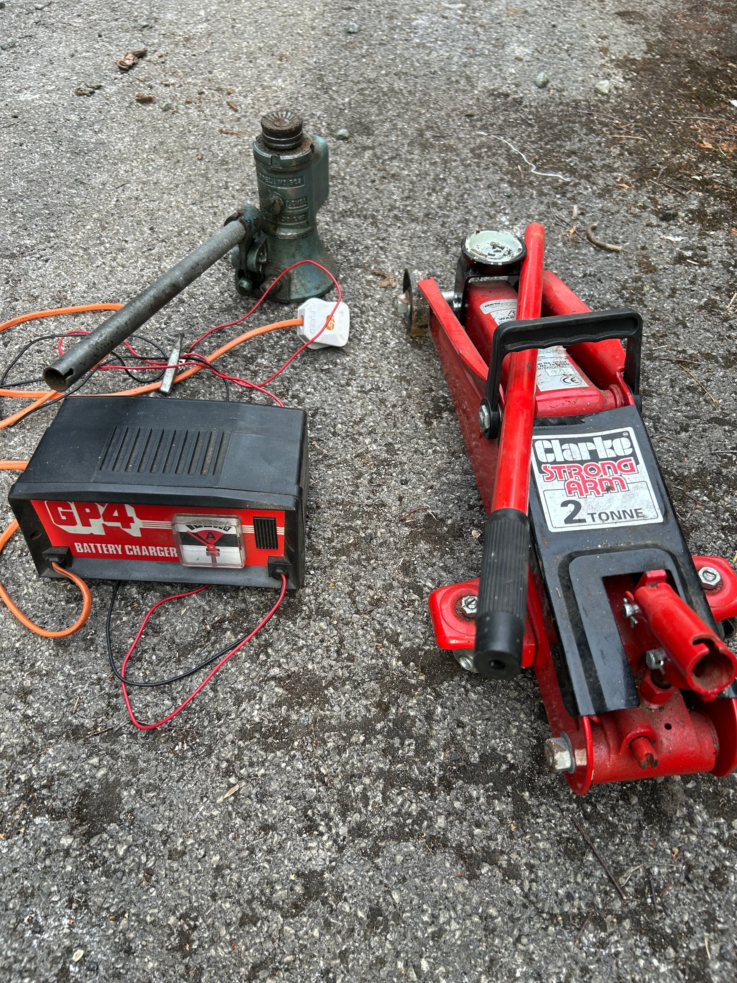A Clarke Strong Arm 2 Tonne trolley jack, a vintage Eversure 902 Hydraulic Jack and a GP4 Battery Charger