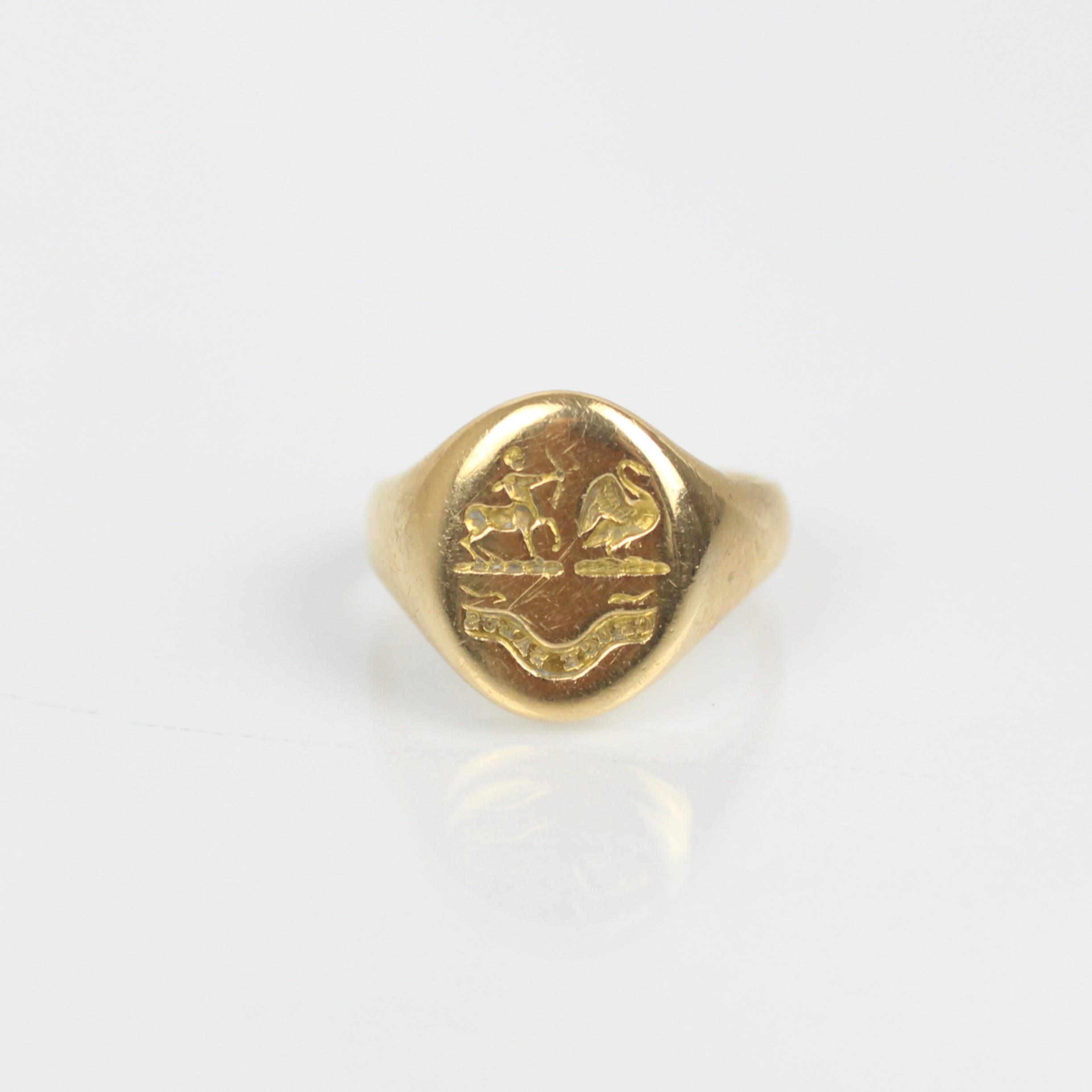 General surface scuffs, tarnishing and scratches seen throughout the signet ring, commensurate with age and wear.