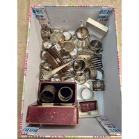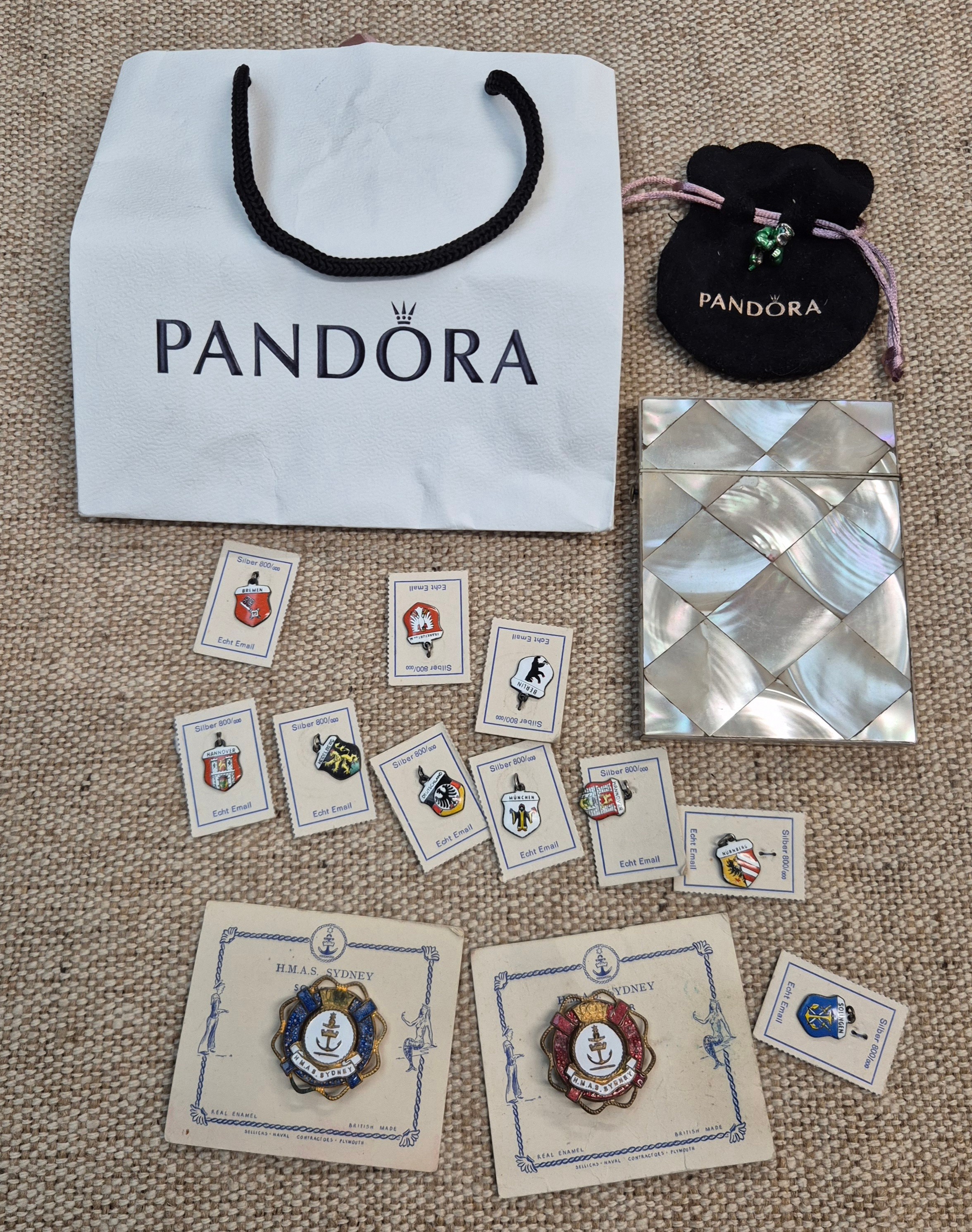 A box of collectables including a mother of Pearl cigarette case, several silver enamelled badges etc.