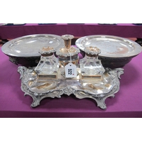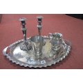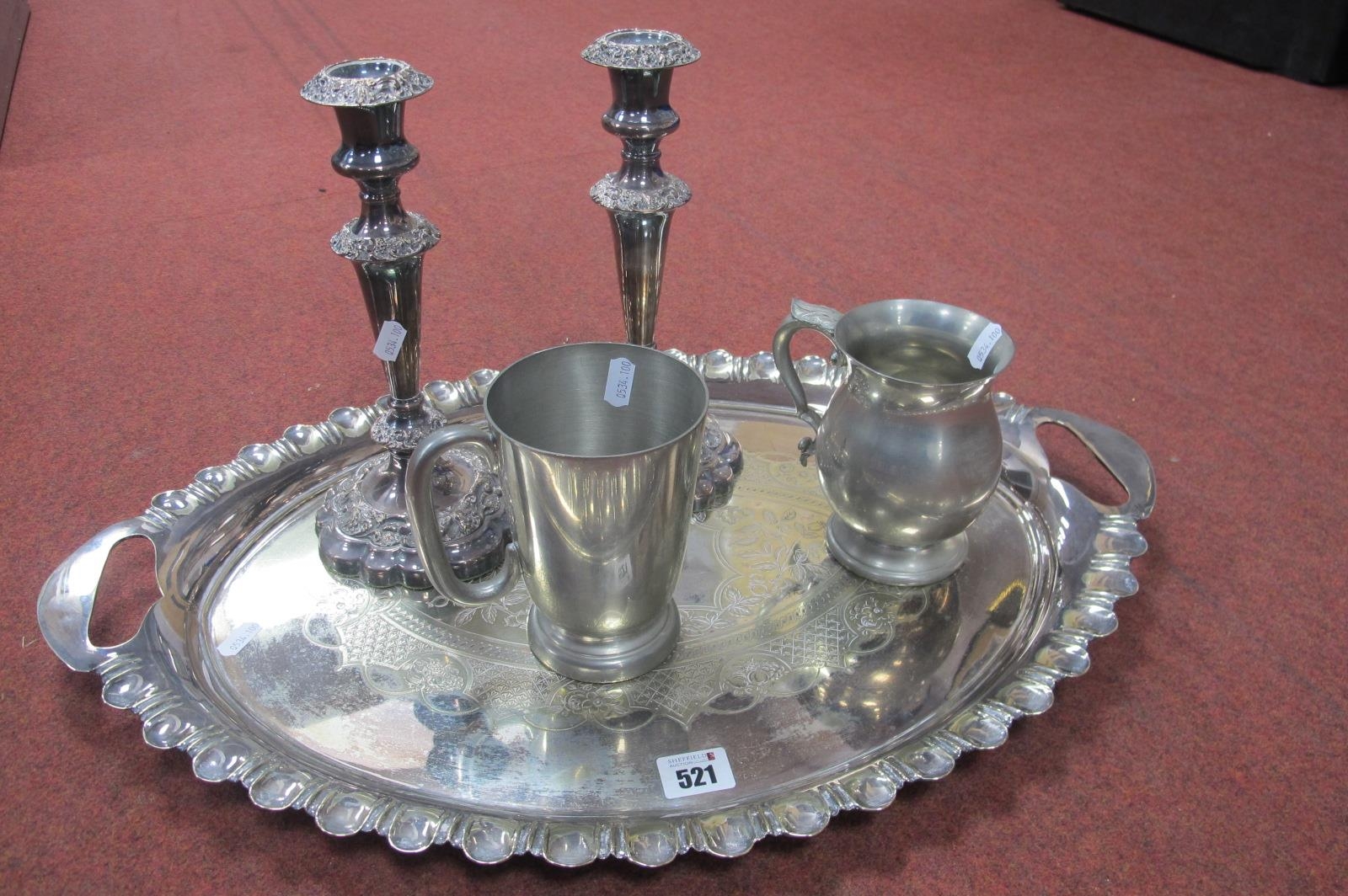 A Thomas Richards Fairbairns Sheffield XIX Century Twin Handled Plated Tray, of shaped design with foliate decoration, overall width over handles 59cm; together with a pair of decorative plated candlesticks and two pewter mugs.