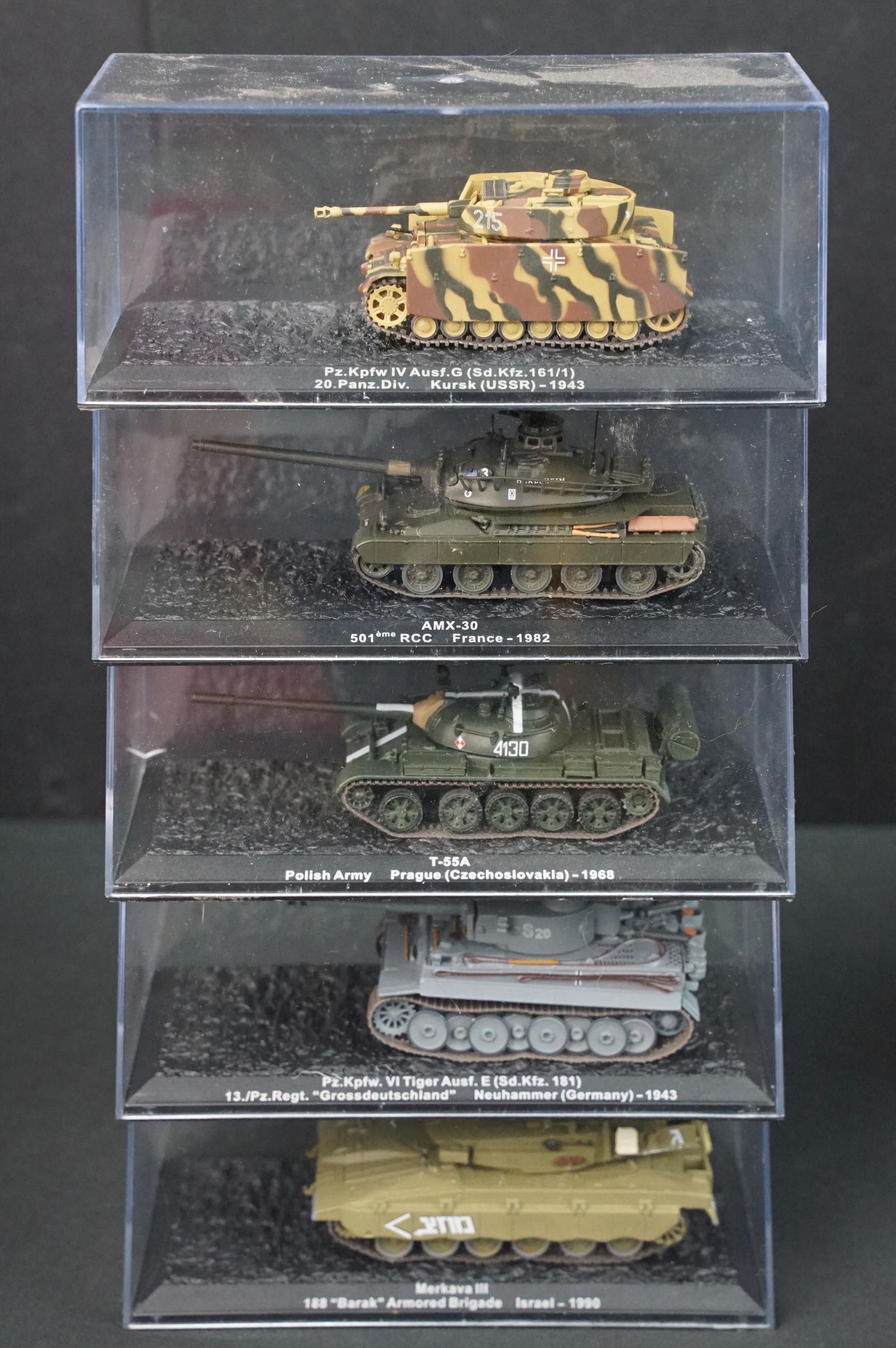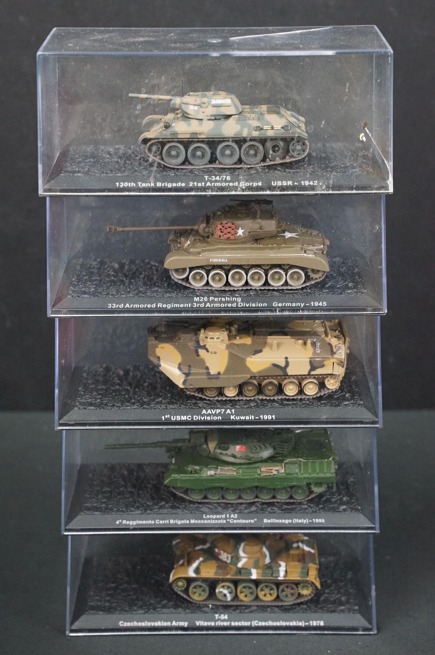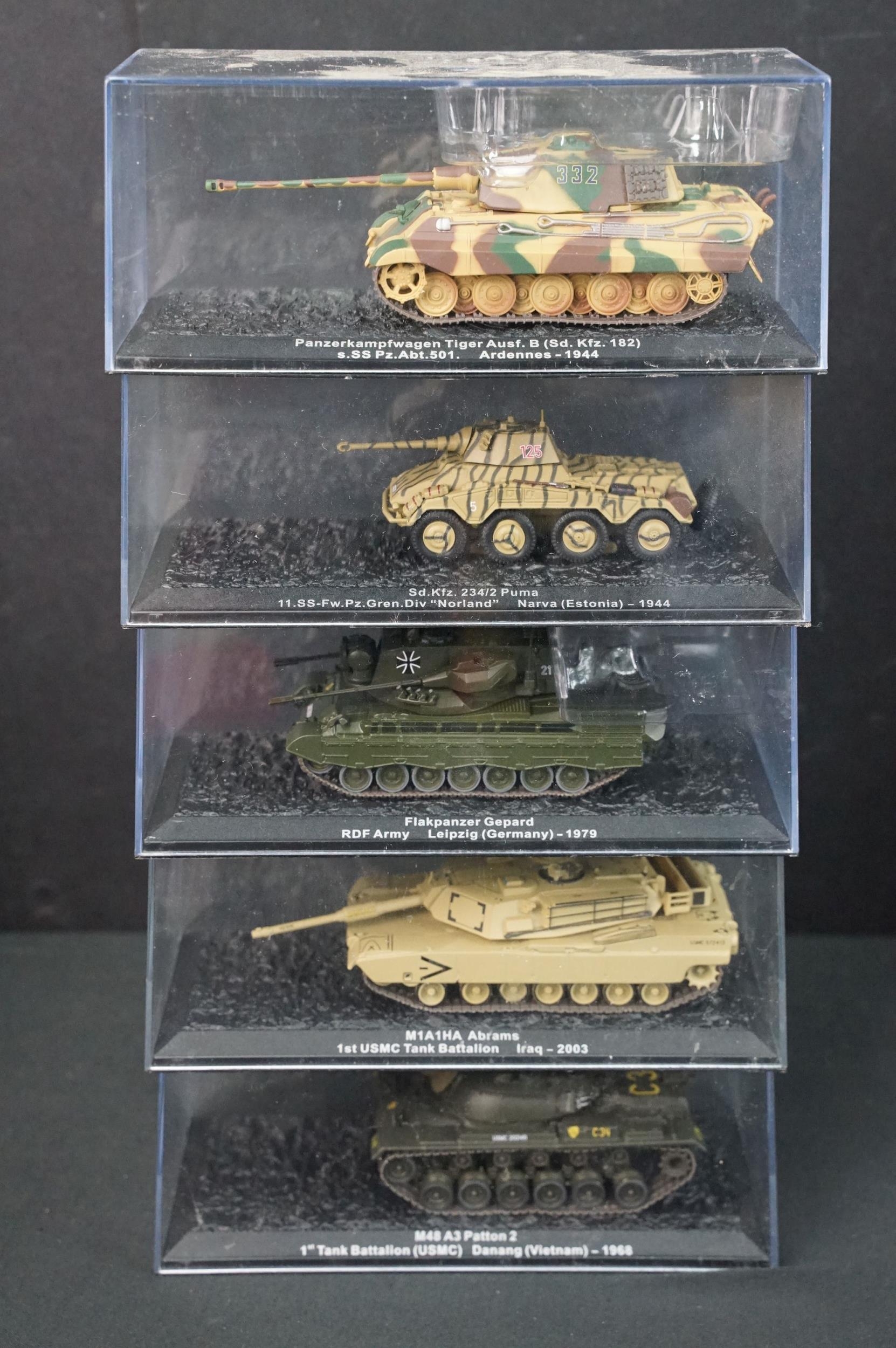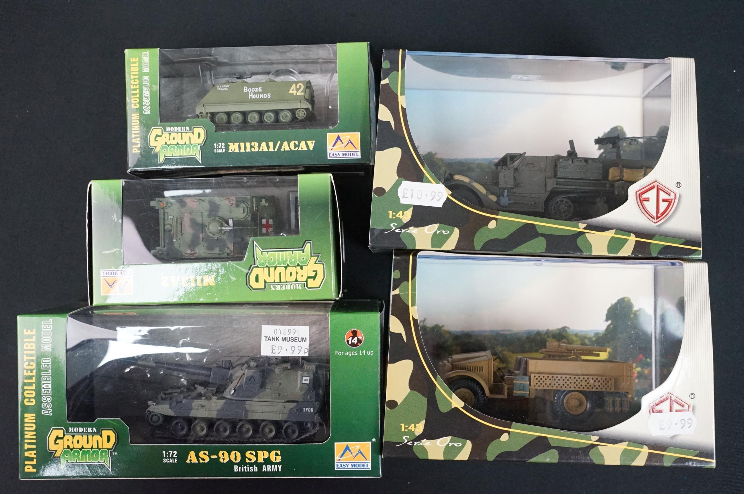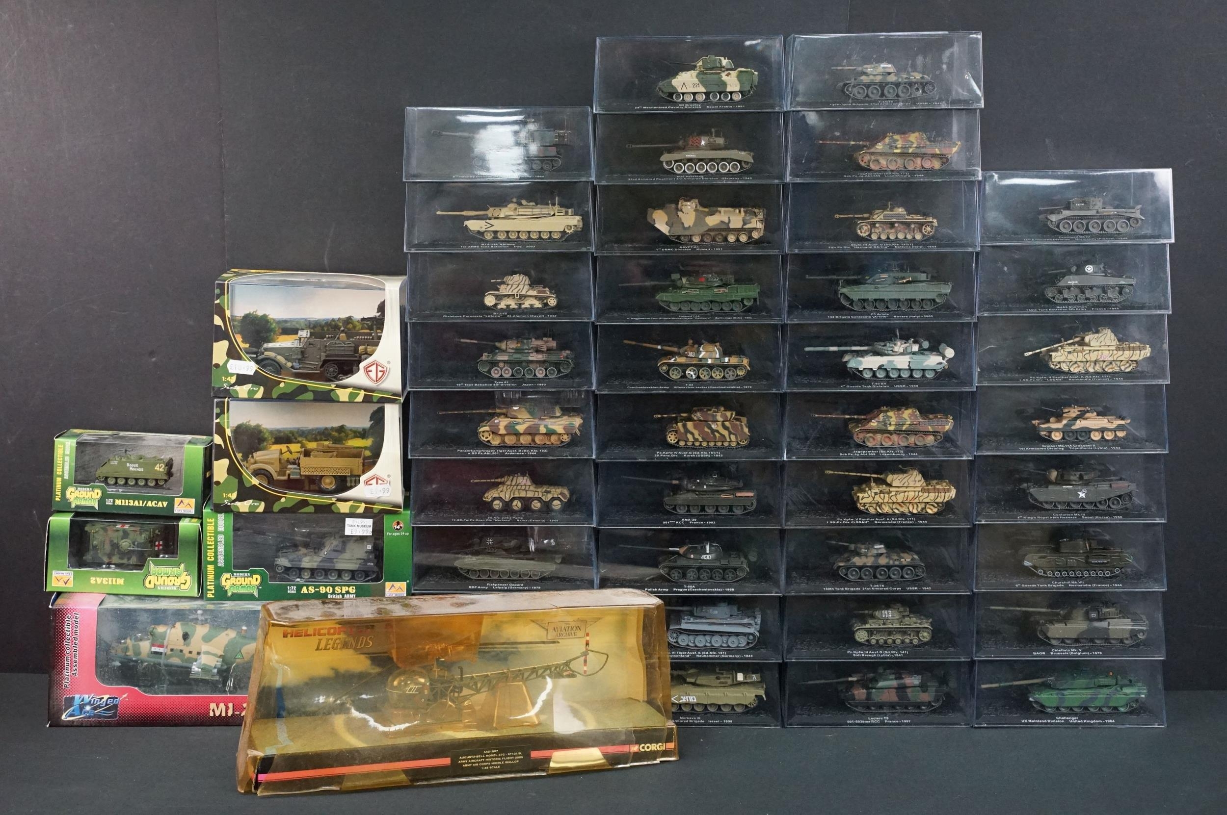 43 Boxed military diecast models to include 37 x cased tanks, 2 x Edison Giocattoli, 1 x Easy Model, Corgi Helicopter Legends AA51907 (ex with dis-colouring and cracks to box) etc, all ex unless stated