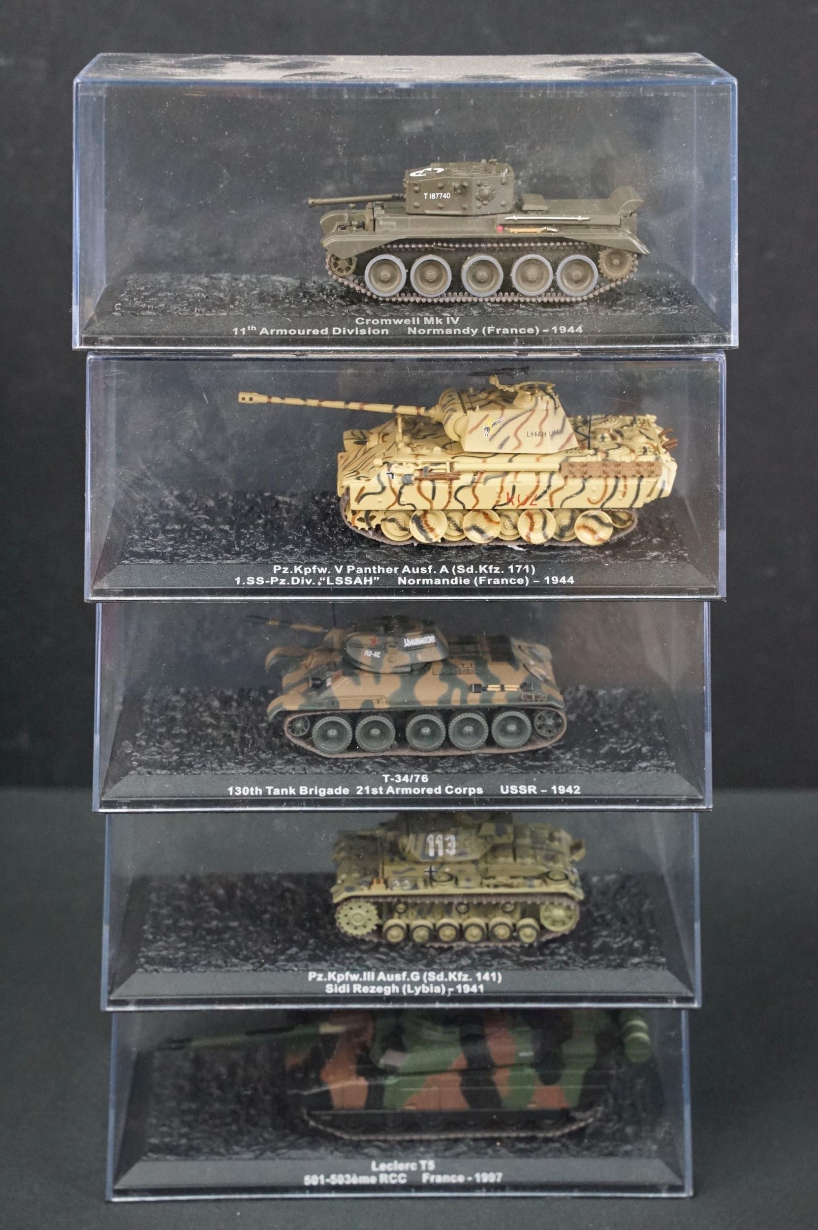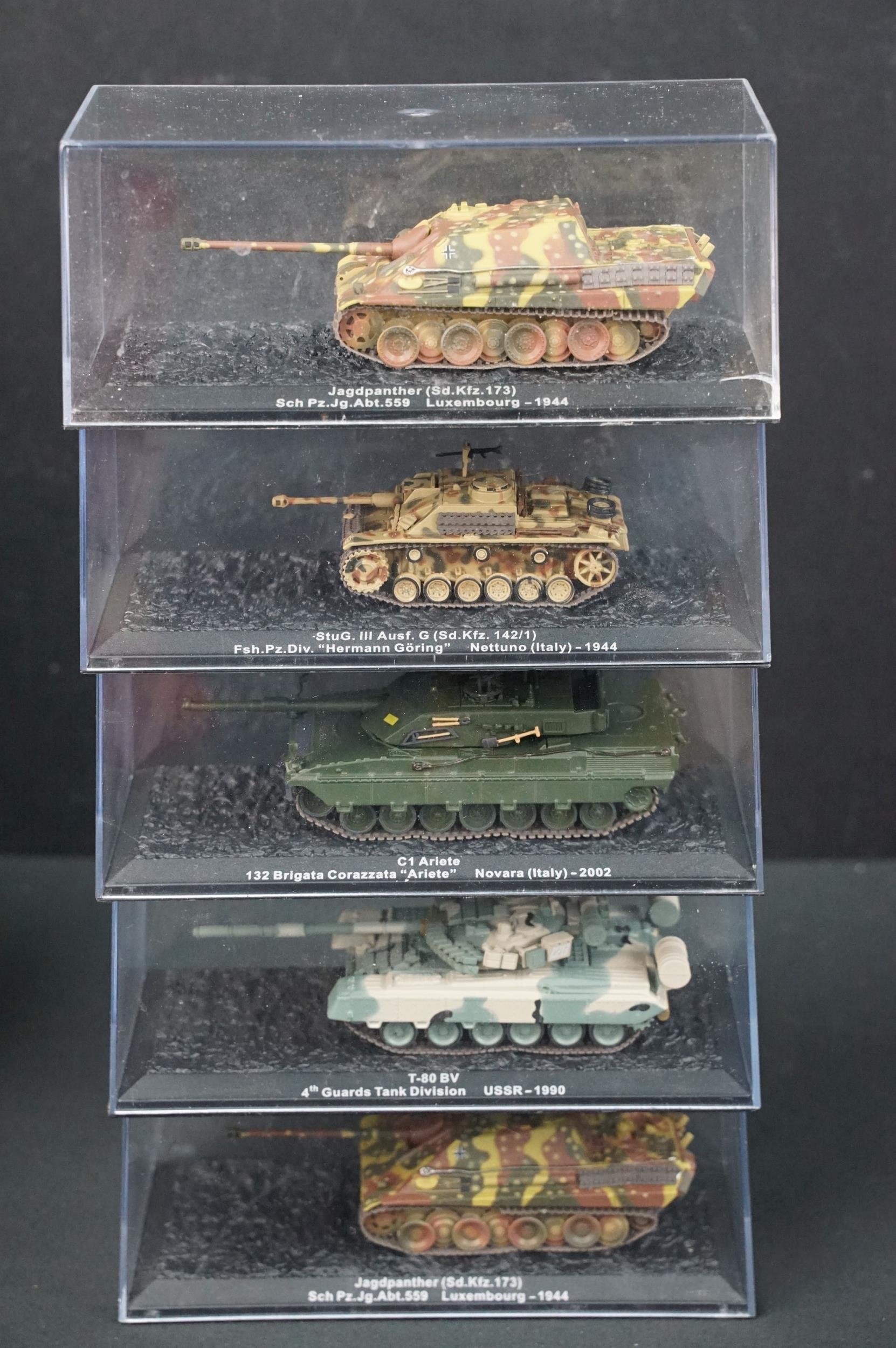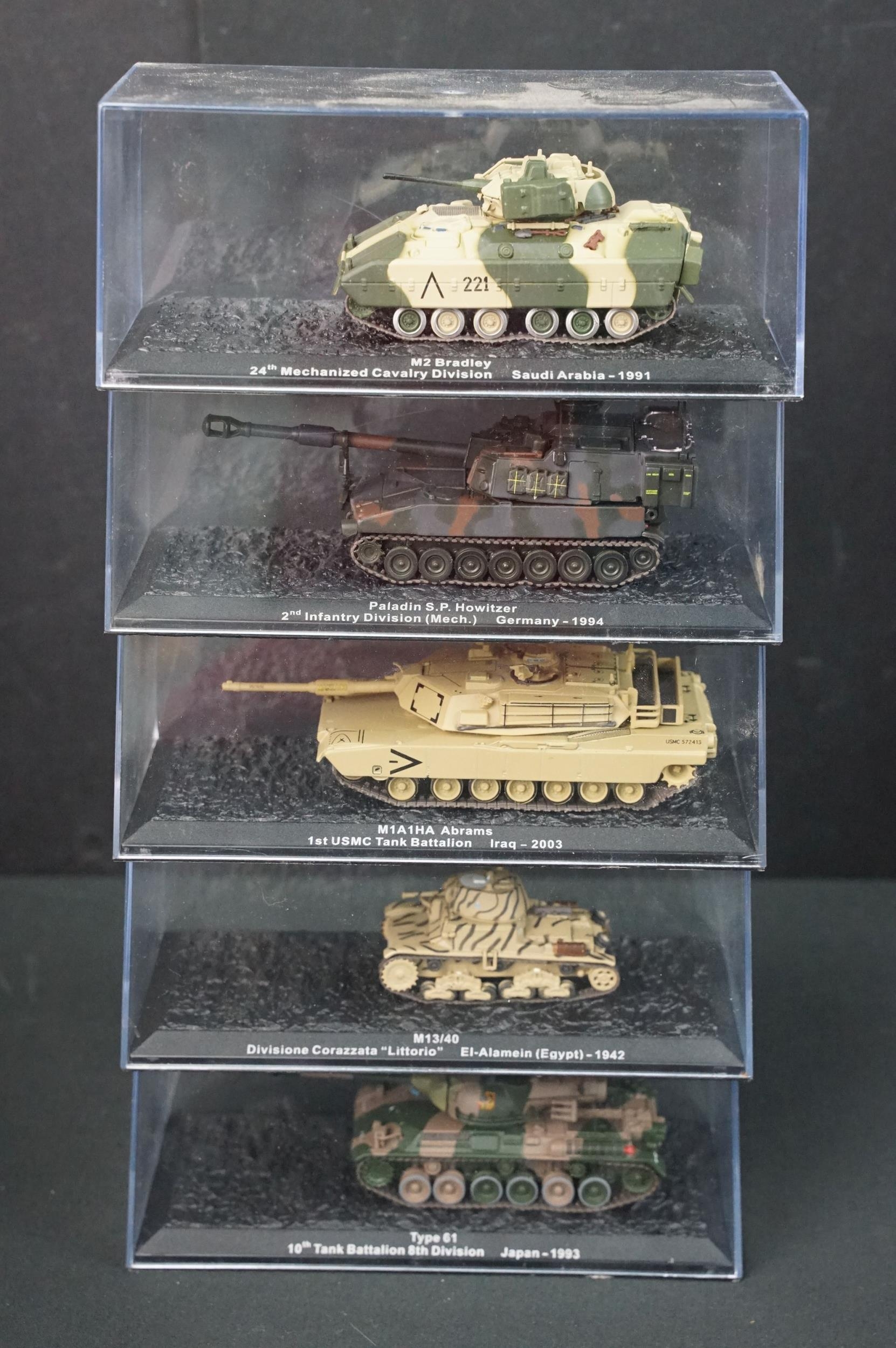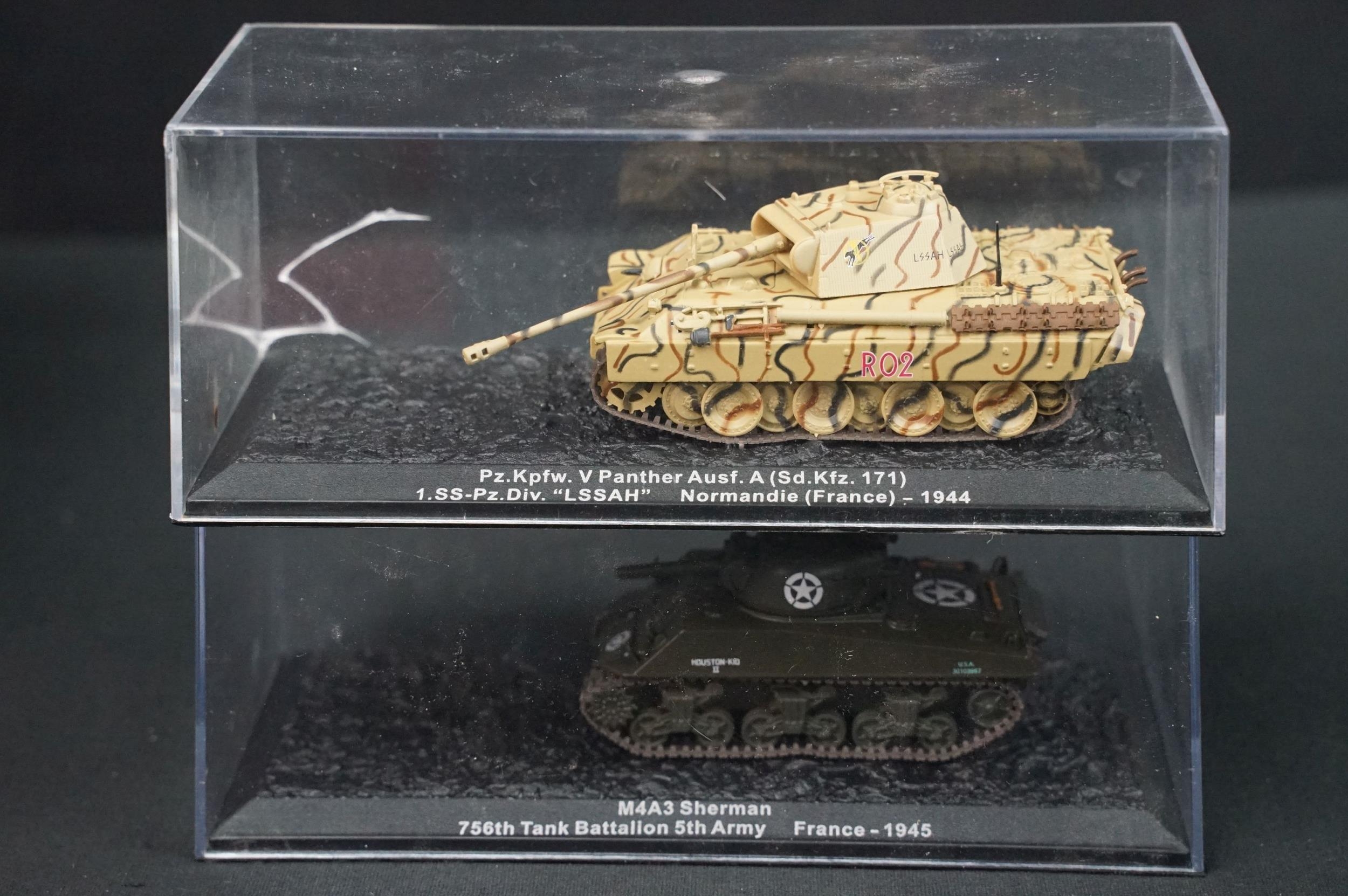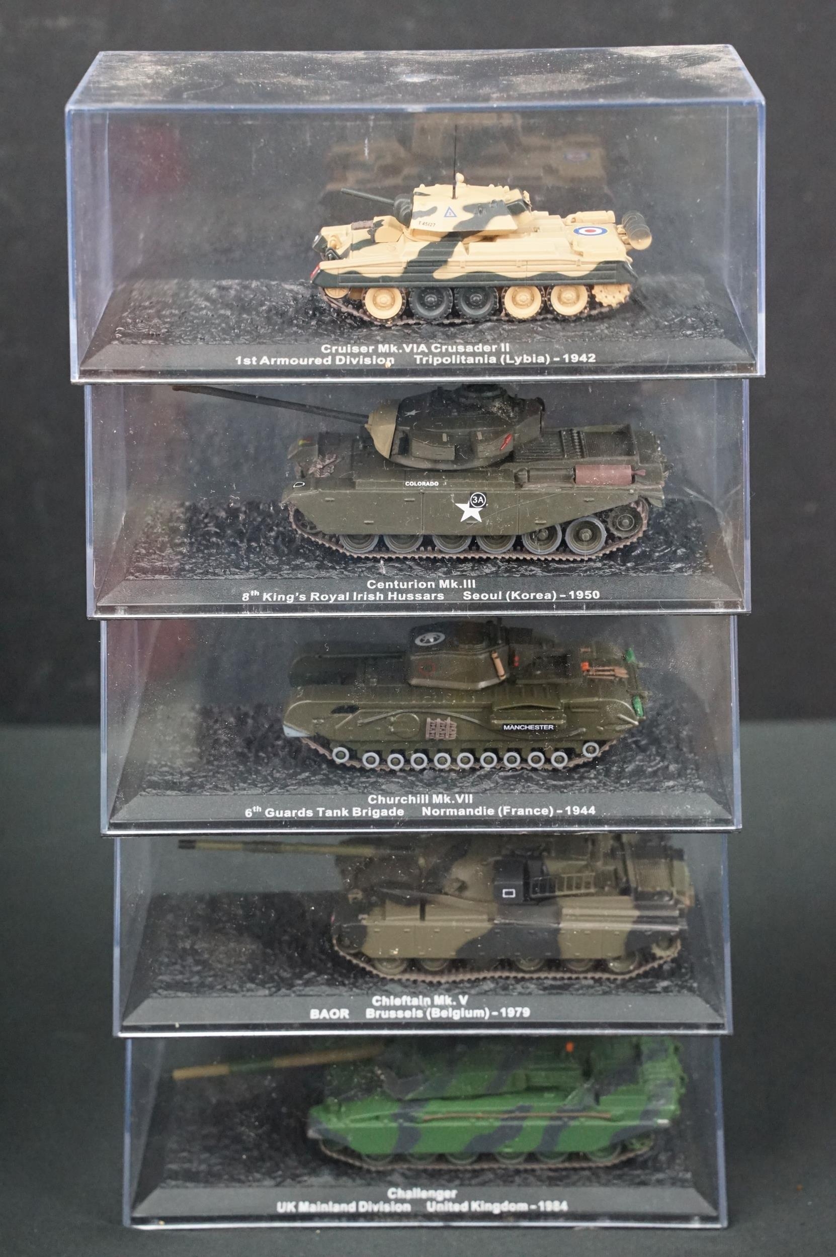 43 Boxed military diecast models to include 37 x cased tanks, 2 x Edison Giocattoli, 1 x Easy Model, Corgi Helicopter Legends AA51907 (ex with dis-colouring and cracks to box) etc, all ex unless stated