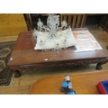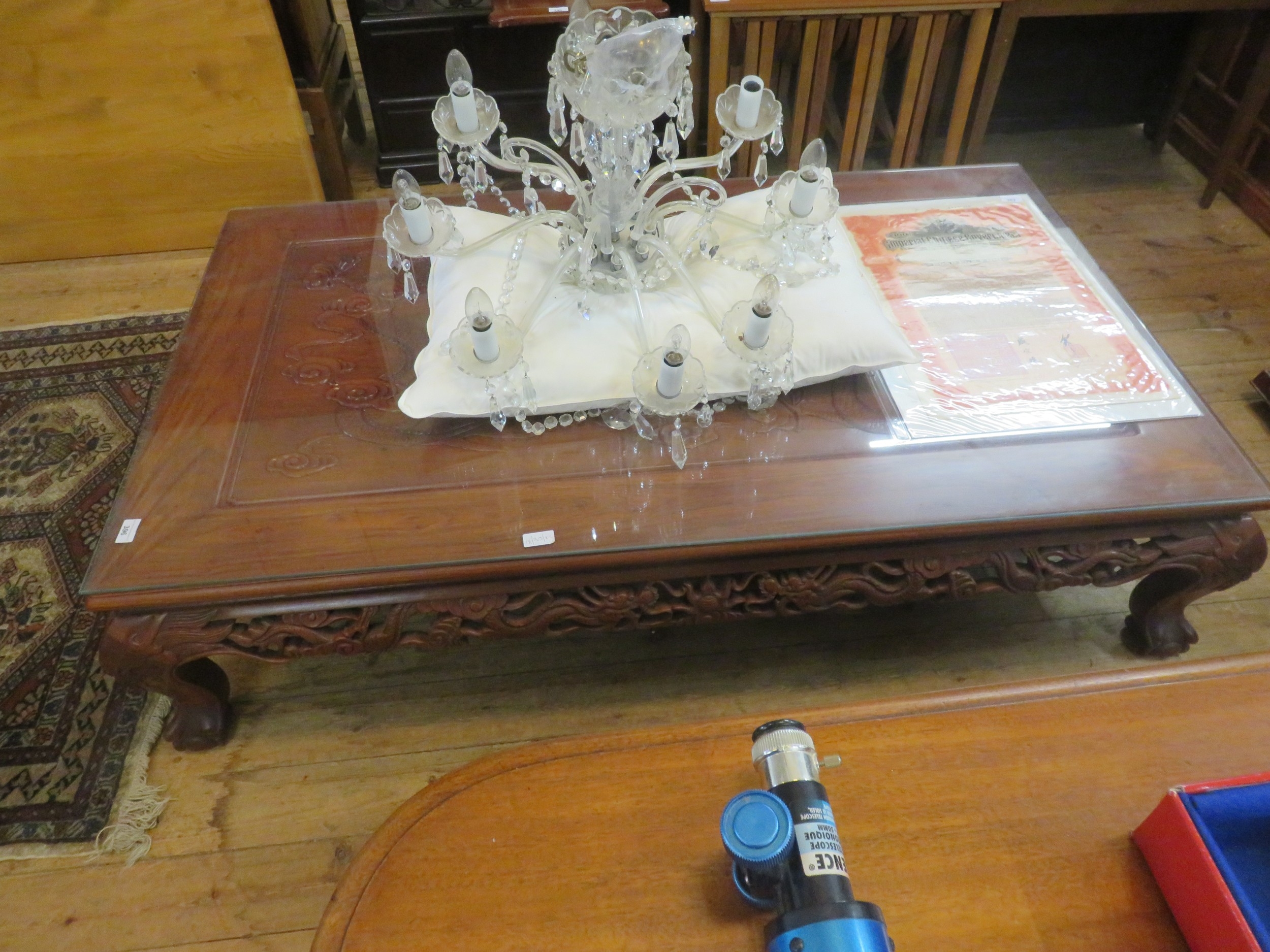 Large carved Chinese opium table , with glass top , 89 cm wide by 148cm long