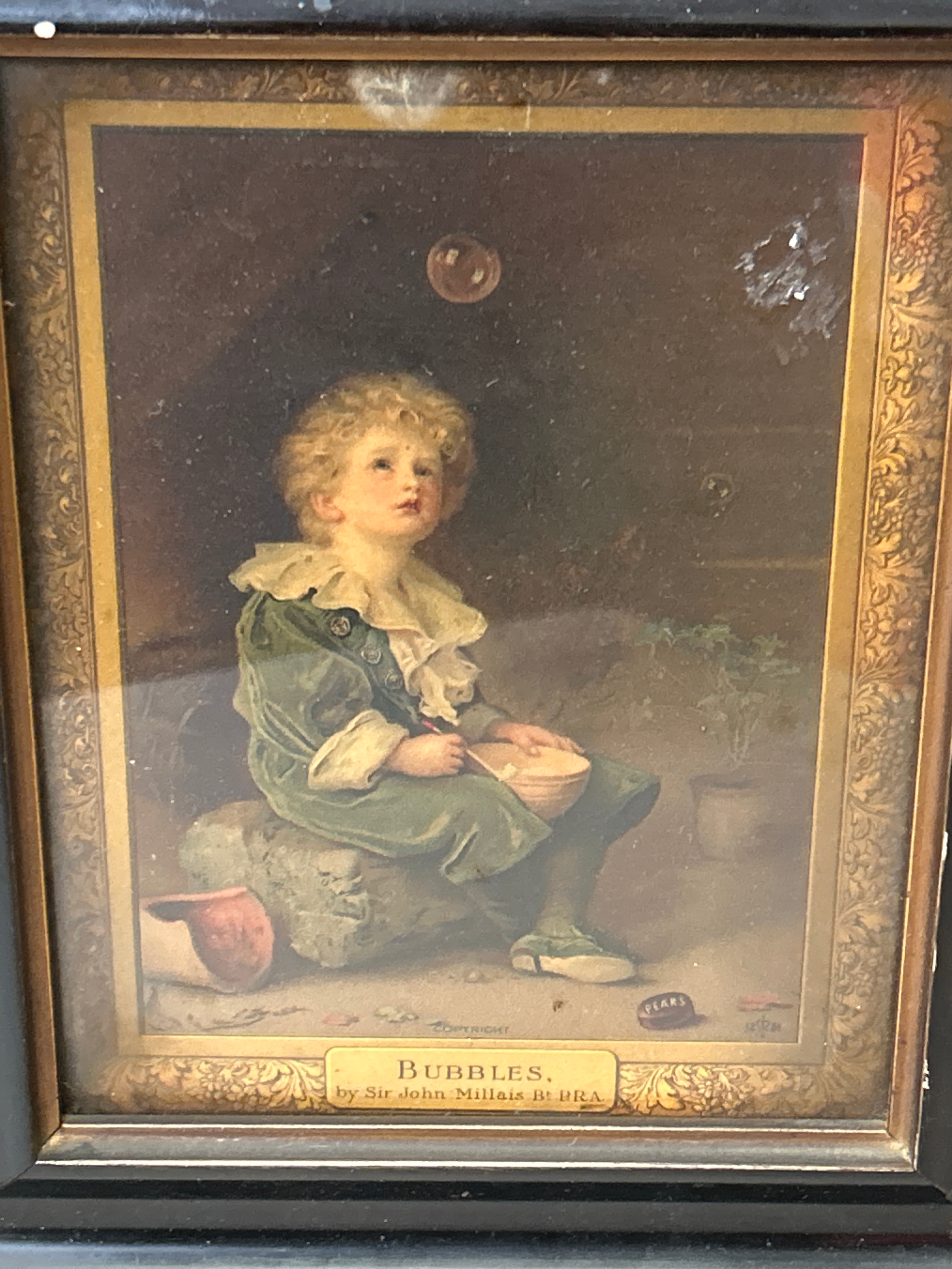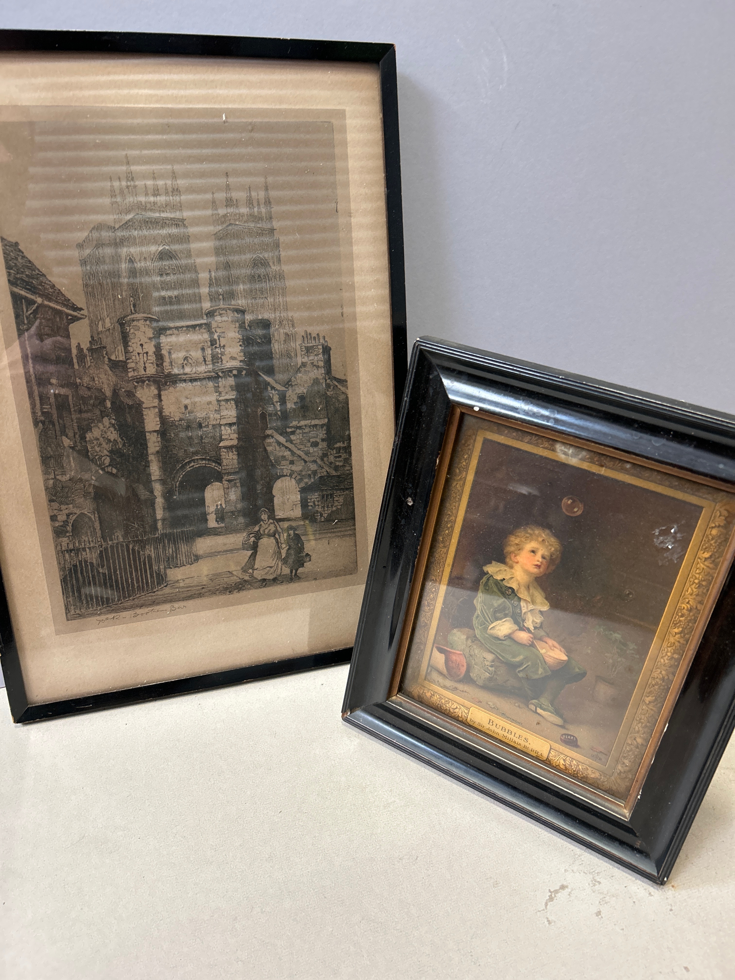 An Edwardian miniature print of Sir John Millais’ “Bubbles” in original ebonised frame. 26cm x 22cm together with an engraving of Bootham Bar, York.