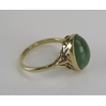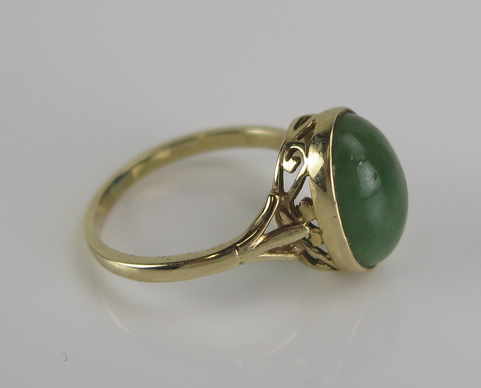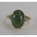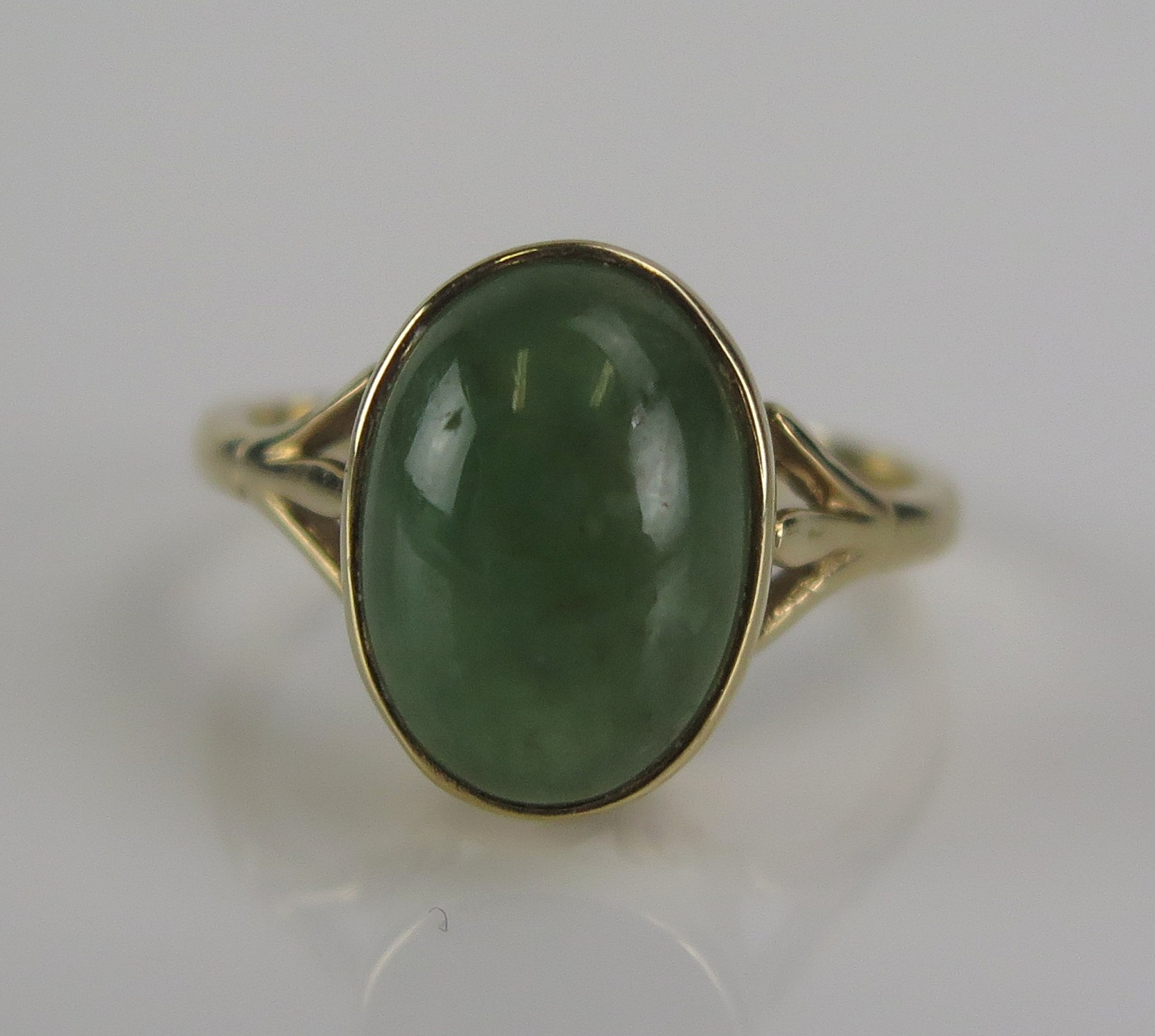 A jade cabochon ring in a 9ct gold setting, 15x11mm head, size S.5, 4.15g