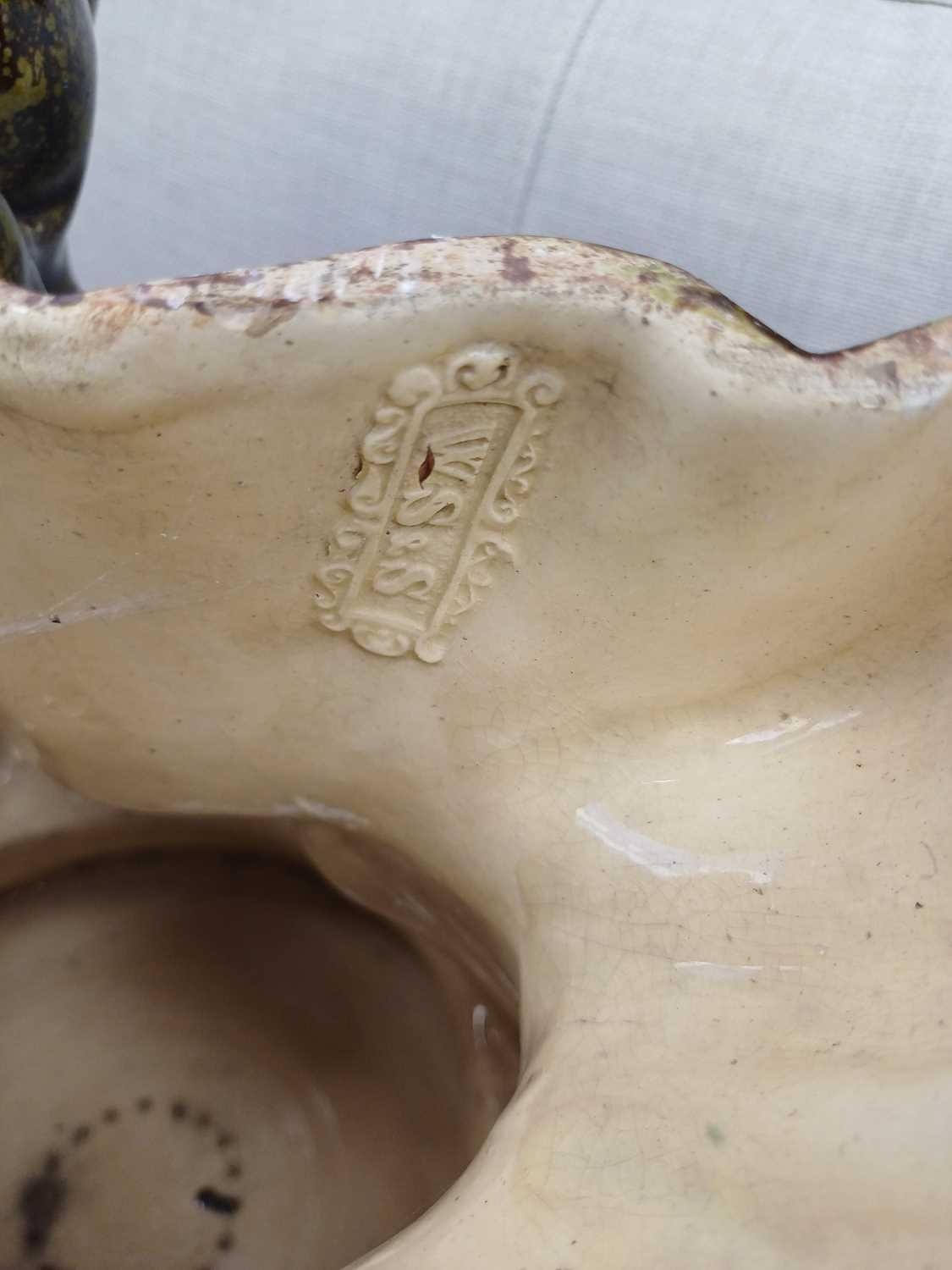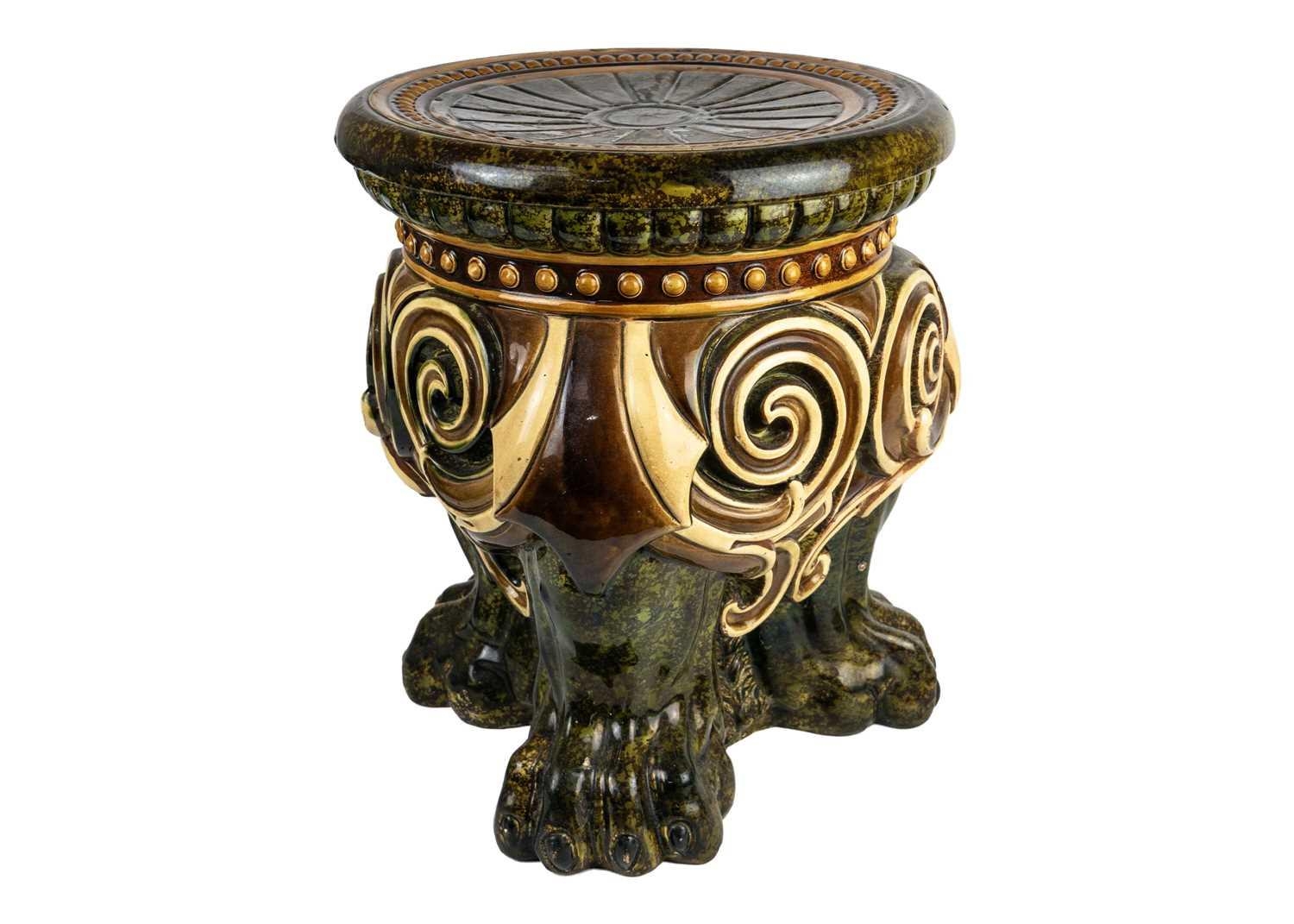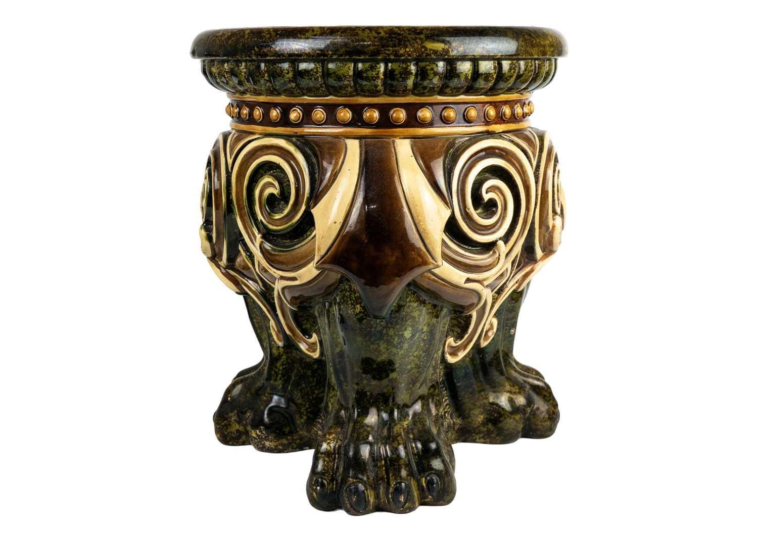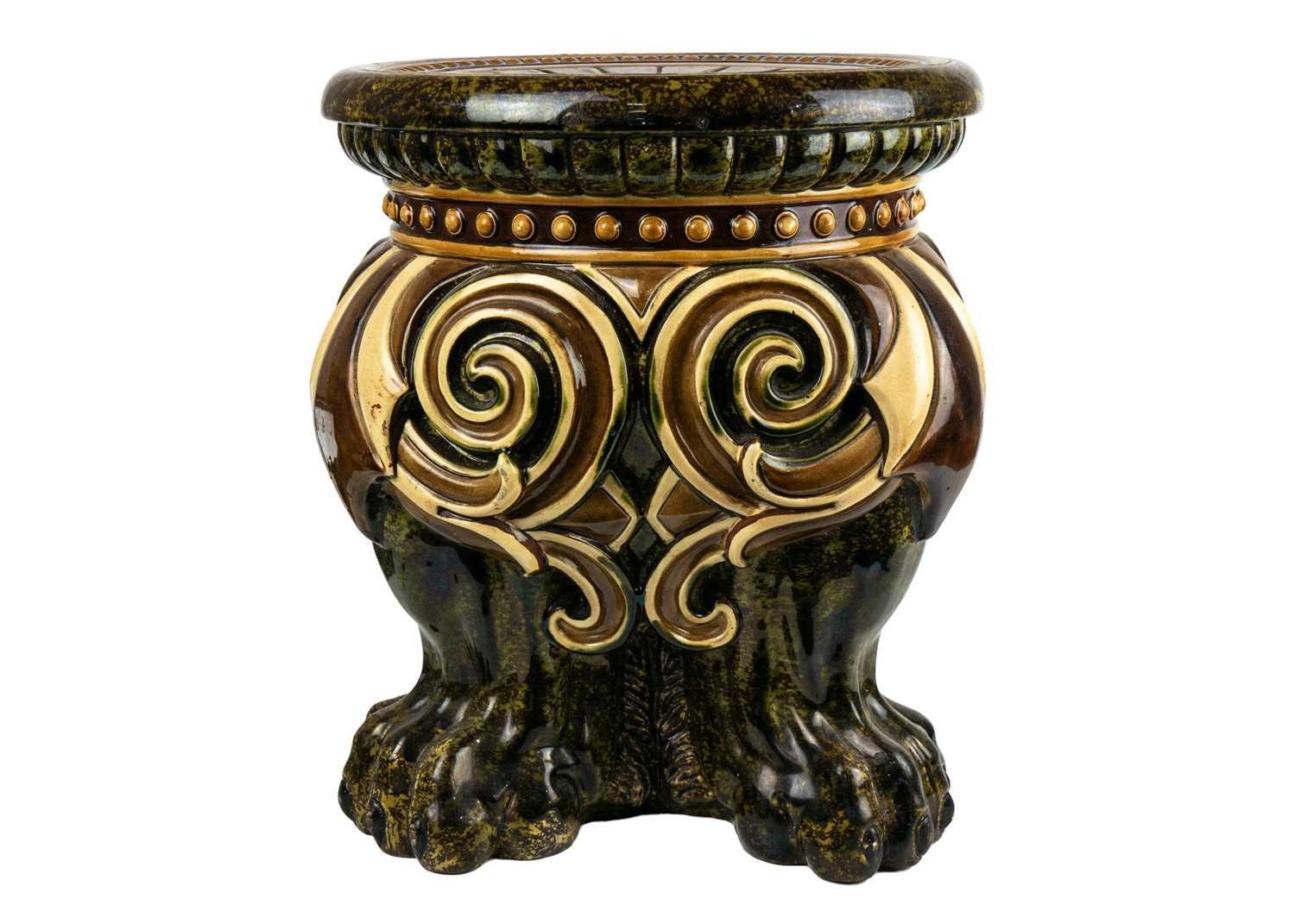 A German majolica stand or garden stool by Wilhelm Schiller and Son. With a gadrooned circular top, on three substantial moulded paw feet, height 43cm, diameter .