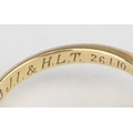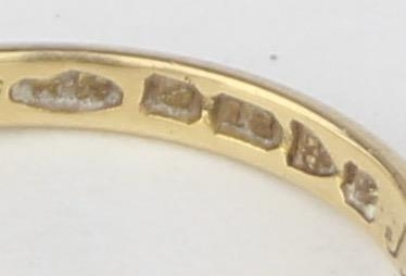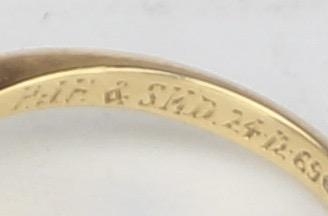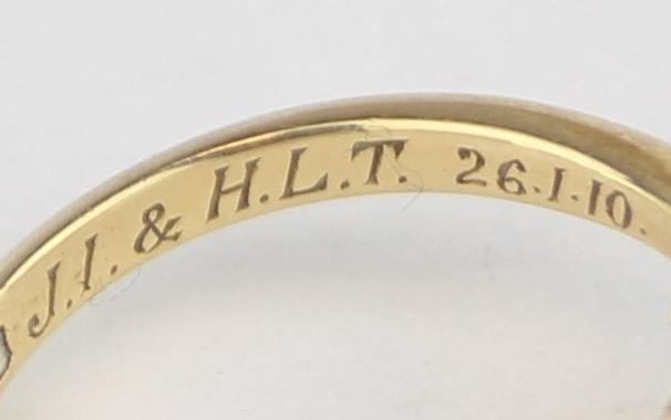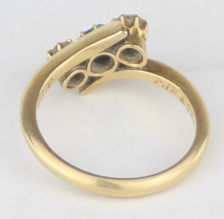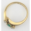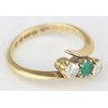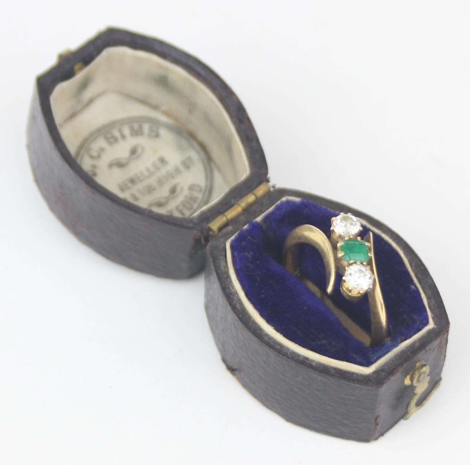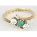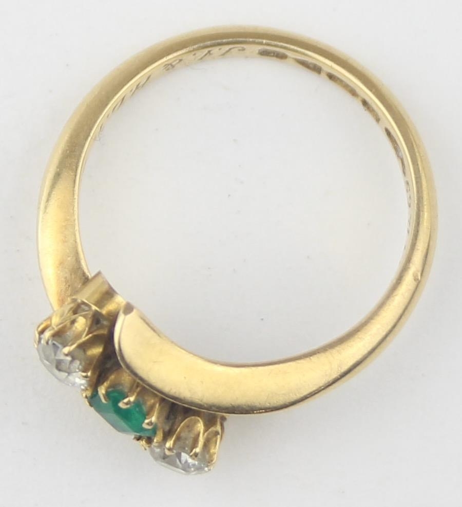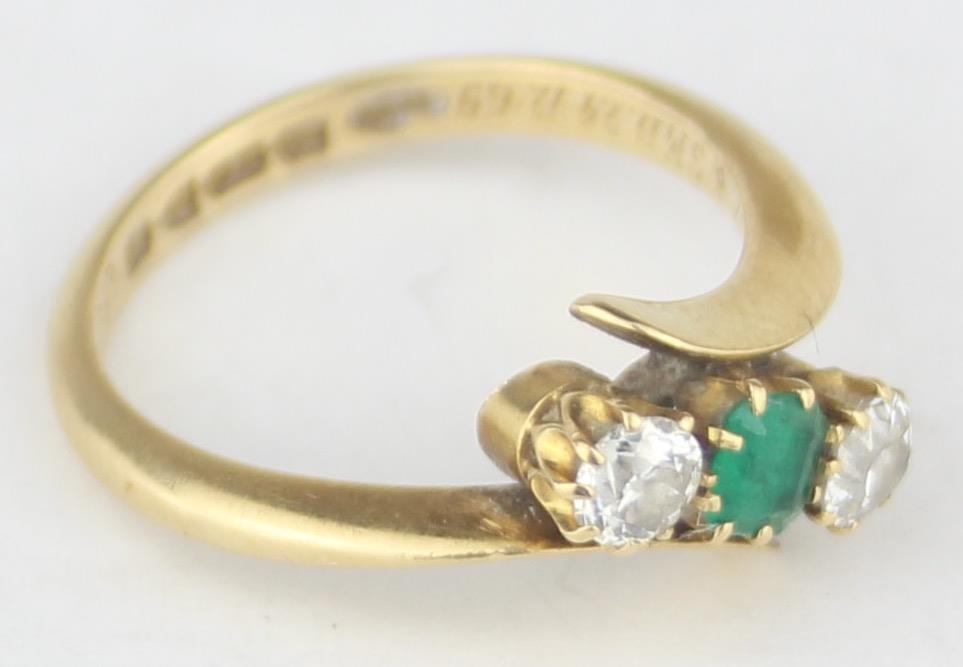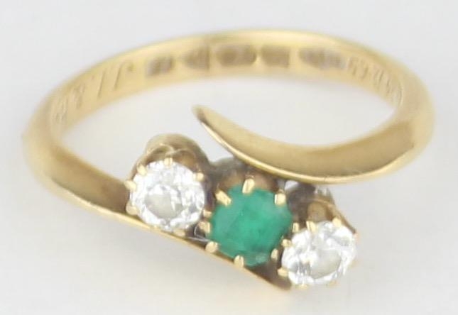 [3.41g, L] - an antique 18ct gold ring with two diamonds flanking an emerald in crossover setting, marked for Chester 1909, the diamonds assessed as 0.25ct each, various engravings to interior, presented in Sims of Watford box