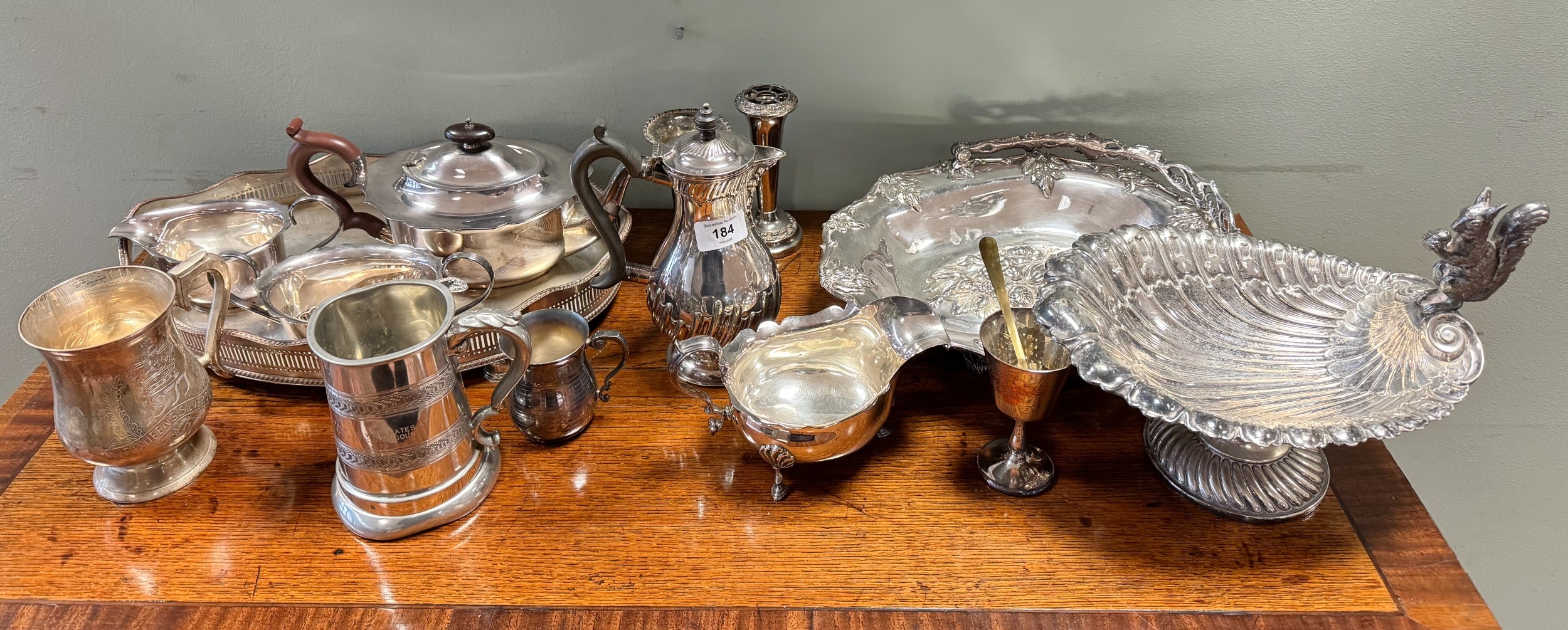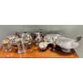 A three piece plated tea set together with tankards, a coffee pot, dishes and other plated items