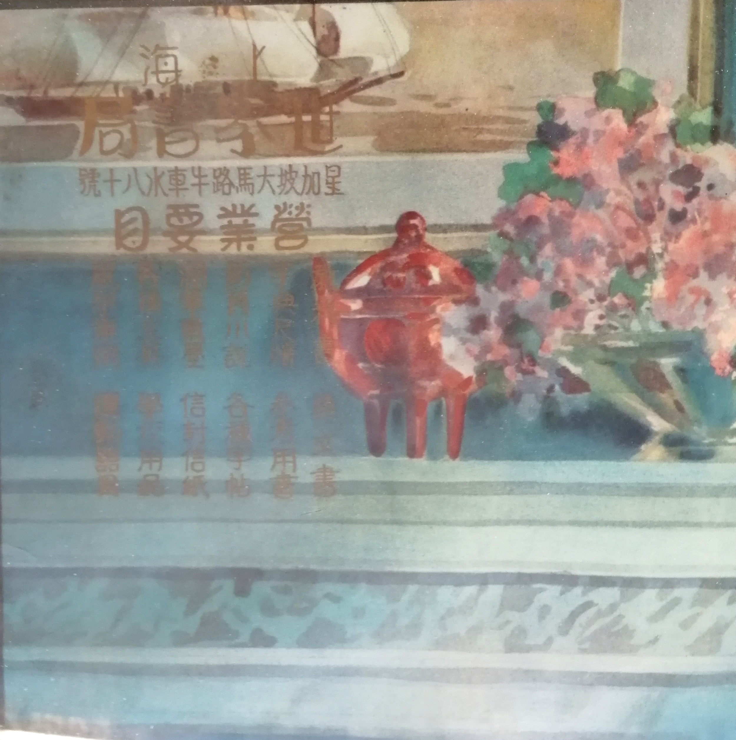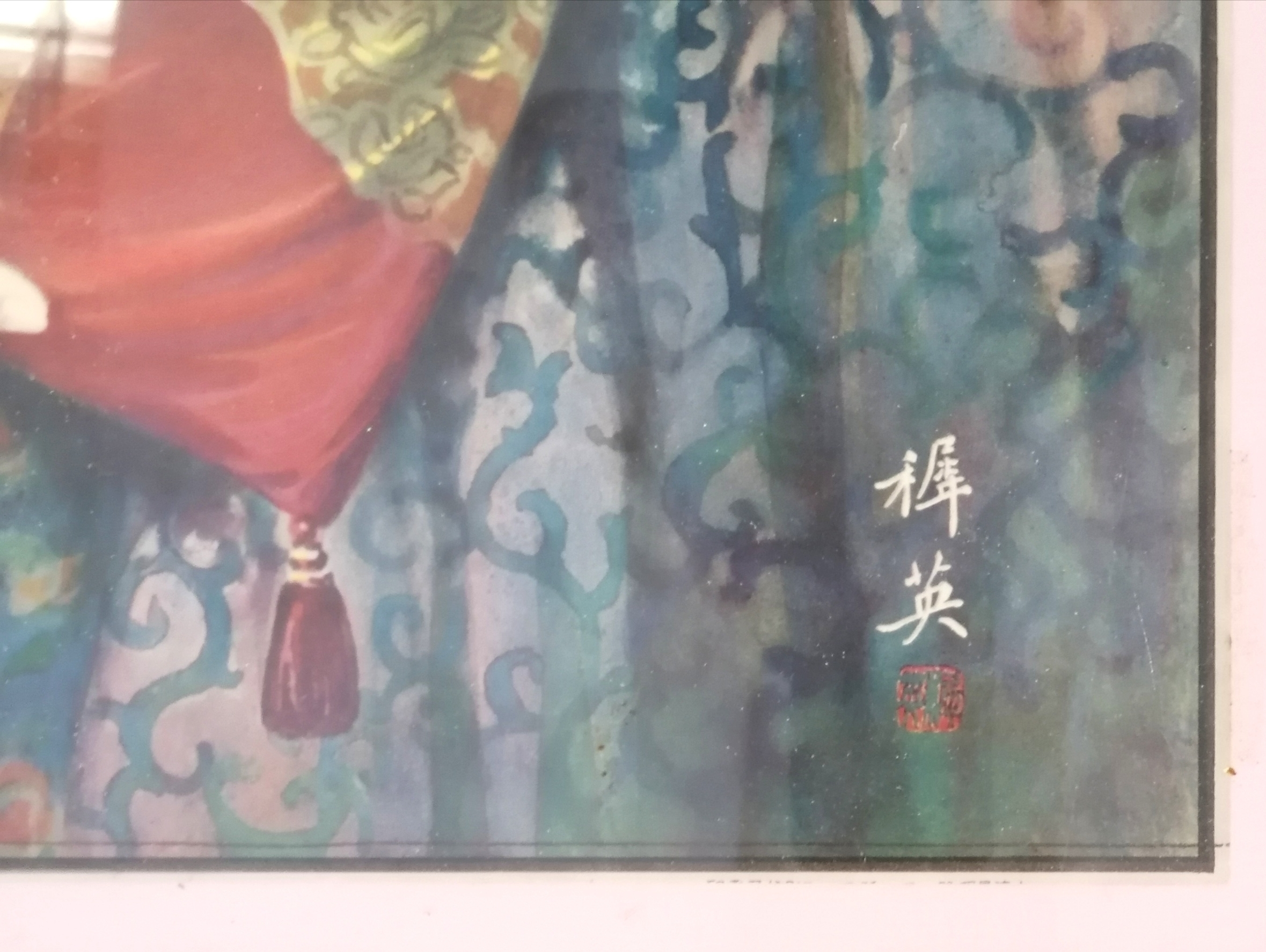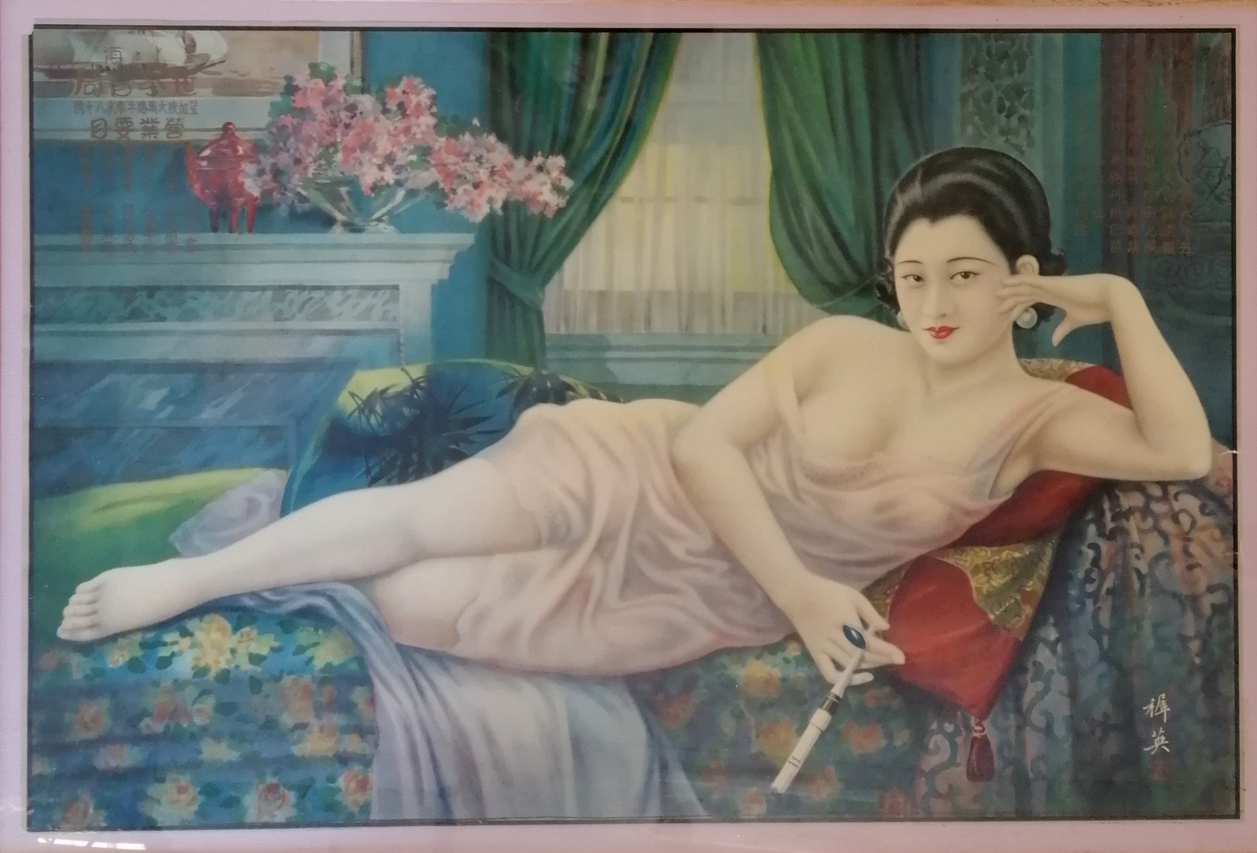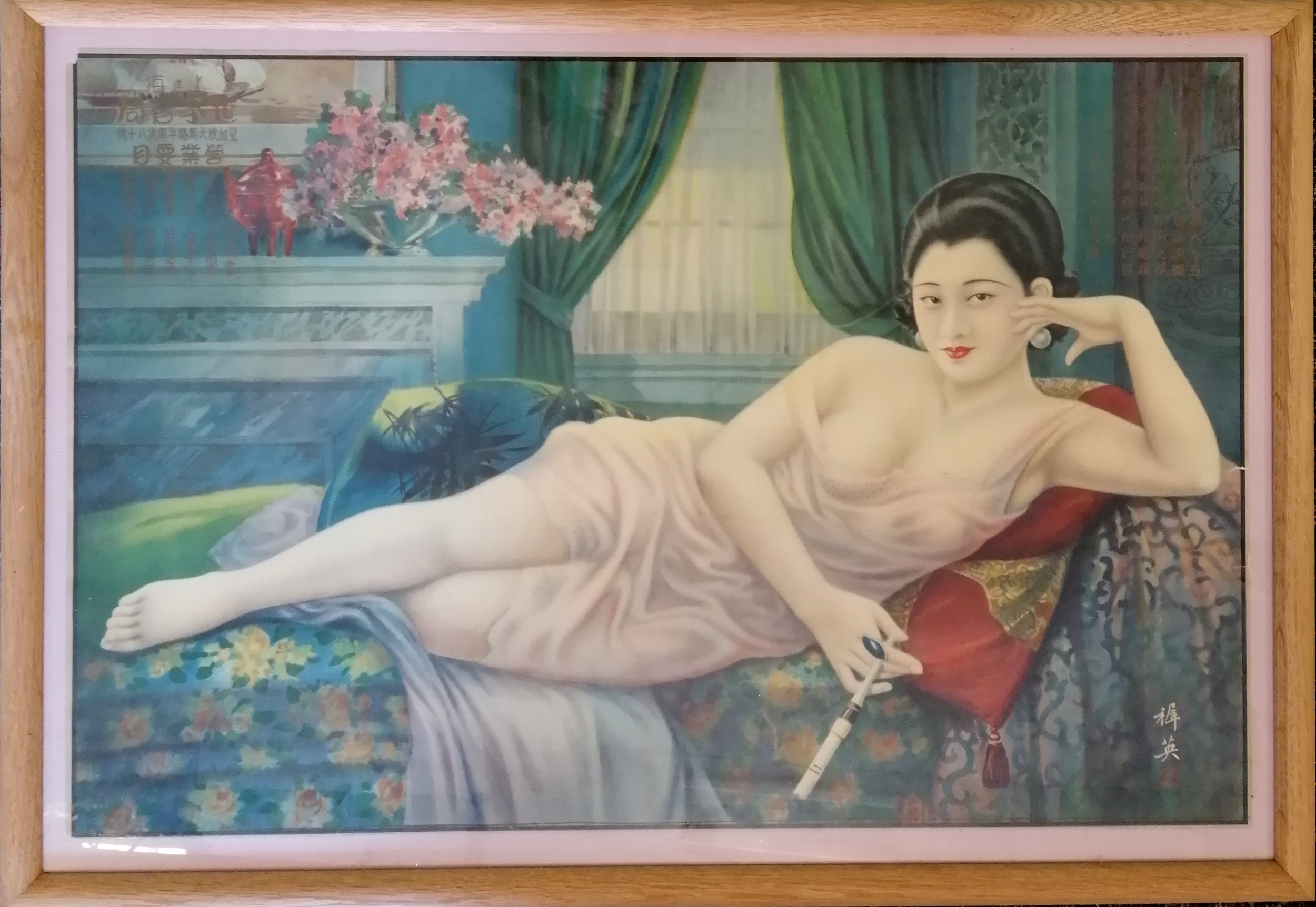 Japanese C1930 framed poster of semi nude reclining female smoking a ciggarette - 85cm x 60cm