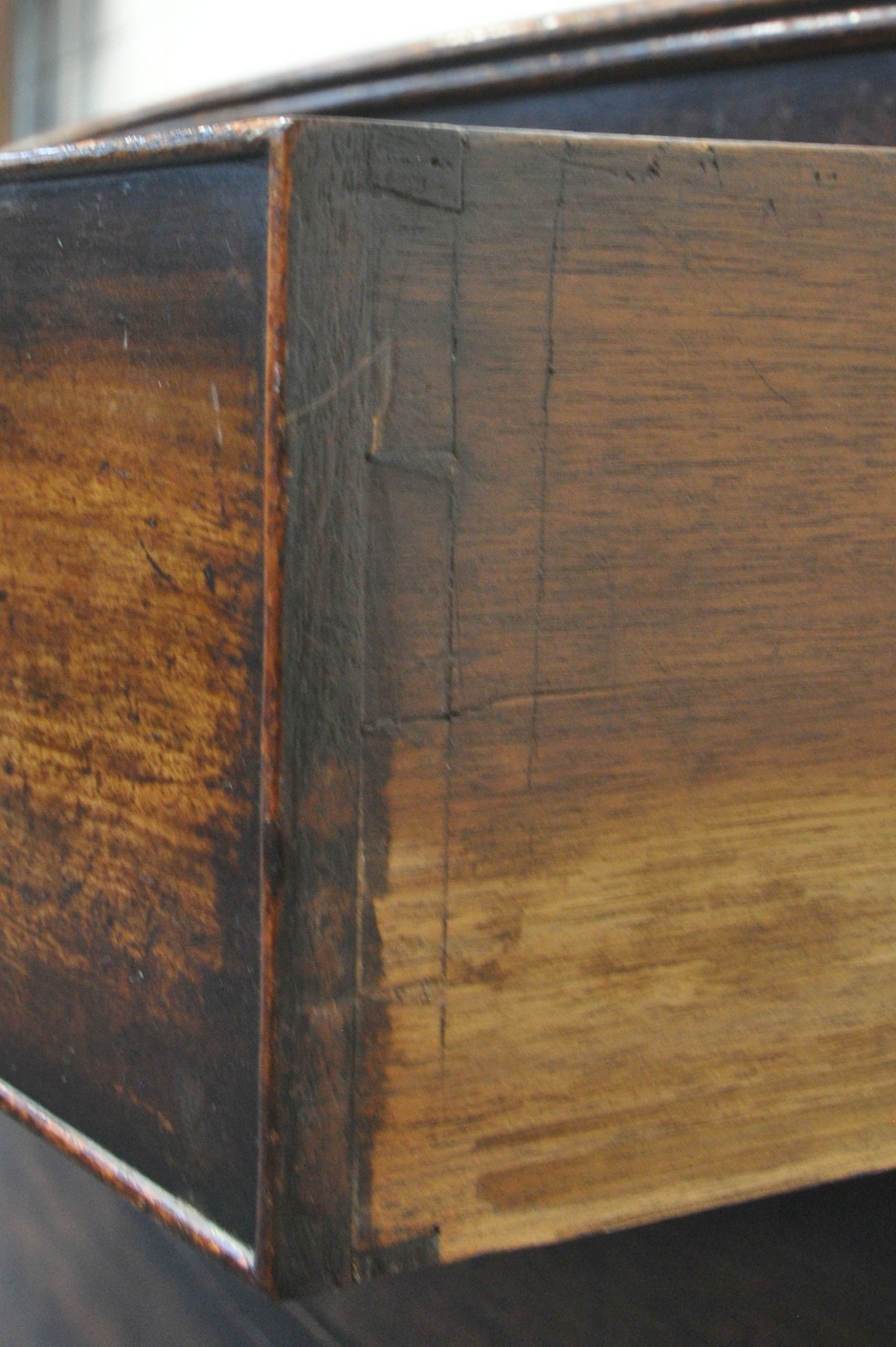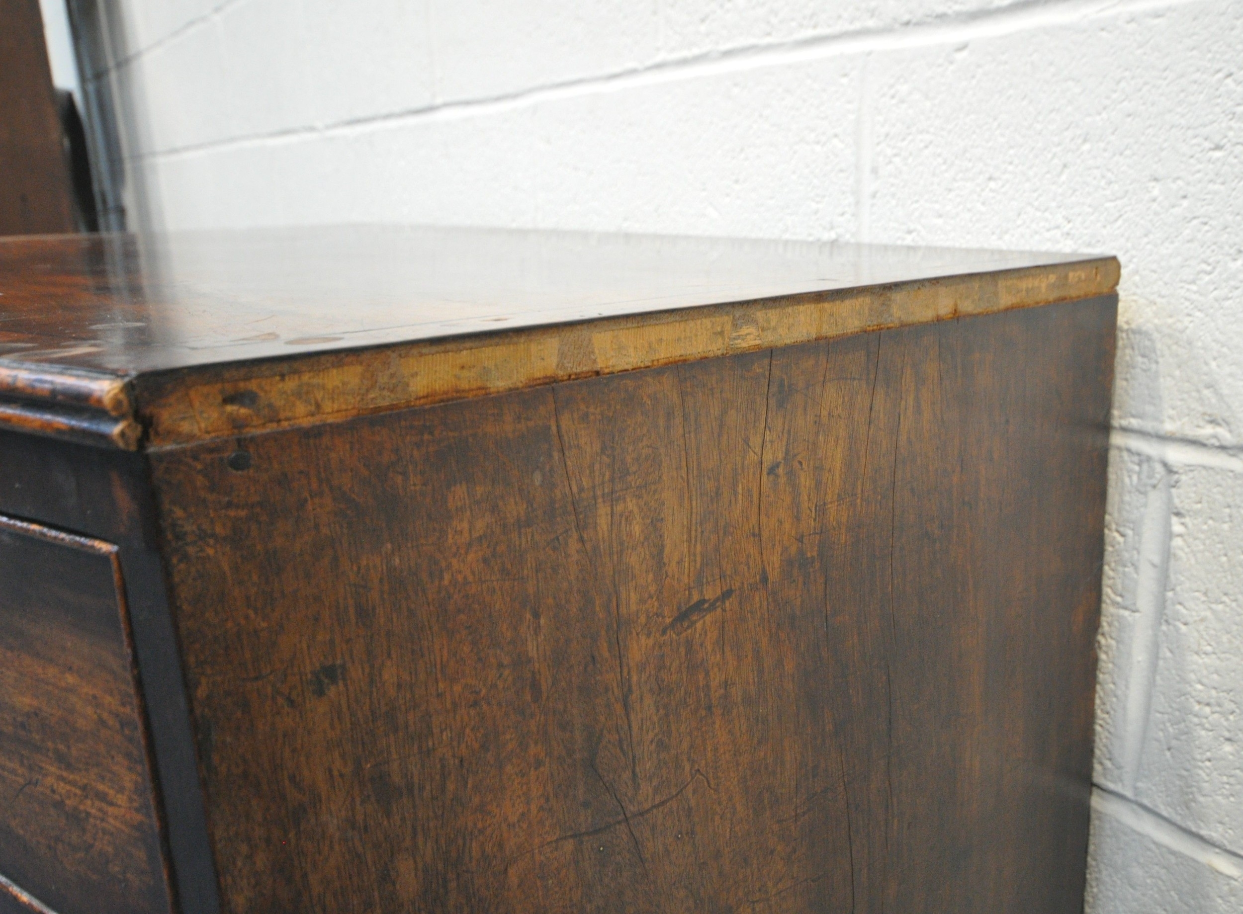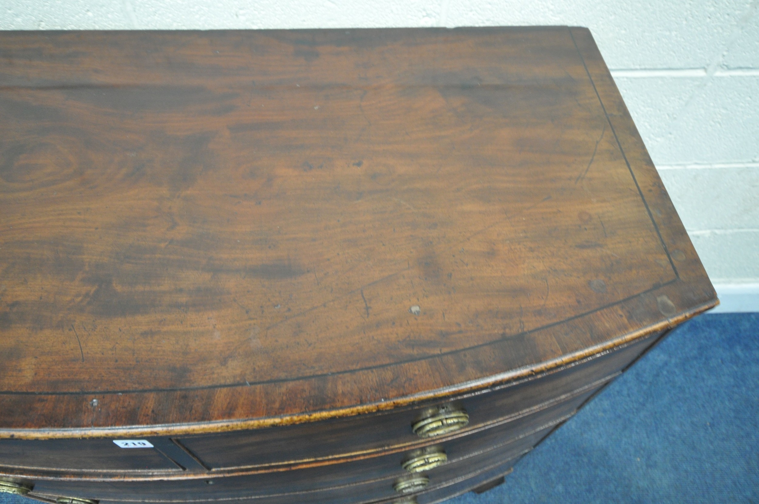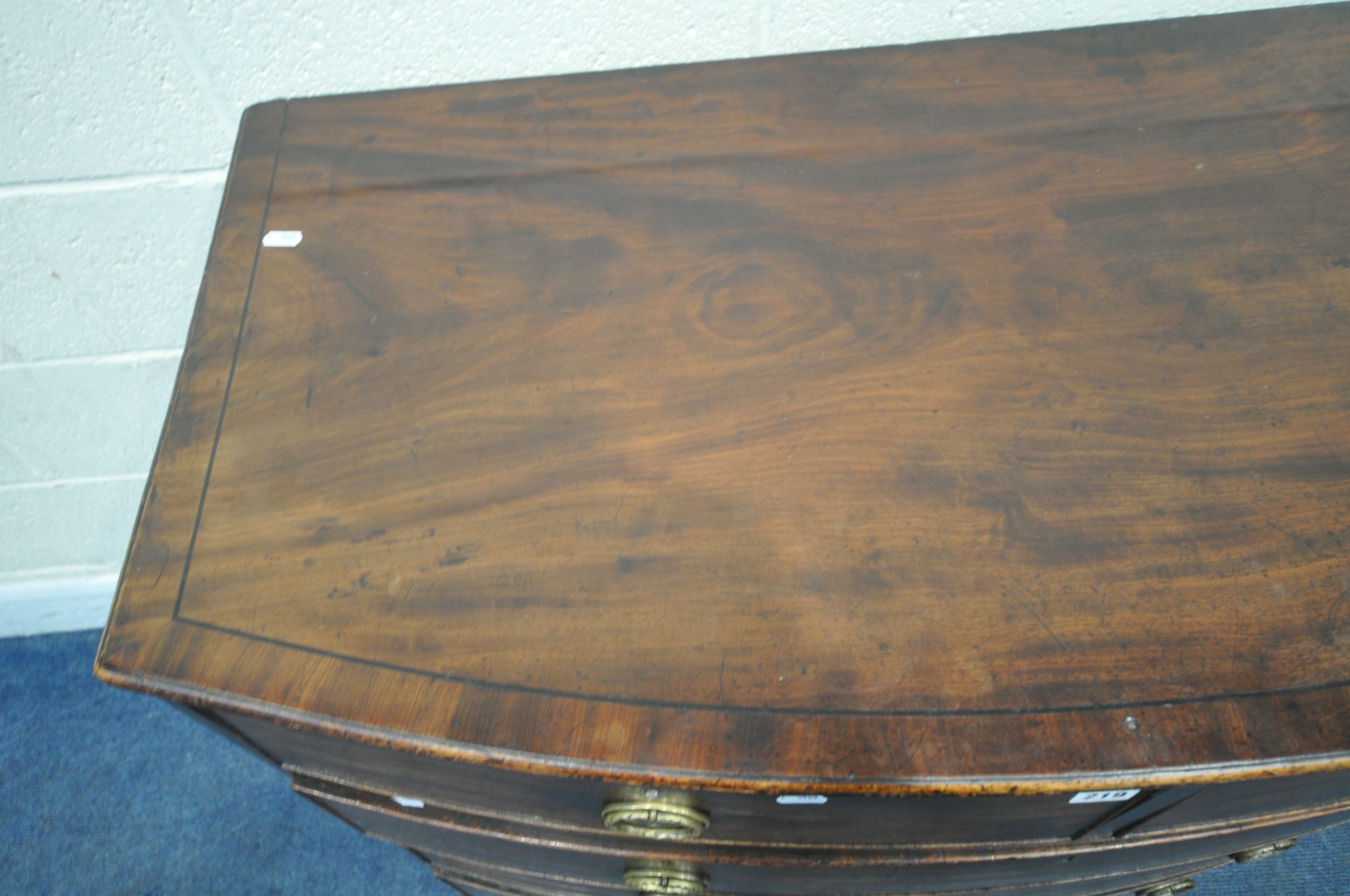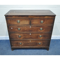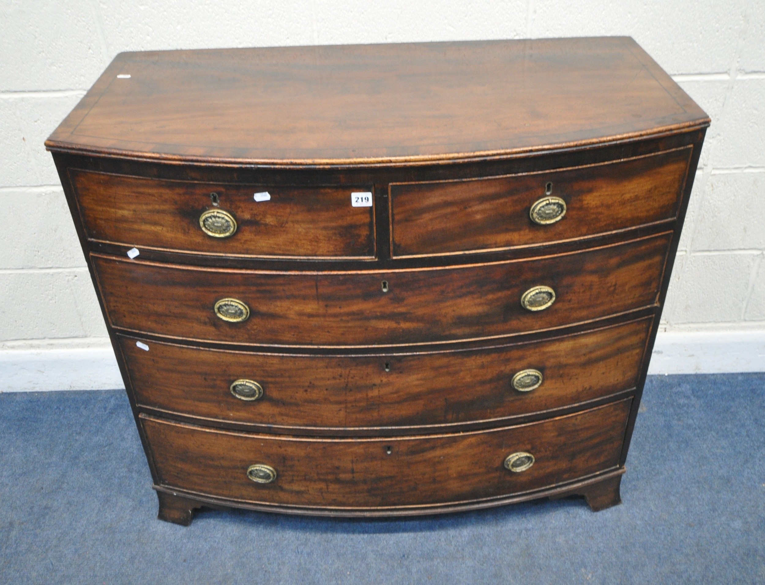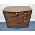 A GEORGIAN MAHOGANY BOW FRONT CHEST OF TWO SHORT OVER THREE GRADUATED DRAWERS, raised on bracket feet, width 107cm x depth 55cm x height 94cm, condition report: historical marks, scuffs, stains, discolouration, loose and missing beading, other historical wear and usage