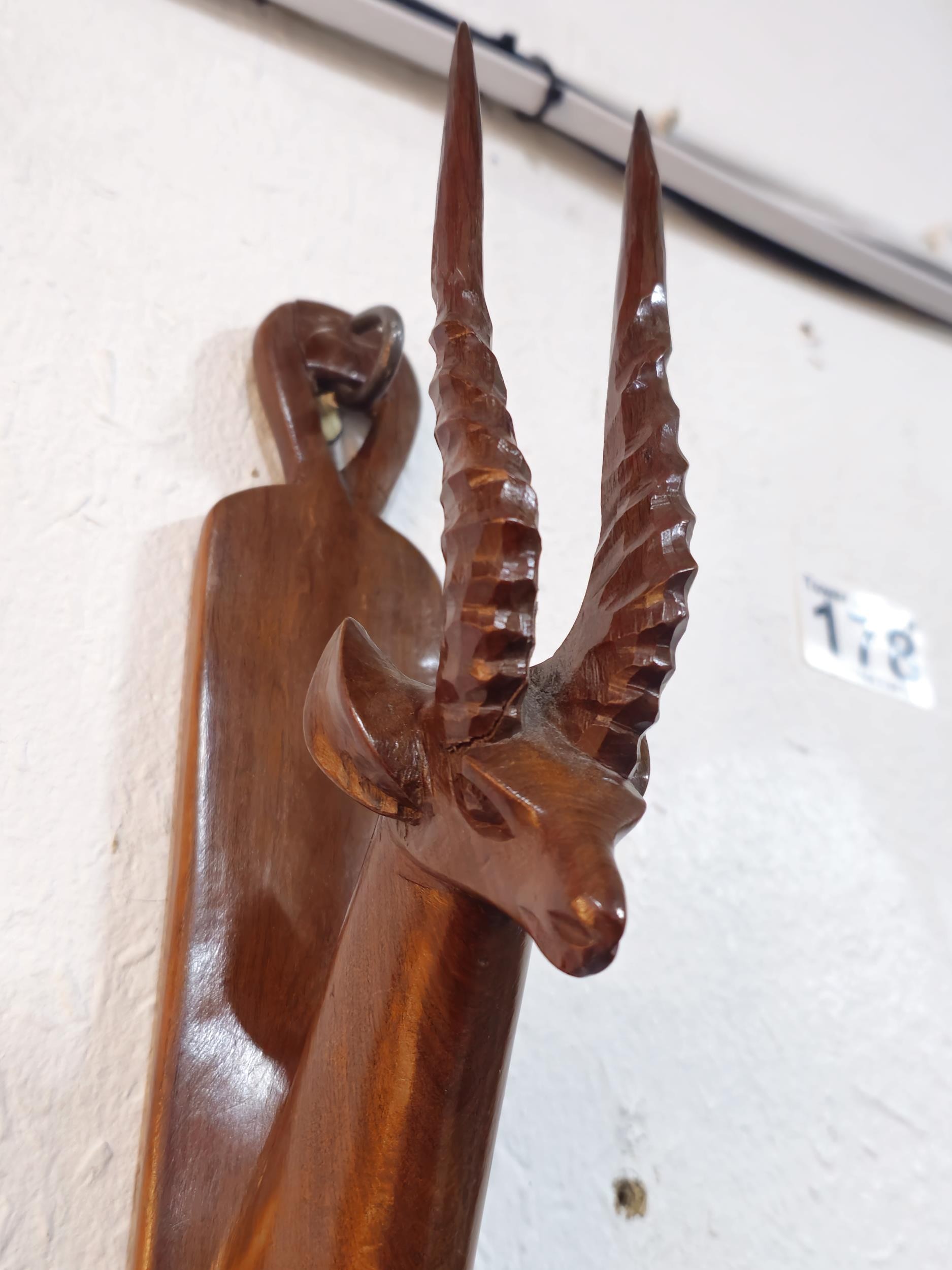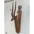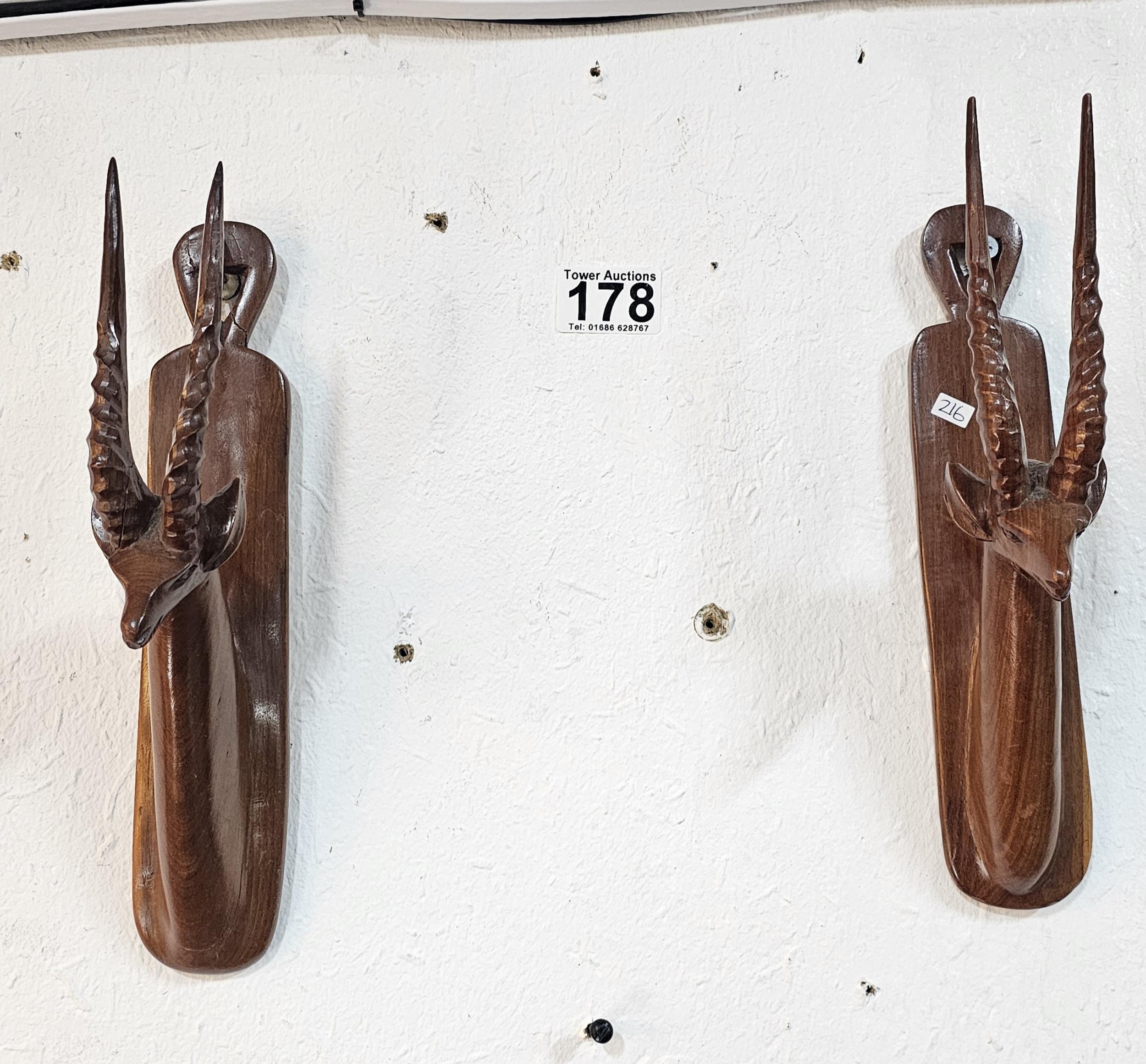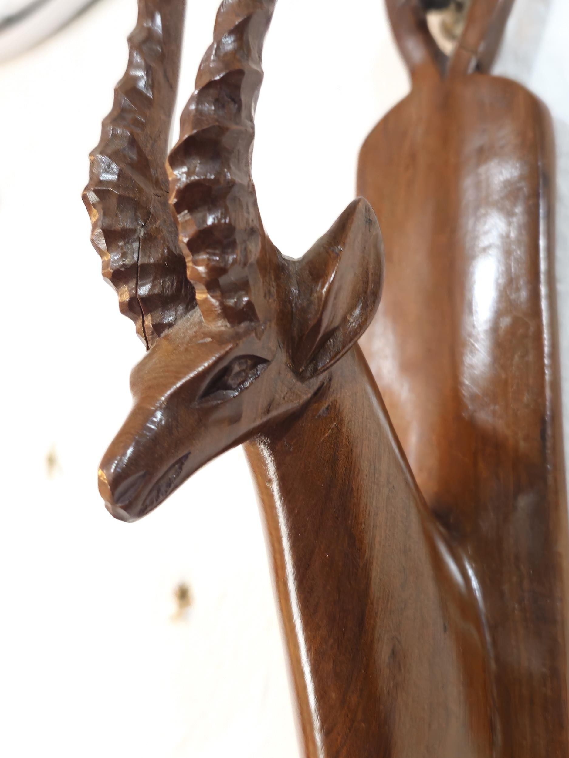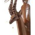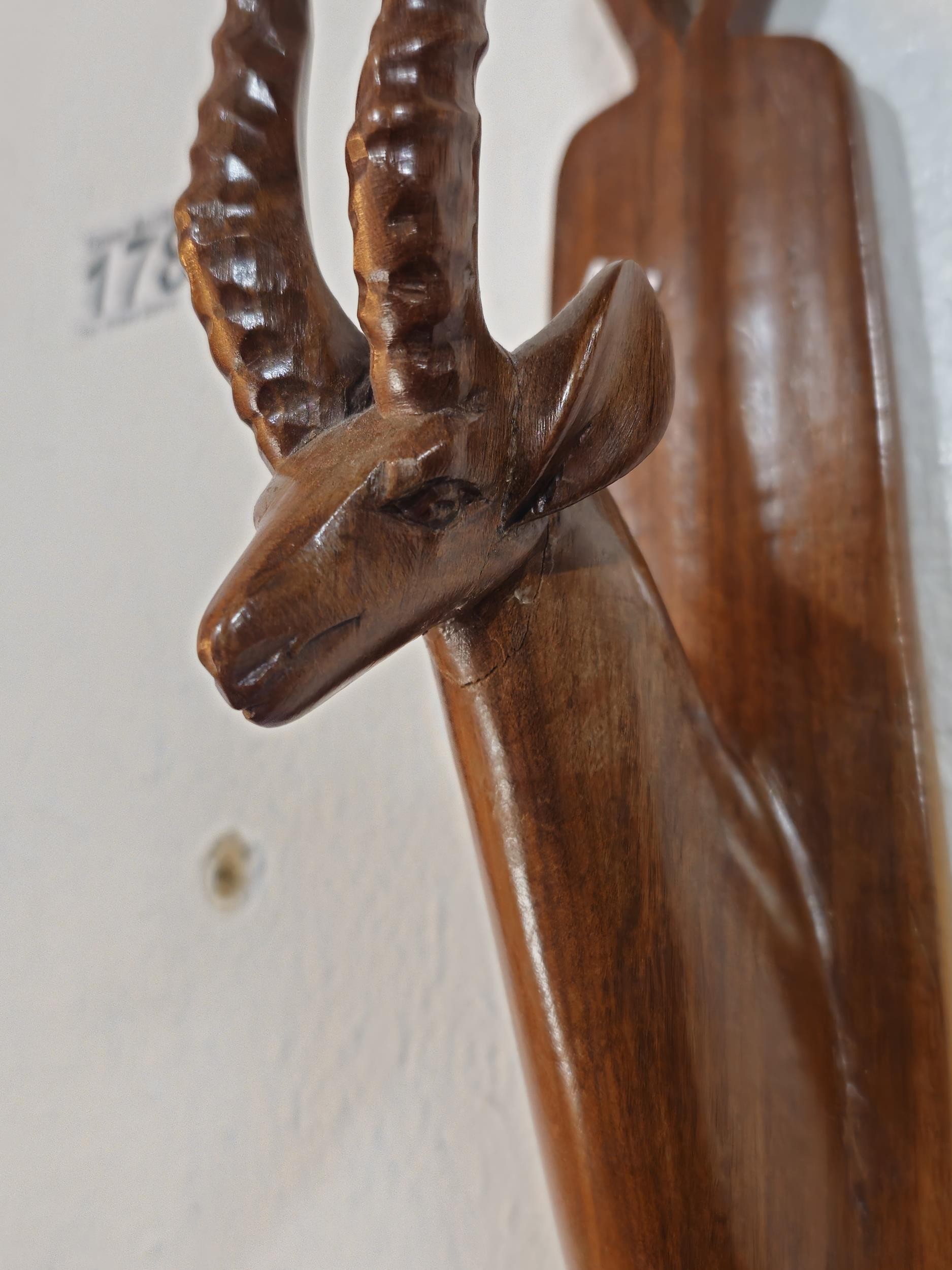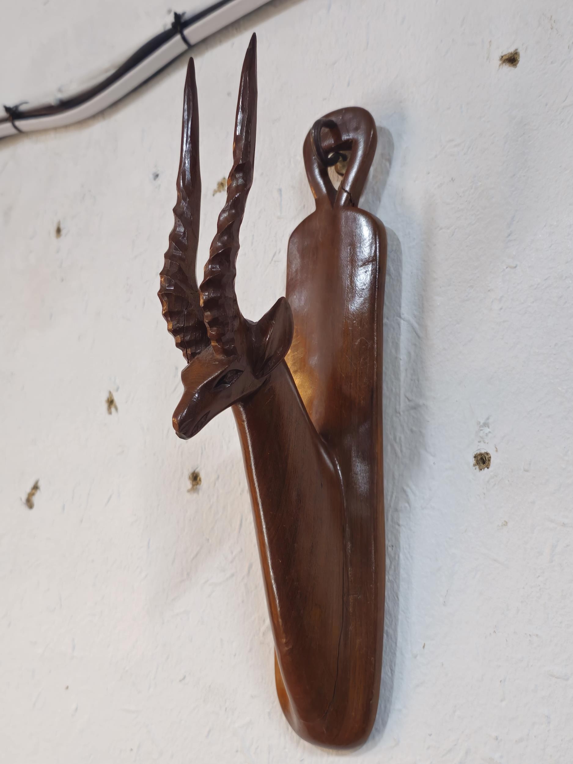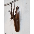 A pair of antique hand carved antelope wall hangers made out of a solid piece of wood, the antelope head is well carved with attention to detail, a very tactile piece. They have a height of 27cm with a width of 5cm.
