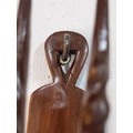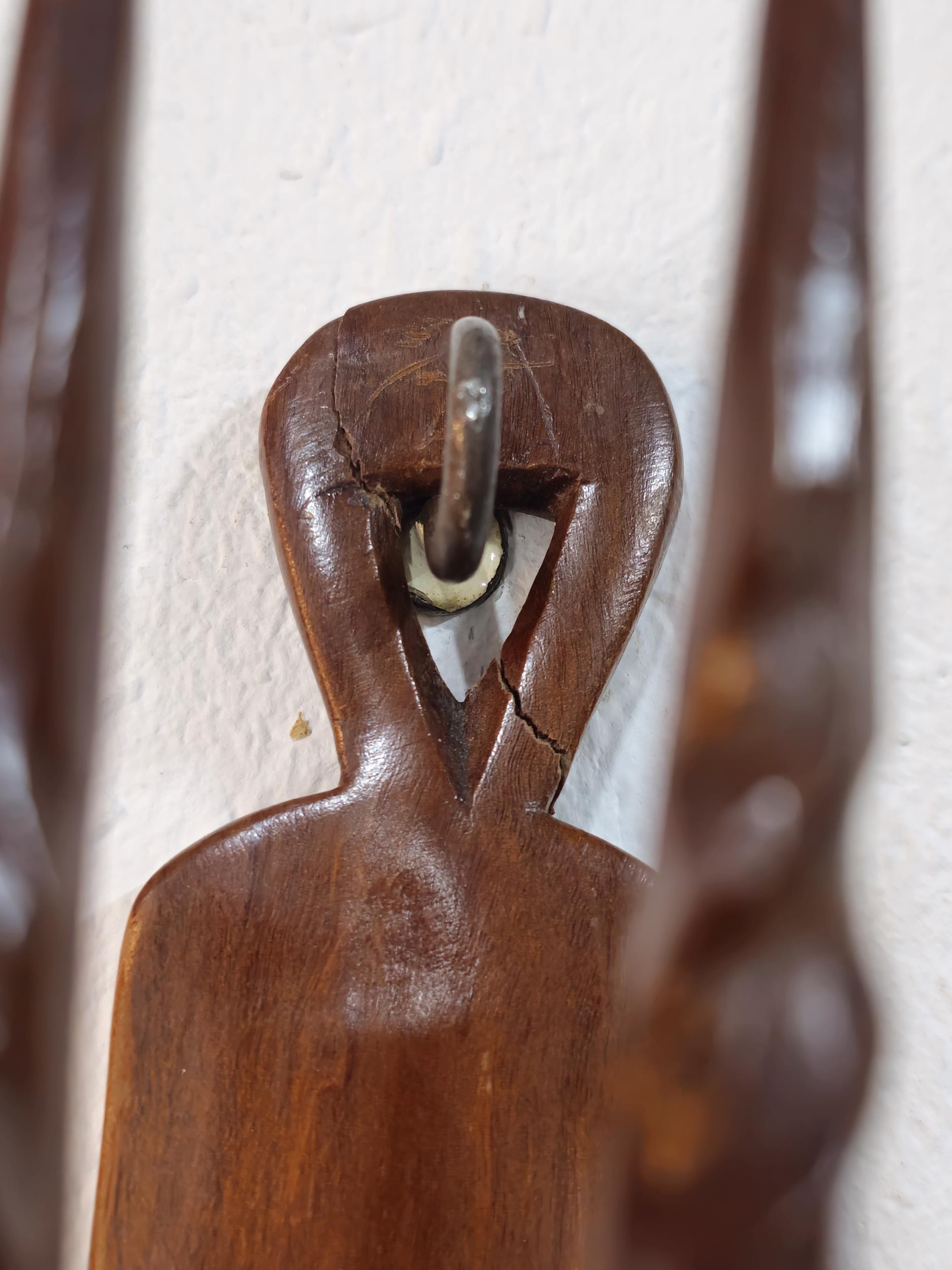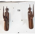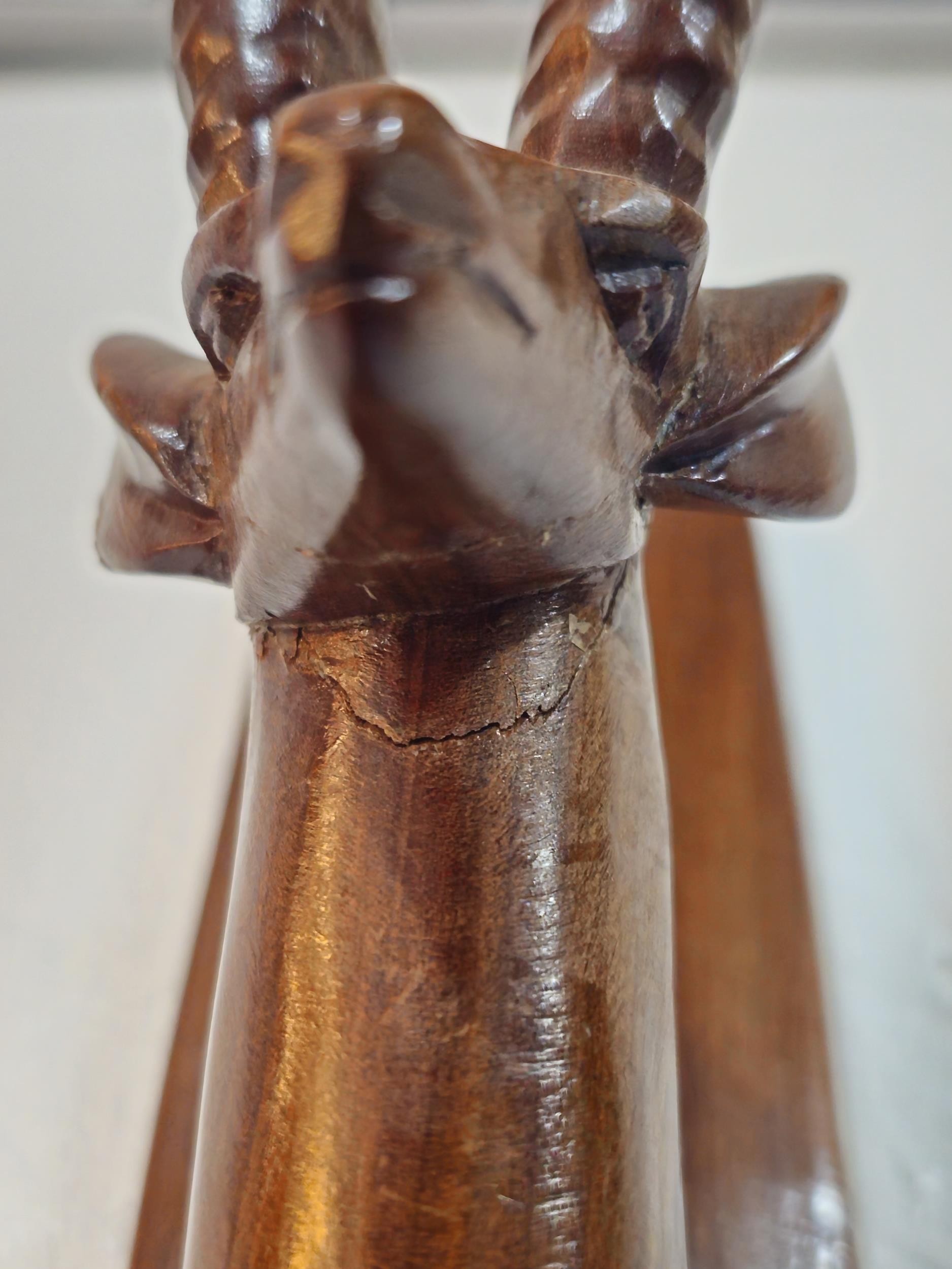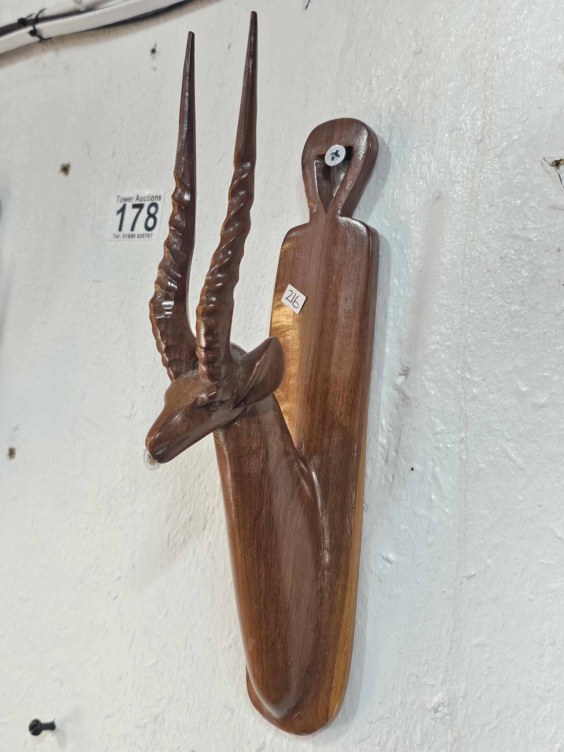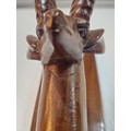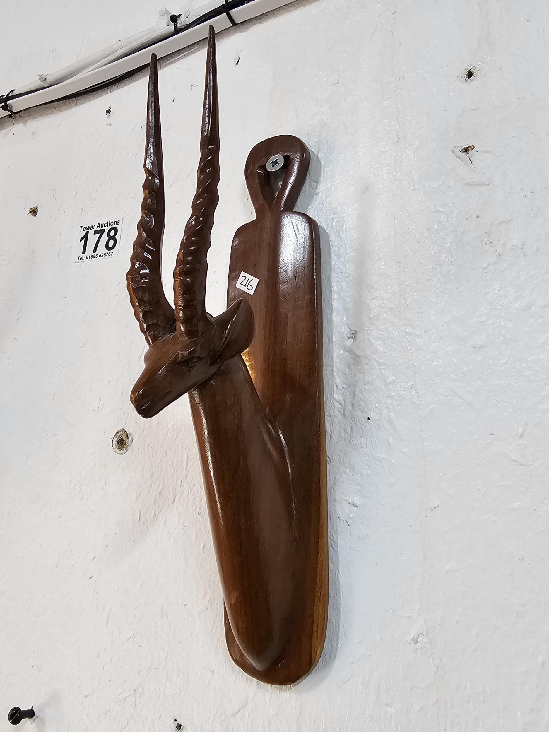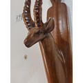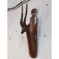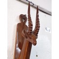A pair of antique hand carved antelope wall hangers made out of a solid piece of wood, the antelope head is well carved with attention to detail, a very tactile piece. They have a height of 27cm with a width of 5cm.