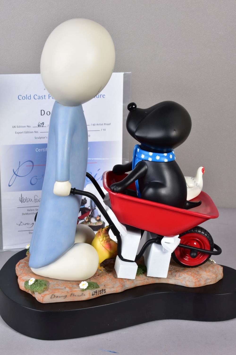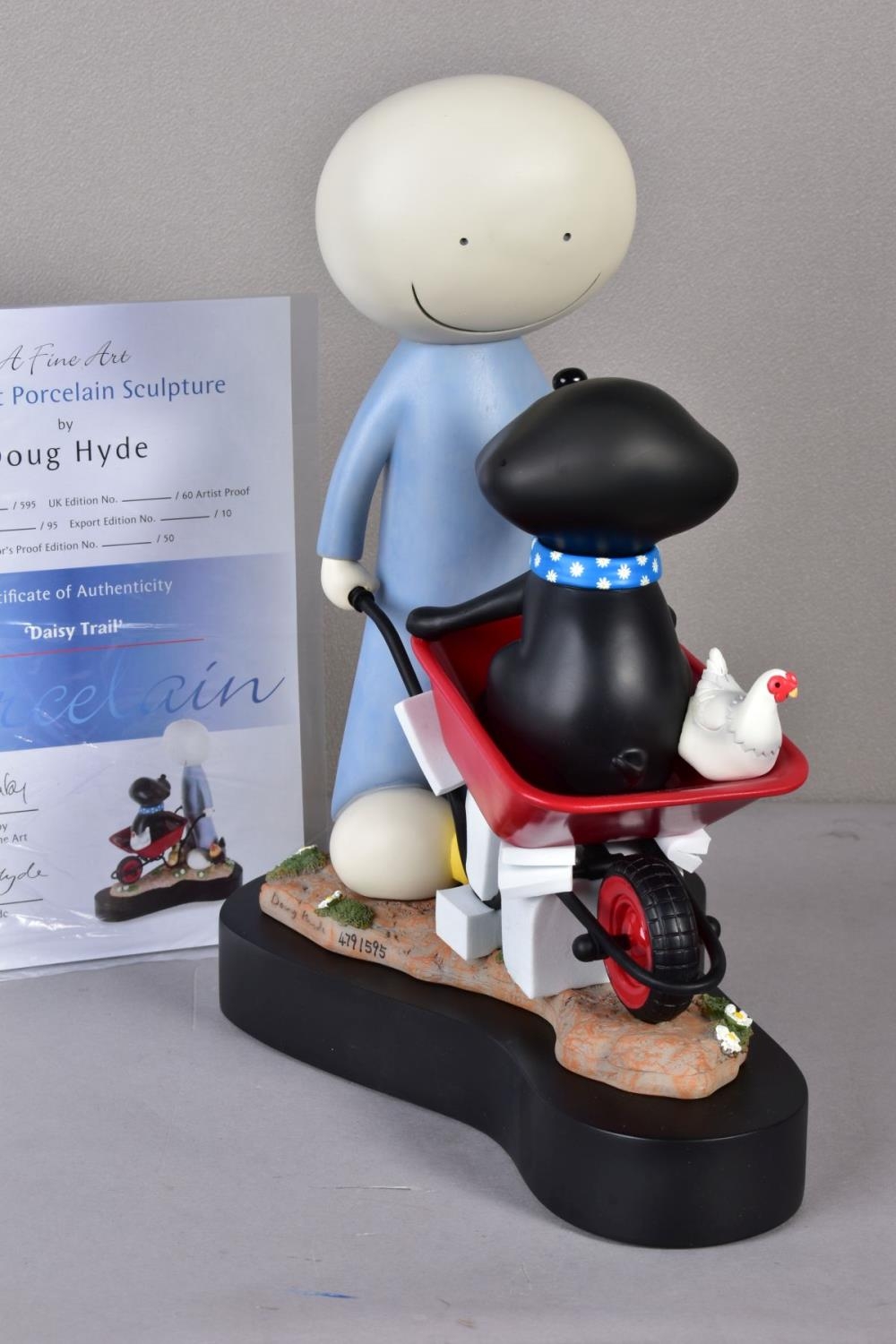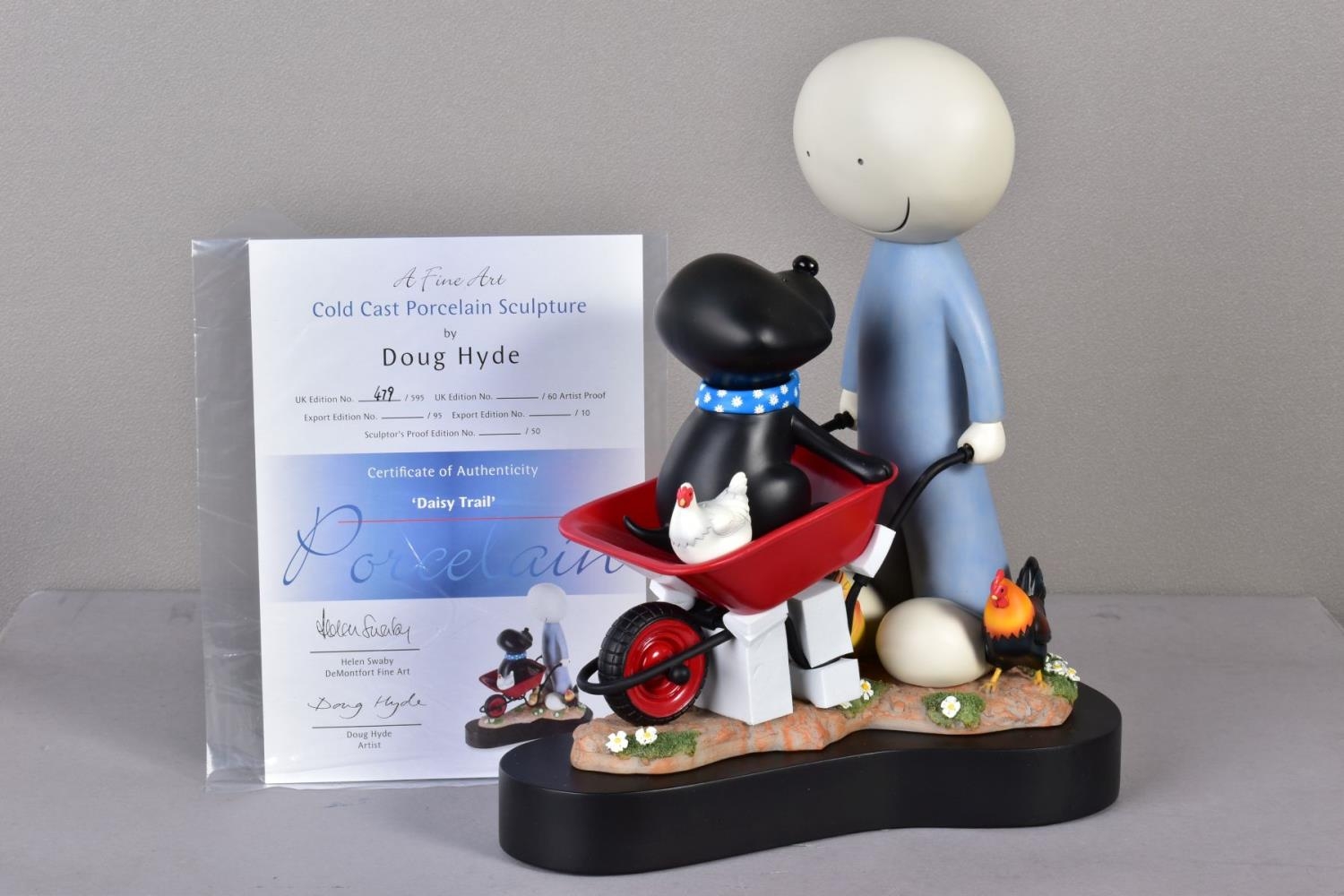 DOUG HYDE (BRITISH 1972) 'DAISY TRAIL' a limited edition cold cast porcelain sculpture of a figure pushing a dog in a wheelbarrow 479/595, impressed signature, with certificate and box, approximate height 29cm (condition:- undamaged) (A)