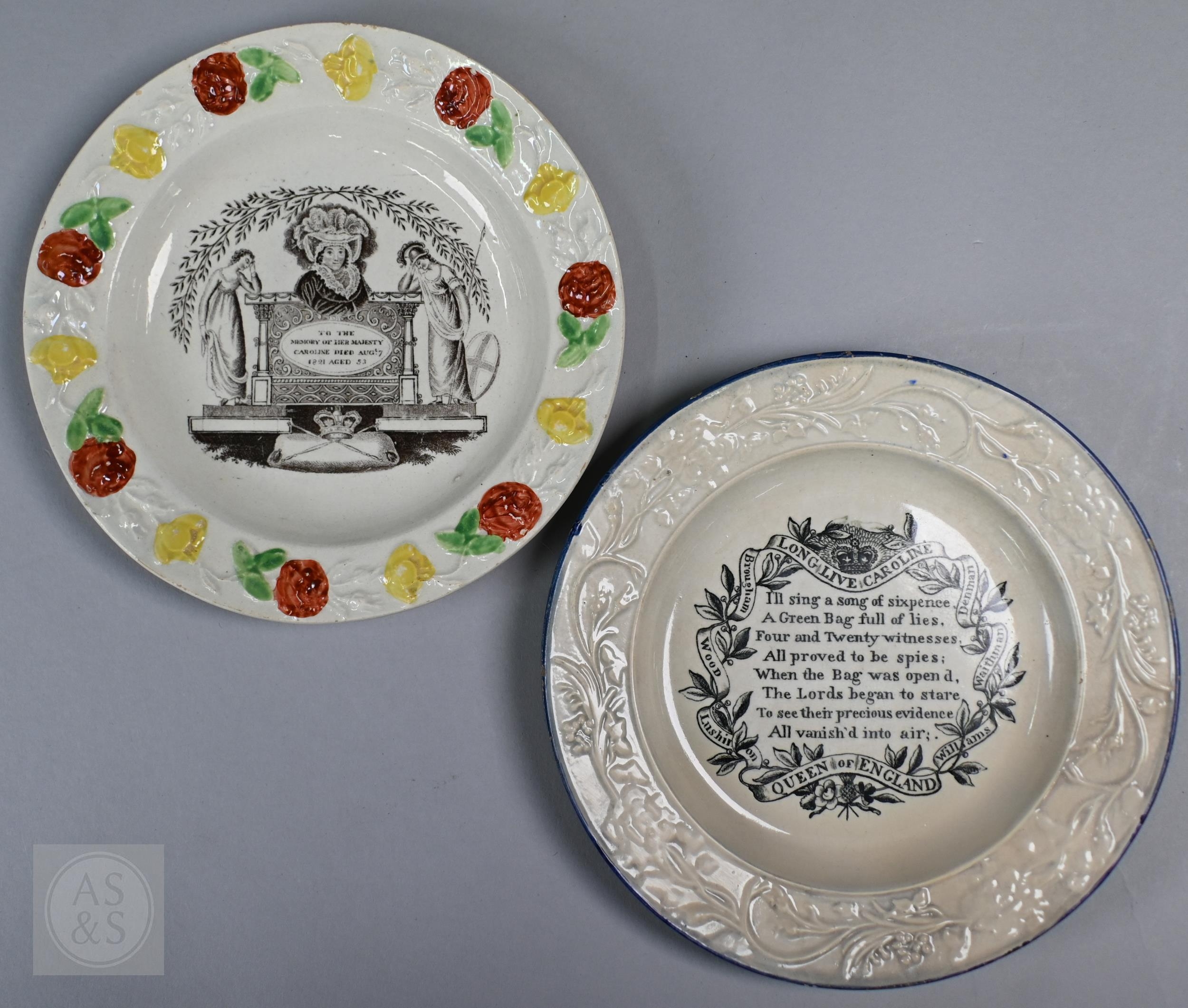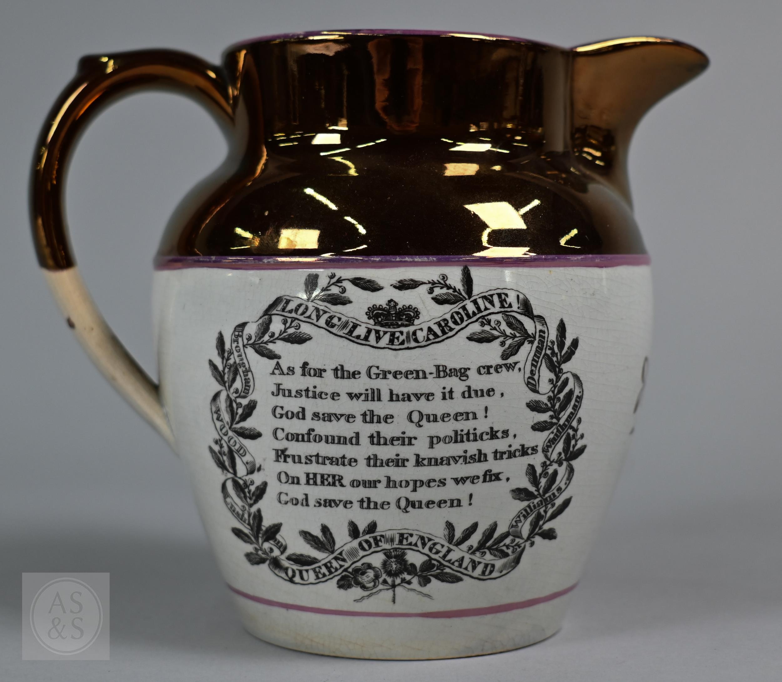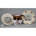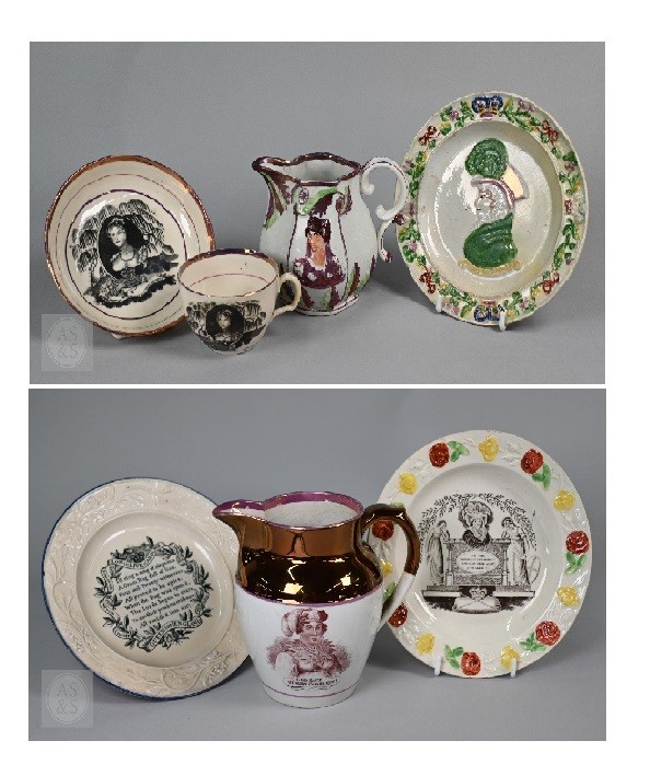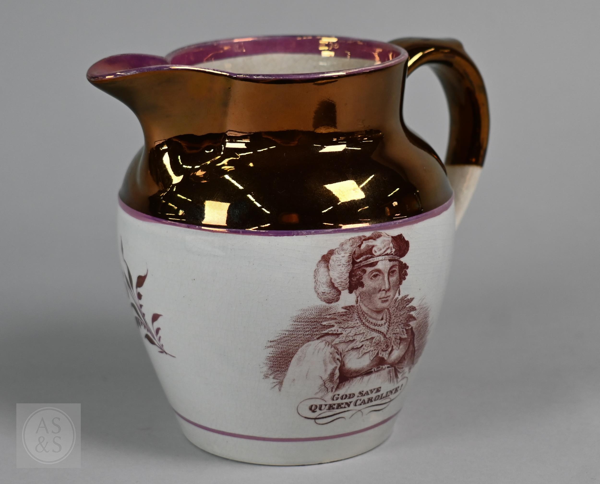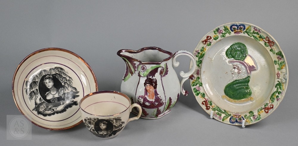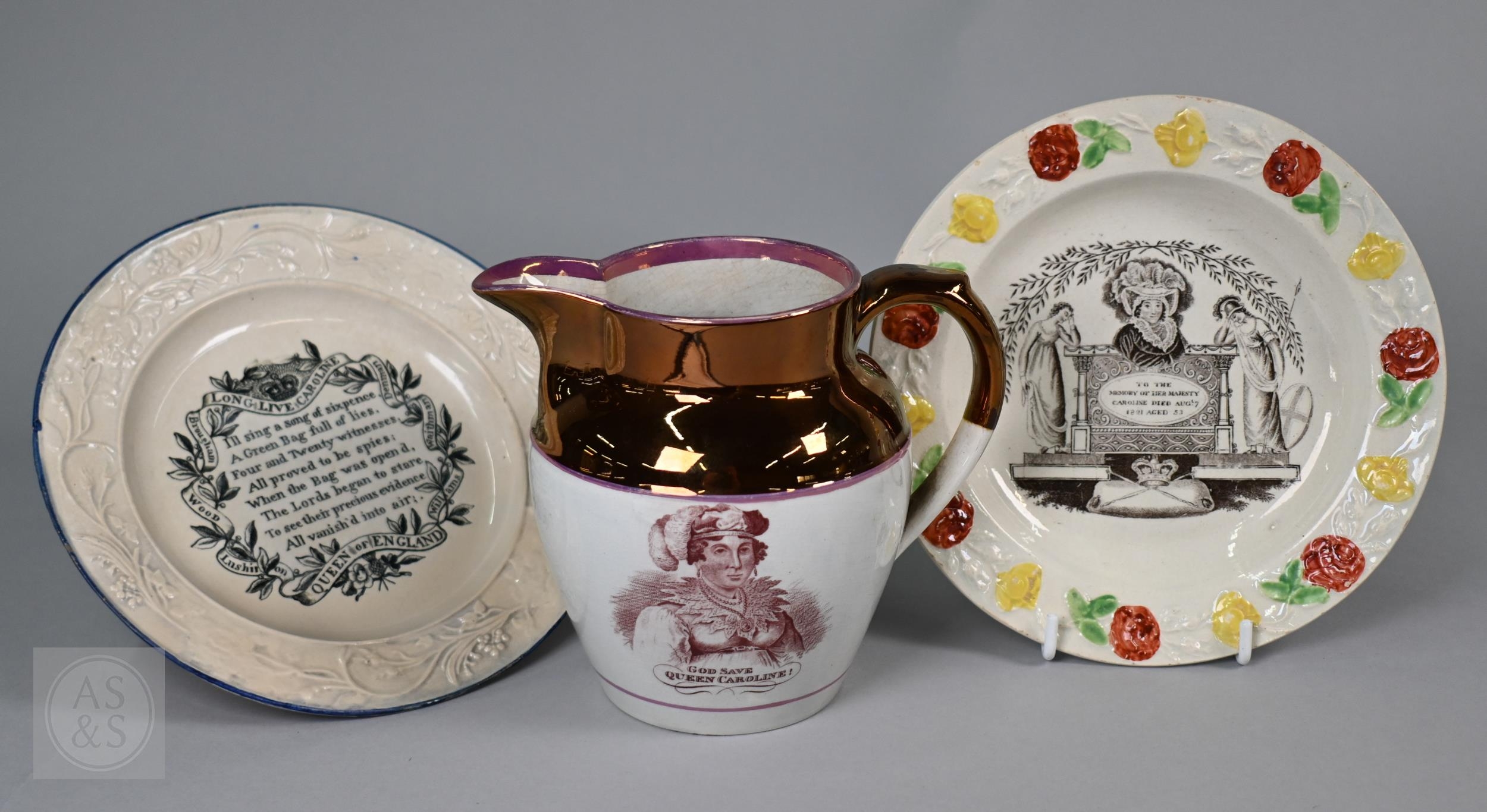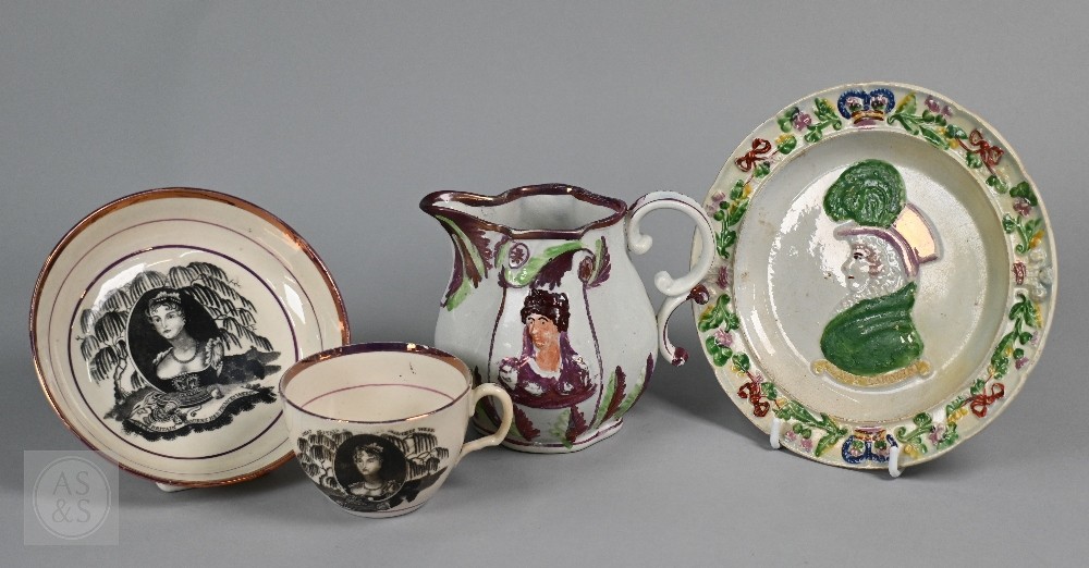 Royal Commemorative/Political: a pink and copper lustre jug, printed in support of the Queen in the 1820 Pains and Penalties Bill (false witness was proffered in green baize bags in George IV's pursuit of his divorce from her), 22.5 cm high, to/w a plate with a similar satirical verse within floral-moulded rim of another plate commemorating her death a year later; An 1817 moulded pottery Royal Commemorative jug with pink lustre and green highlights, commemorating the marriage of Princess Charlotte to Prince Leopold of Saxe-Coburg, 11 cm high, to/w a Pratt-style 17 cm plate embossed and painted with Queen Caroline, and a Sunderland lustre tea cup and saucer commemorating the death of Queen Caroline (1821) (7)