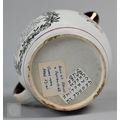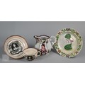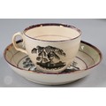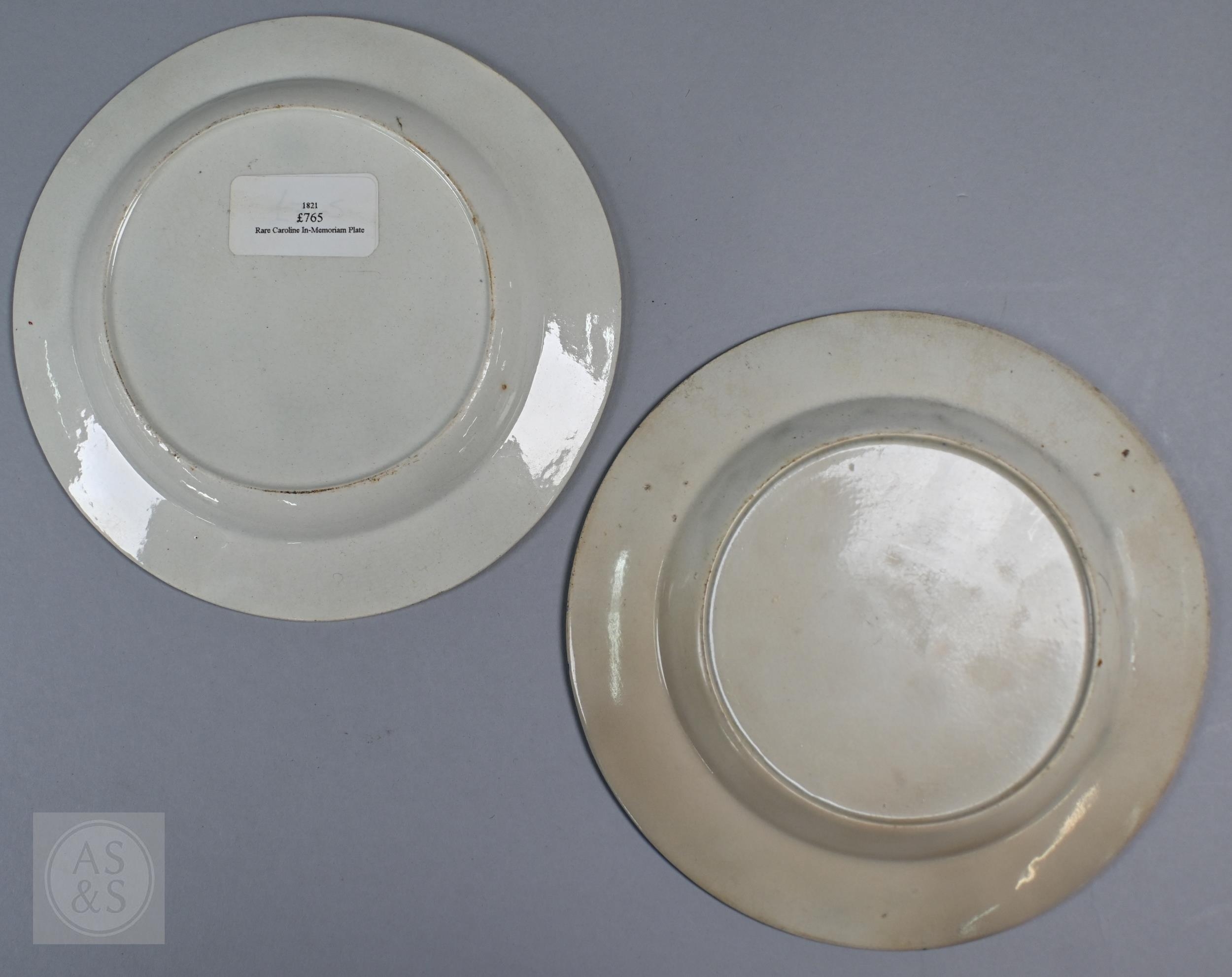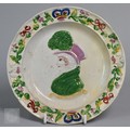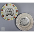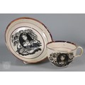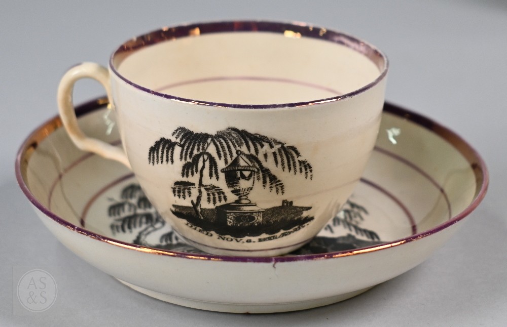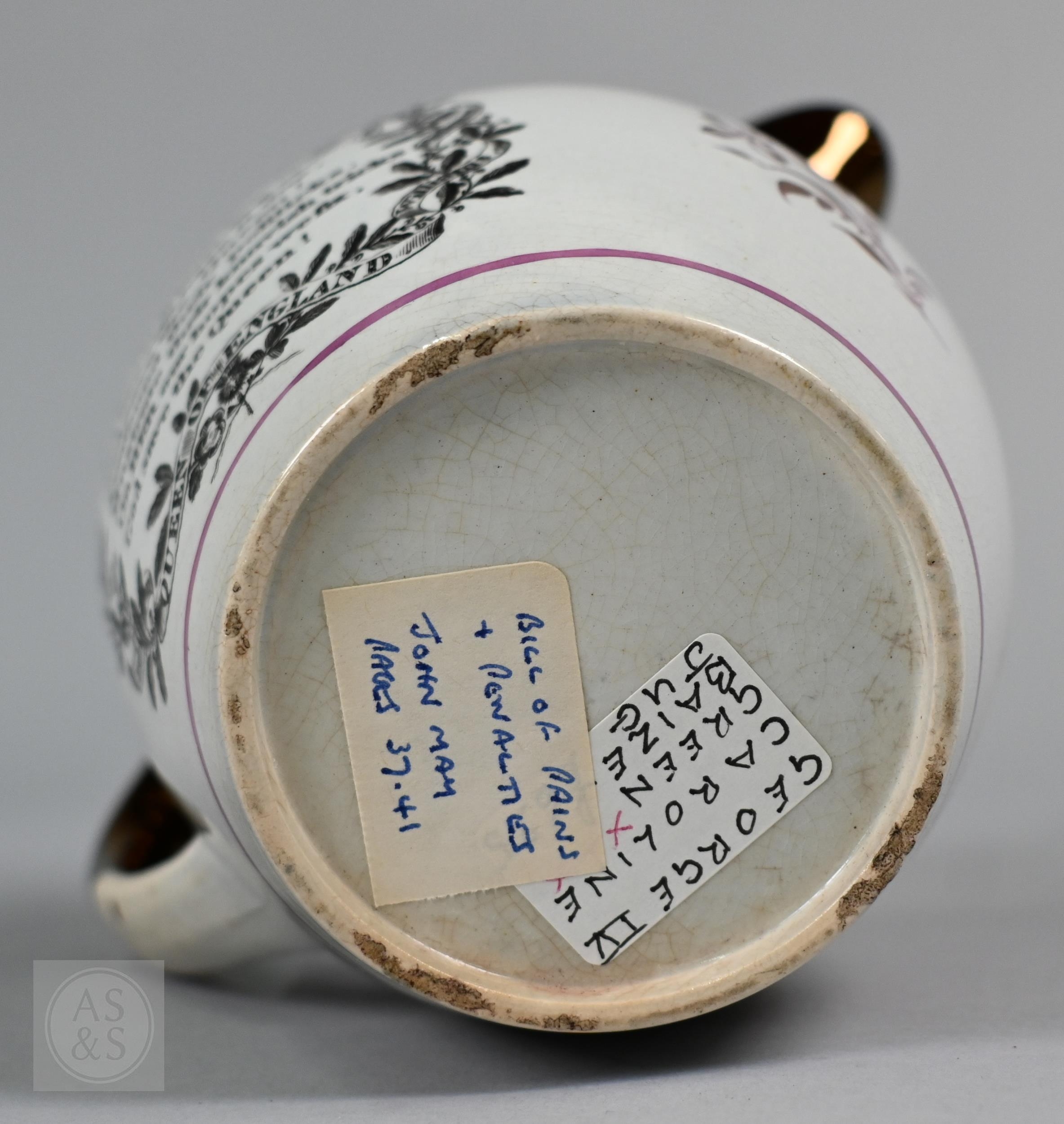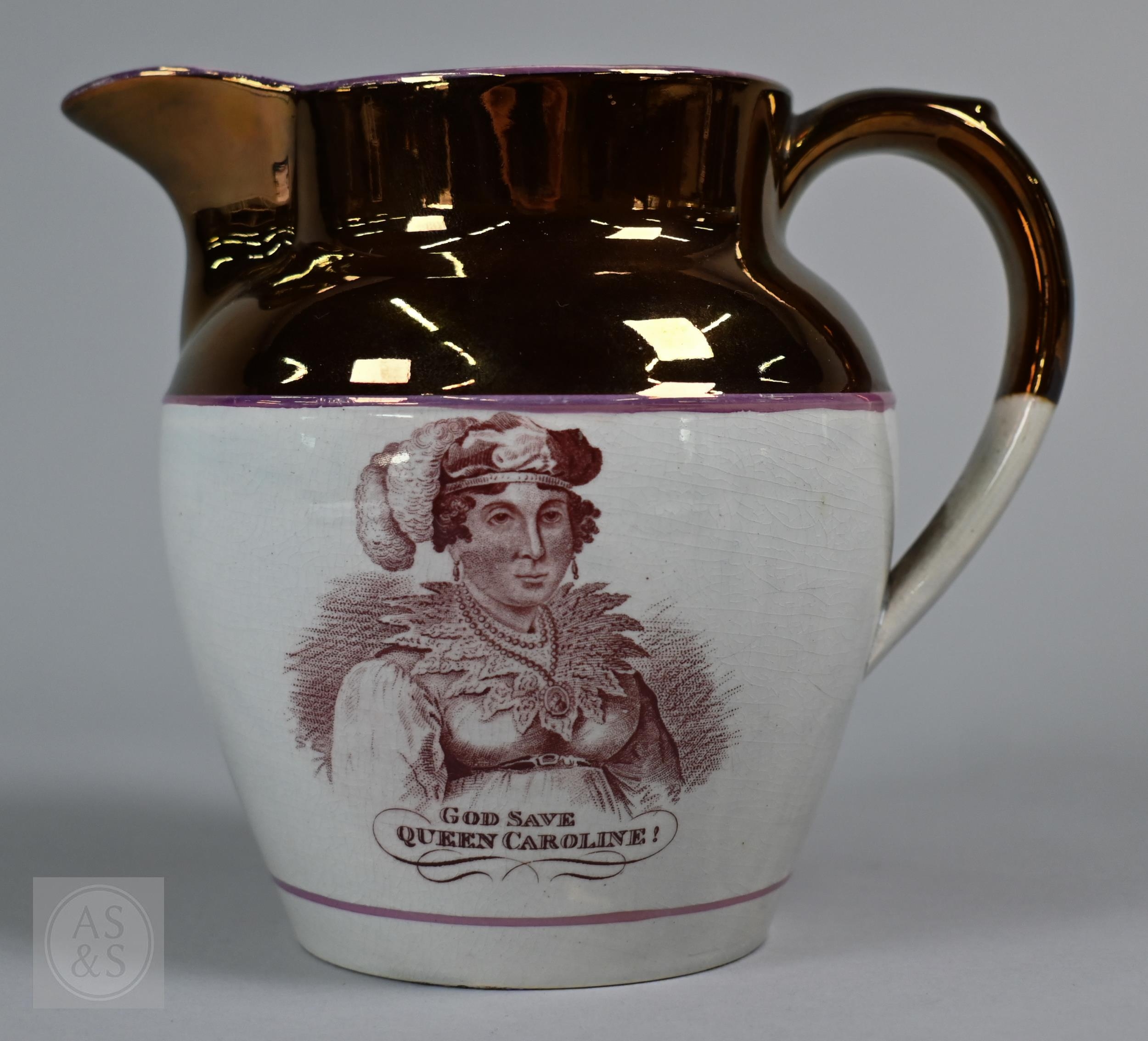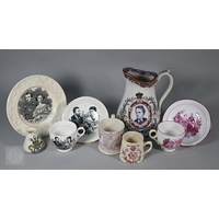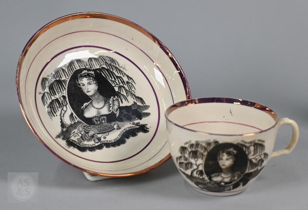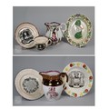 Royal Commemorative/Political: a pink and copper lustre jug, printed in support of the Queen in the 1820 Pains and Penalties Bill (false witness was proffered in green baize bags in George IV's pursuit of his divorce from her), 22.5 cm high, to/w a plate with a similar satirical verse within floral-moulded rim of another plate commemorating her death a year later; An 1817 moulded pottery Royal Commemorative jug with pink lustre and green highlights, commemorating the marriage of Princess Charlotte to Prince Leopold of Saxe-Coburg, 11 cm high, to/w a Pratt-style 17 cm plate embossed and painted with Queen Caroline, and a Sunderland lustre tea cup and saucer commemorating the death of Queen Caroline (1821) (7)