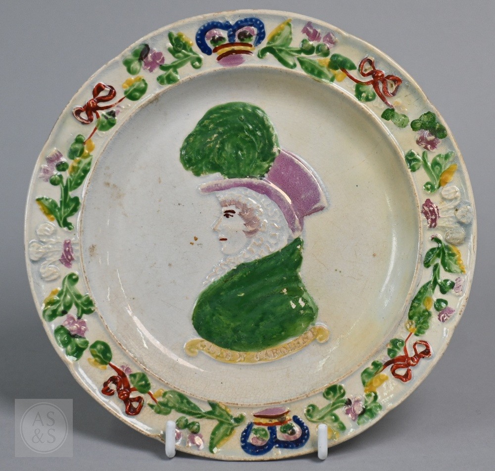 Queen Caroline saucer has a restored crack to edge, discoloured to outside, some losses to decoration