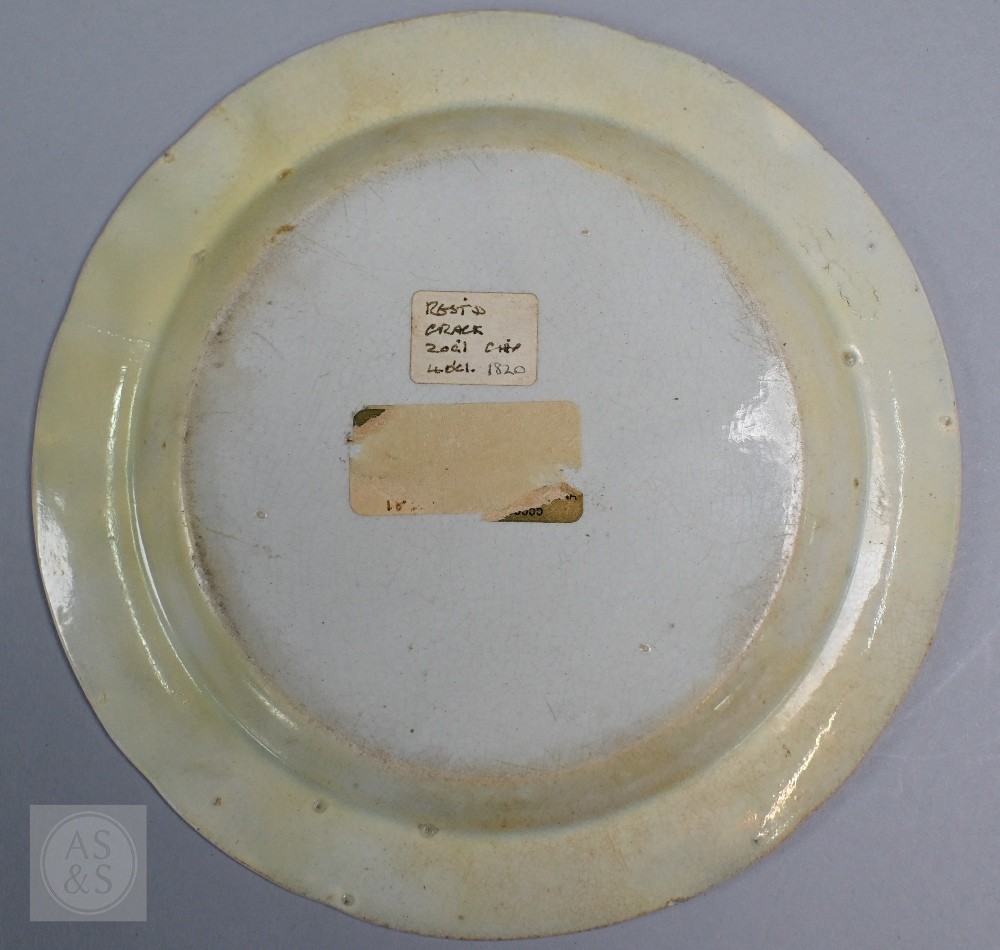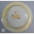 Long Lige Caroline plate - small areas of retouching on inner rim, chips to edges, possible repairs underneath, crazing, UV light shows discolouration, minor fading to design on front