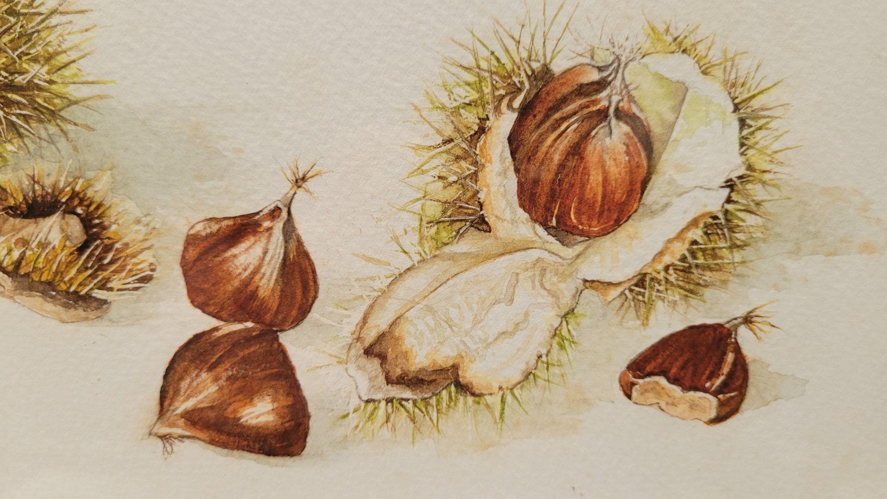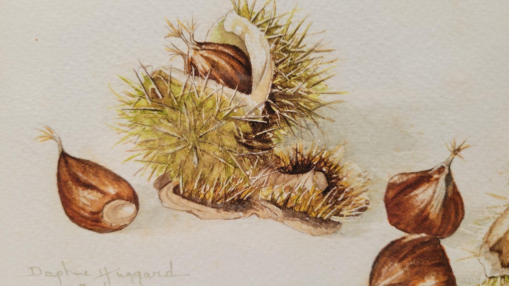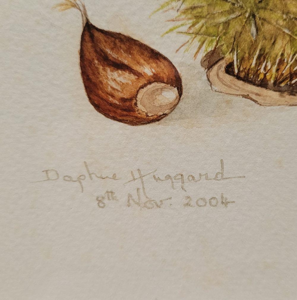 DAPHNE HUGGARD, (IRISH, 20th CENTURY), CHESTNUTS, watercolour on paper, signed and dated lower left. 25 x 17cm painting, 38 x 31.5cm frame.