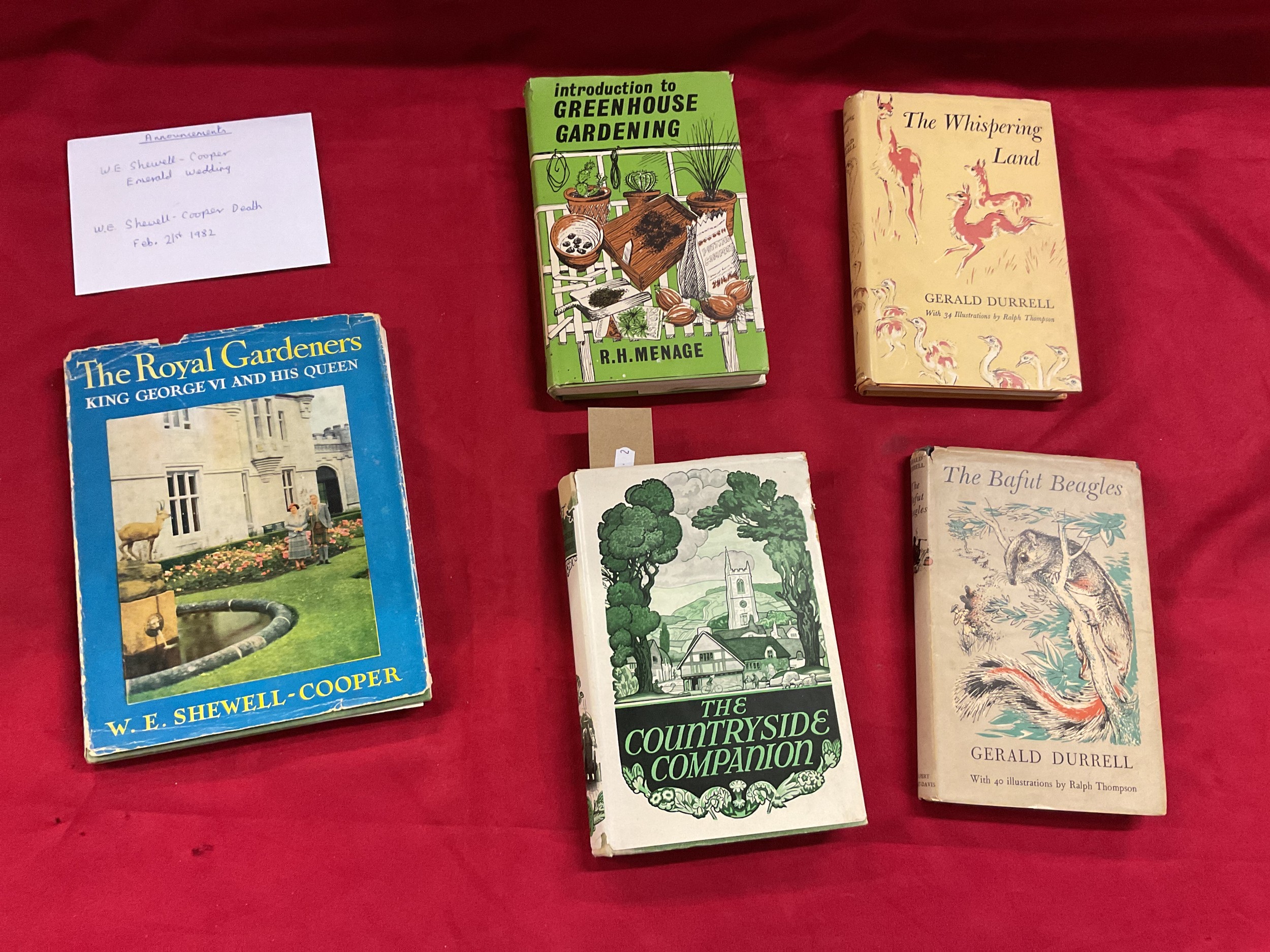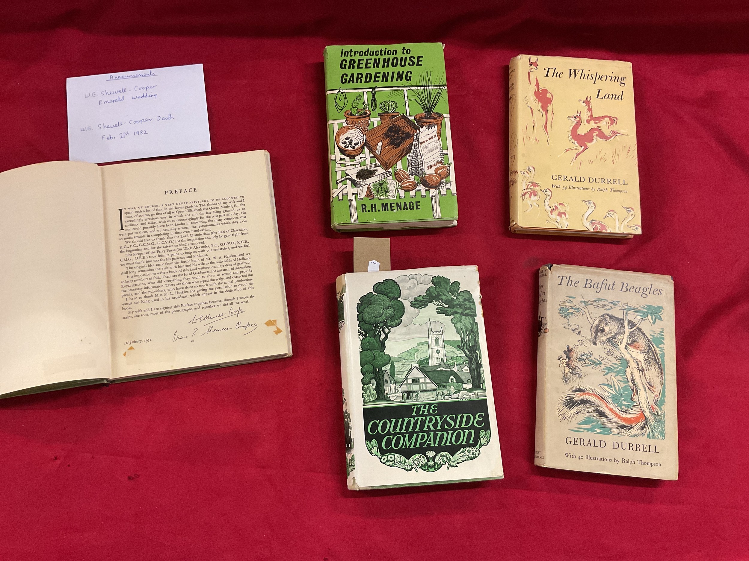 Four assorted volumes The Countryside Companion, Greenhouse Gardening, The Bafut Beagles, The Whispering Land and a signed The Royal Gardeners