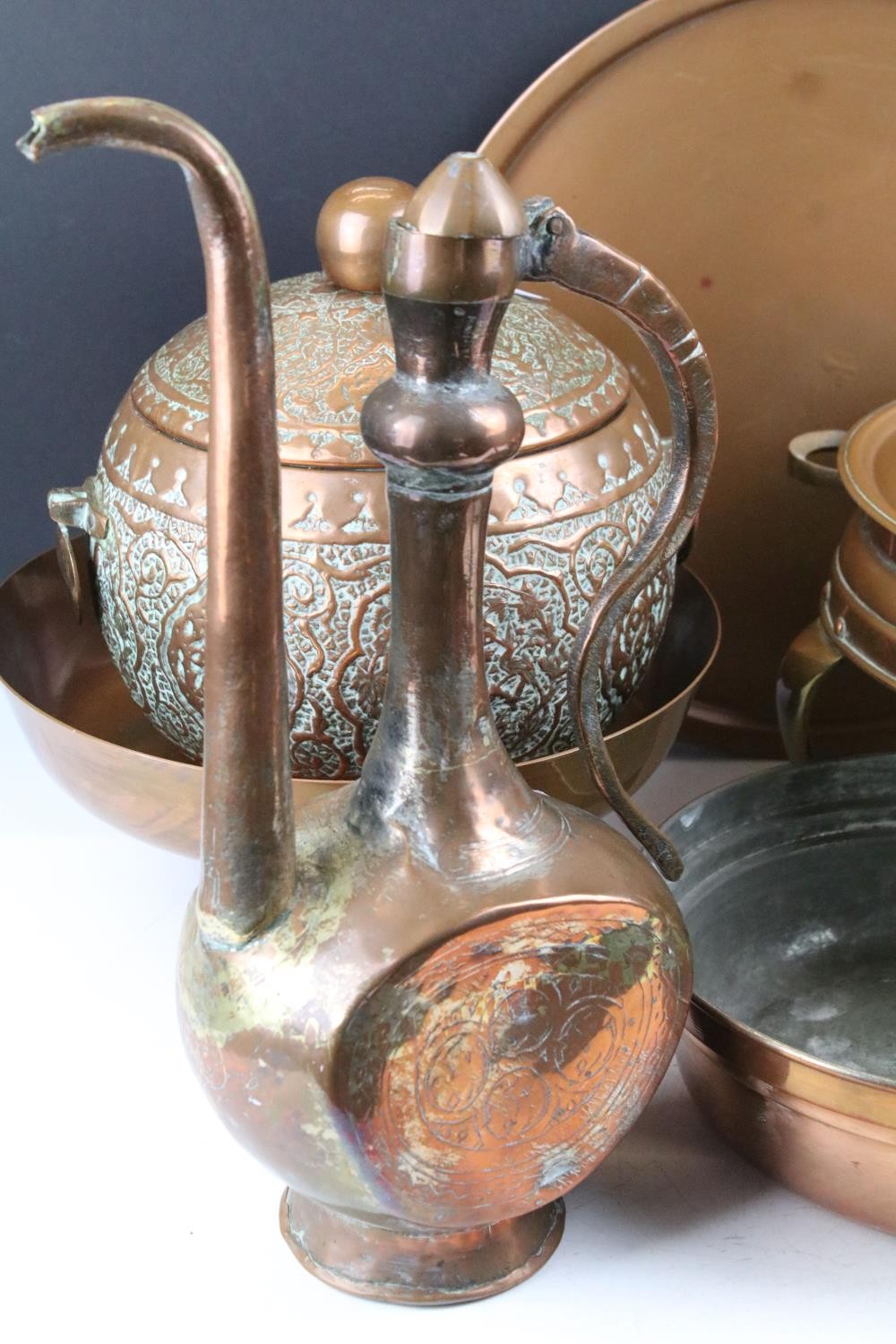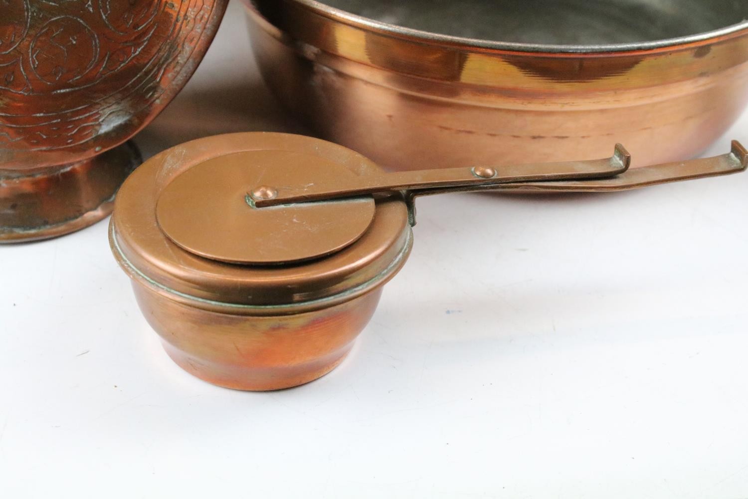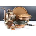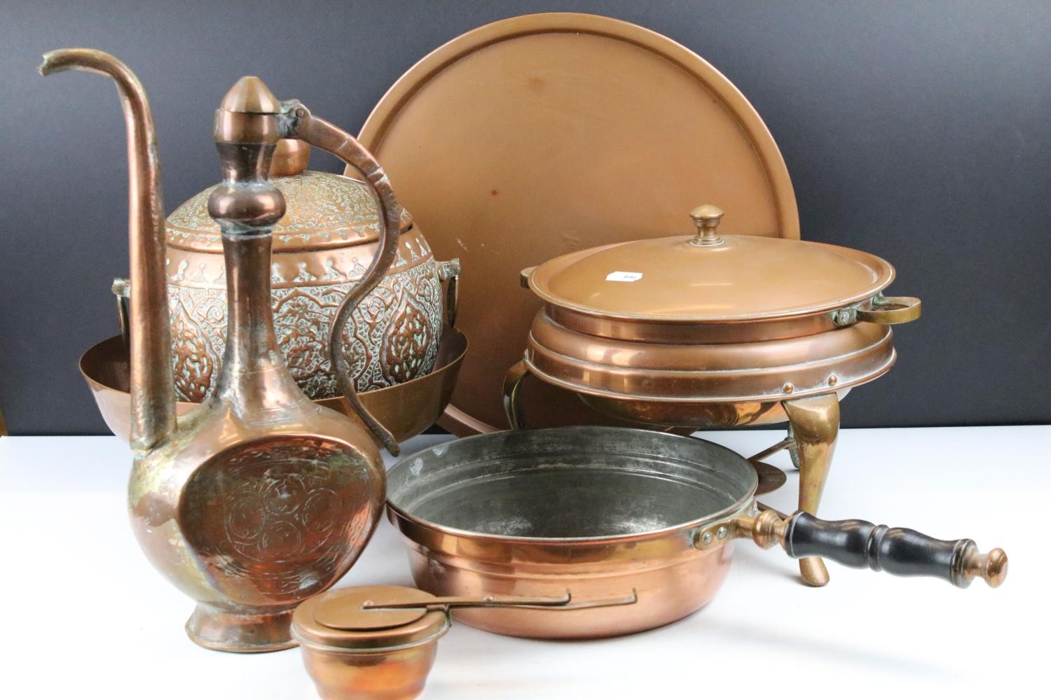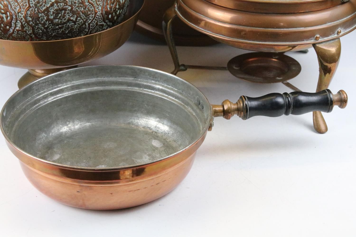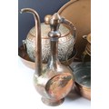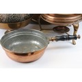 Collection of assorted copper wares to include a Persian copper ewer, twon handled pot with repousse detailing, sauce pan, and copper warmer with trivet.