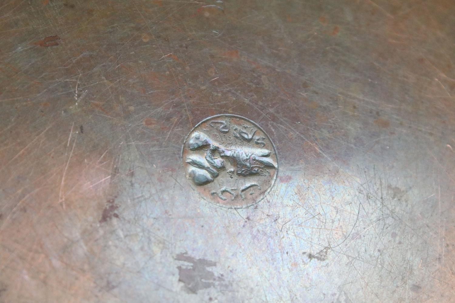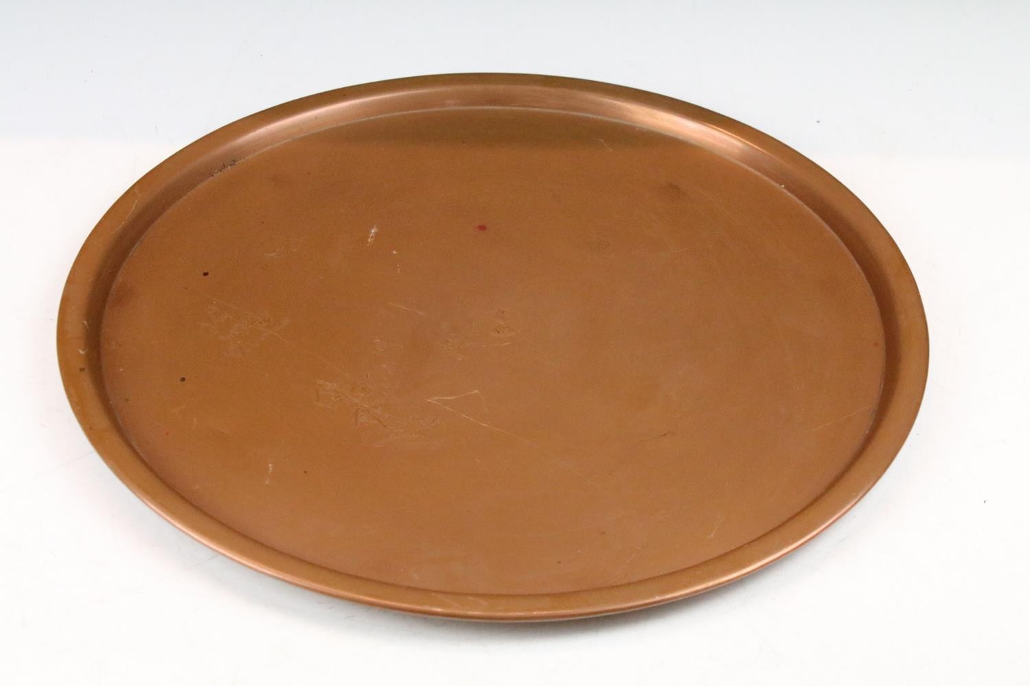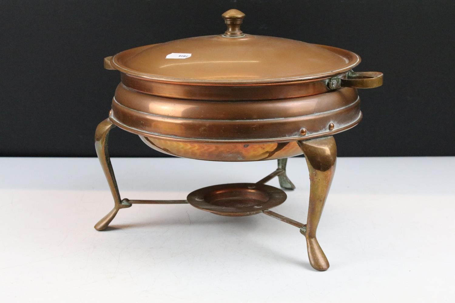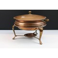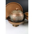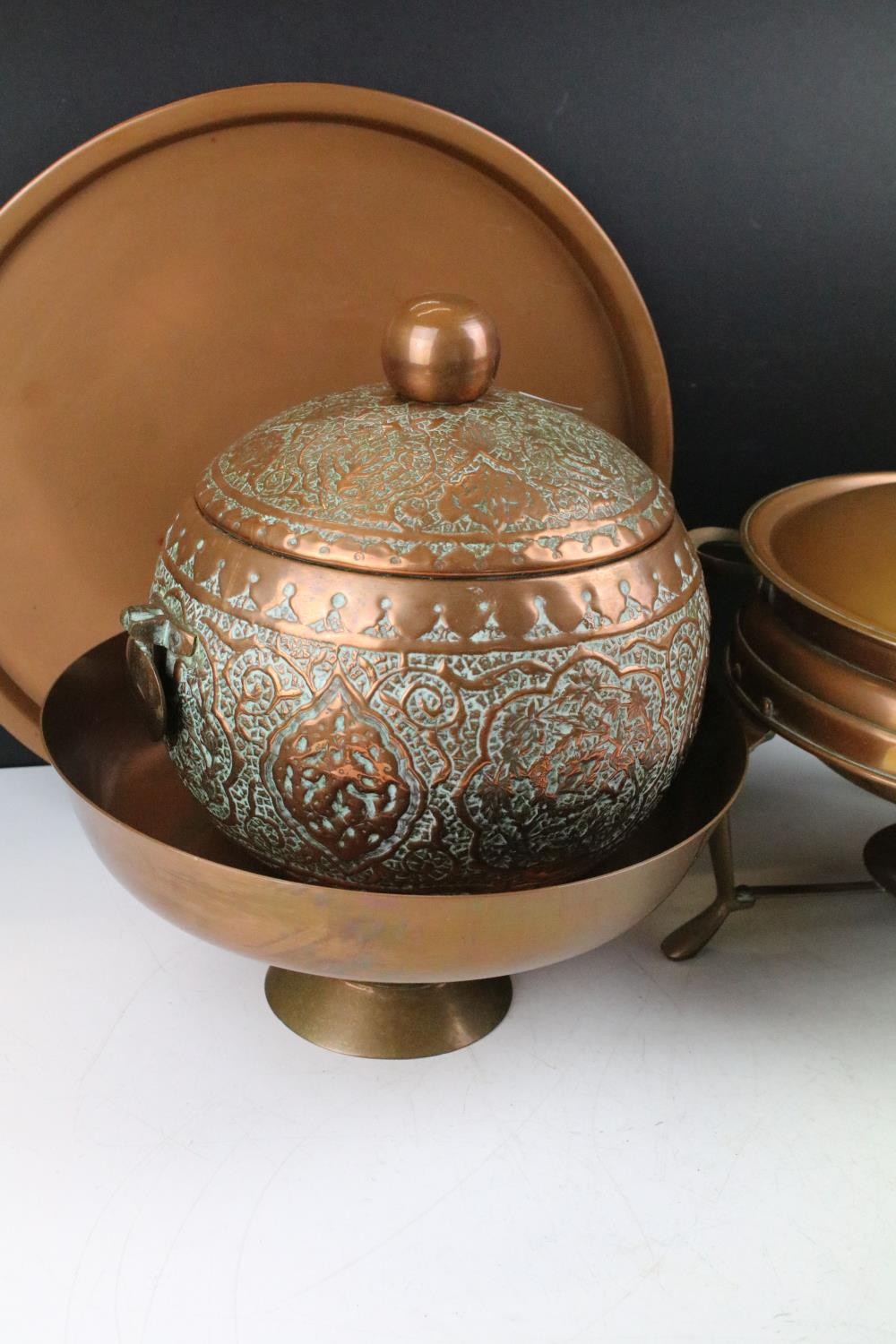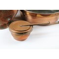 Collection of assorted copper wares to include a Persian copper ewer, twon handled pot with repousse detailing, sauce pan, and copper warmer with trivet.