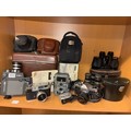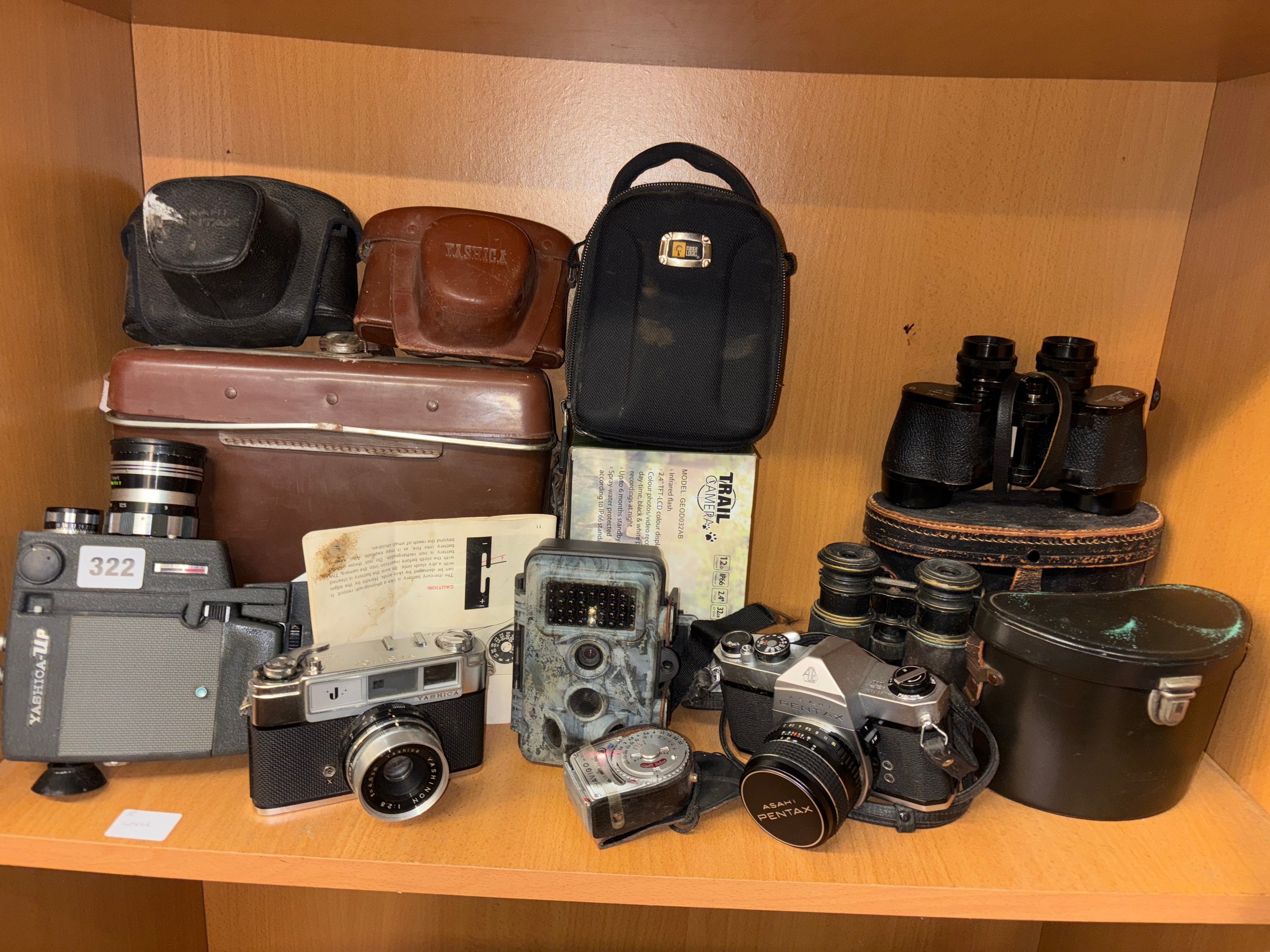 YASHICA 35MM CAMERA, PENTAX SP1000 ASAHI CAMERA, YASHICA CINE CAMERA, TRAIL CAMERA, AND PAIRS OF BINOCULARS