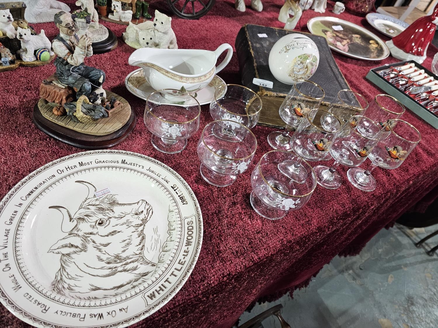 Nice vintage collection of items to include a Marlo figurine, Queen Victoria 1887 golden jubilee plate, Flopsy bunny money box, pheasant design glasses etc