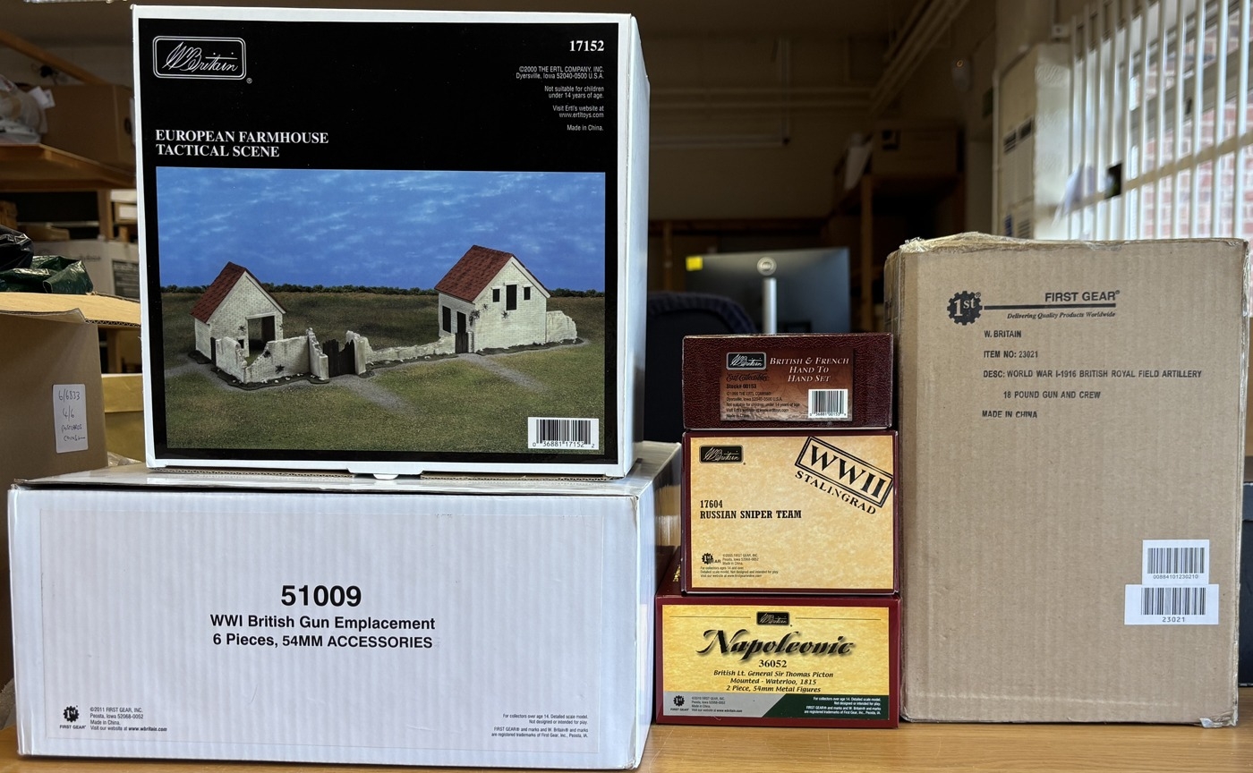 Britains. Range of soldiers and sets, generally near mint in excellent boxes, including #00154 British & French Hand to Hand set, 17152 European Farmhouse Tactical Scene, 17604 Russian Sniper Team, 23021 World War 1 1916 British Royal Field Artilley and 36052 British Lt. General Sir Thomas Picton Mounted - Waterloo, 1815. Qty 6. (B)