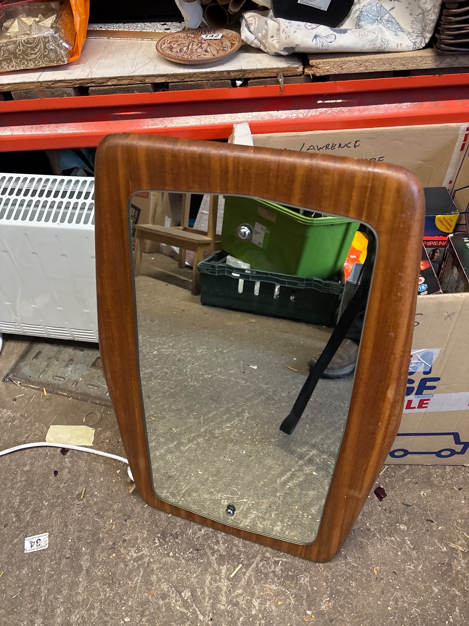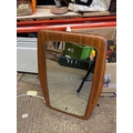 Wood-framed mid-century mirror with rectangular shape and beveled edges not postable.
