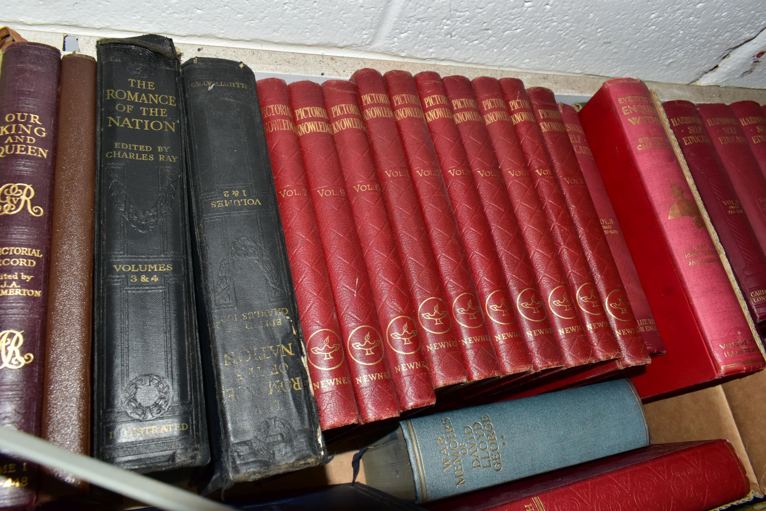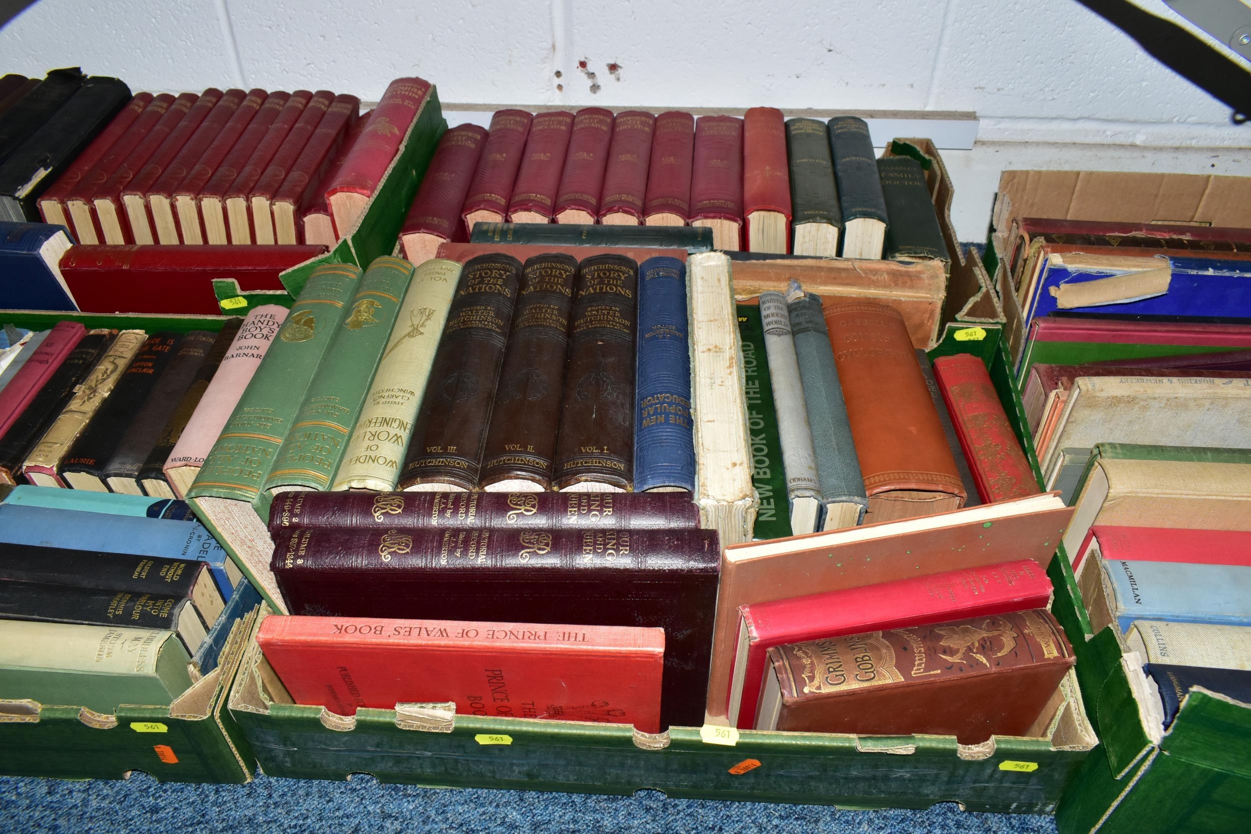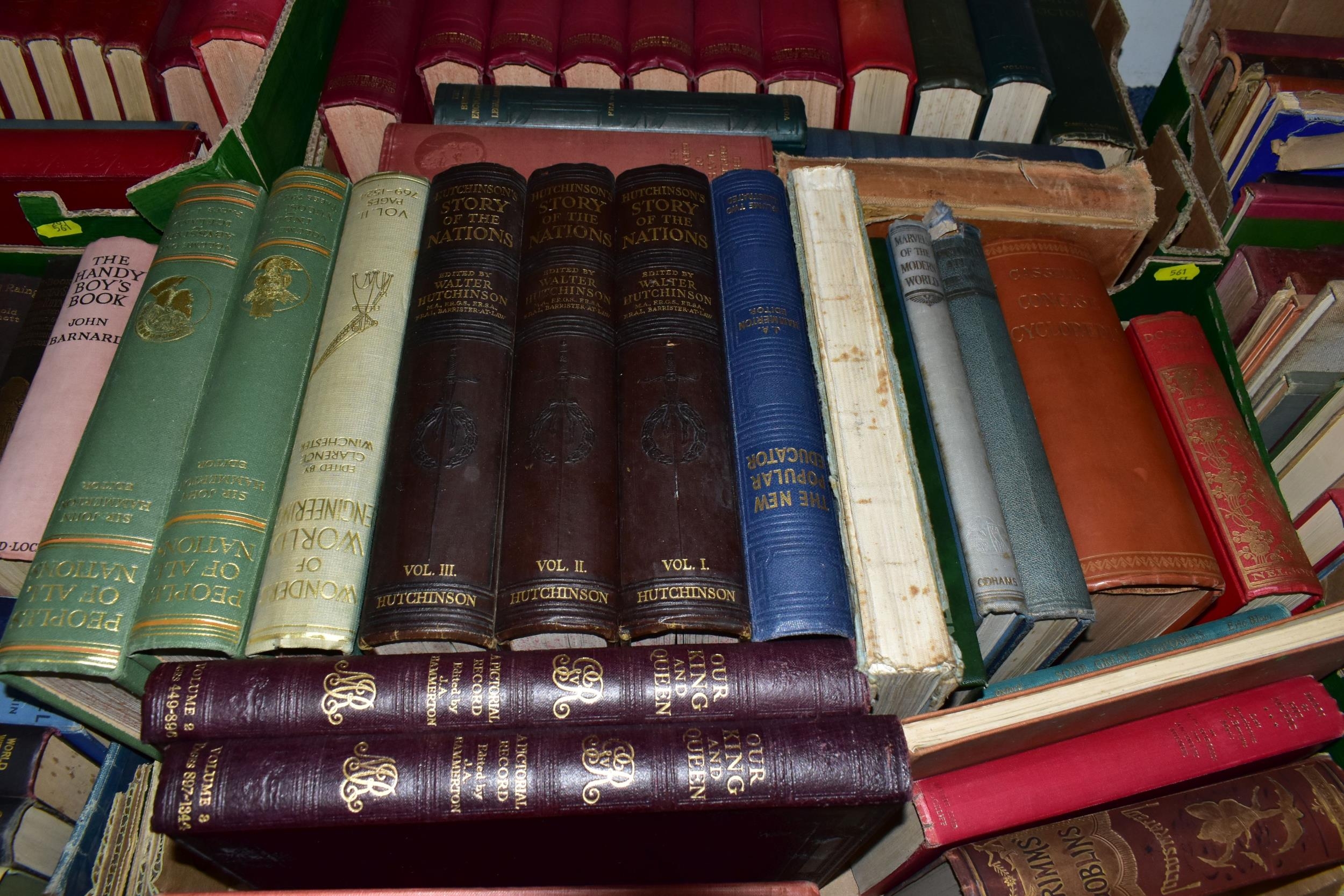 FIVE BOXES OF BOOKS containing approximately 125 older or antiquarian book titles in hardback format, subjects include royalty, history, poetry, plays, music, classical music scores including Handel's Messiah, circa 1810, classic novels and a large section of encyclopaedic works to include eight volumes of Harmsworth's Self Education, ten volumes of Newnes Pictorial Knowledge, two volumes of The Romance of the Nation, three volumes of Hutchinson's Story of the Nations and two volumes of Our King and Queen, A Pictorial Record, edited by J.A. Hammerton