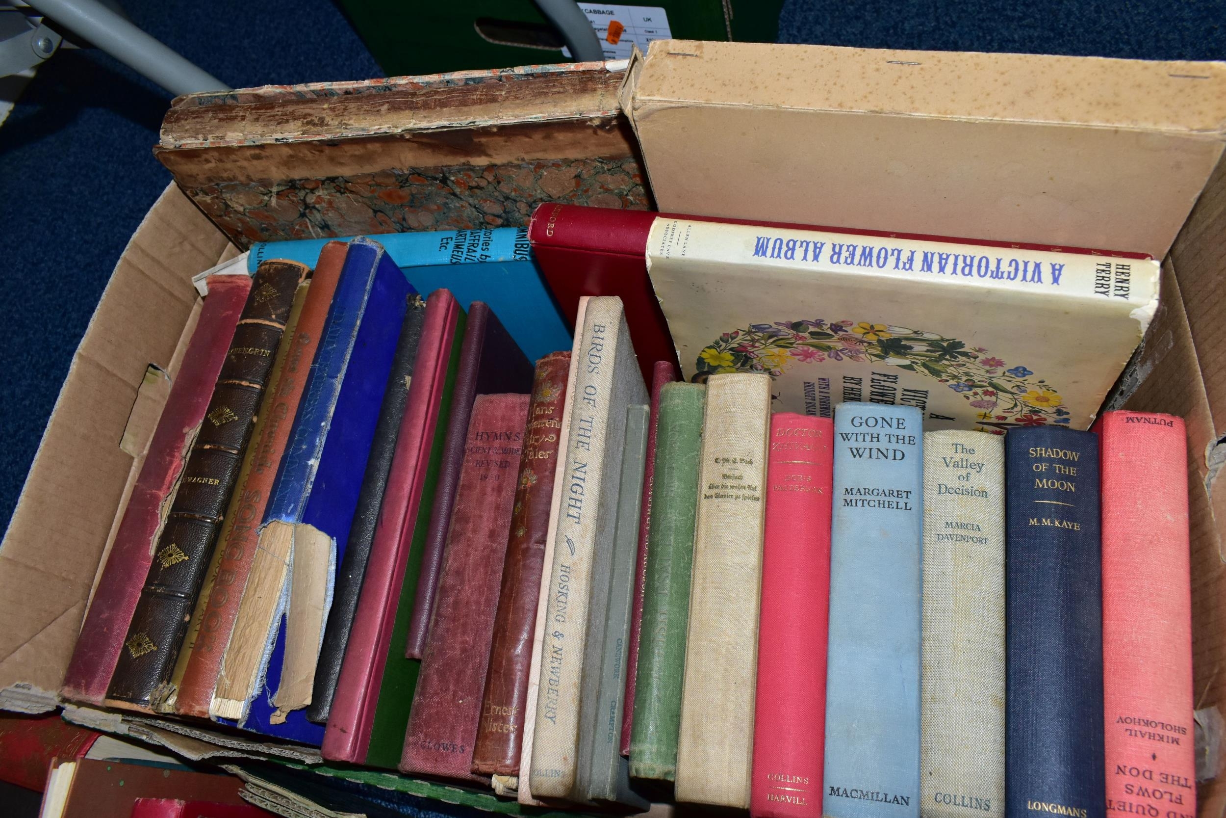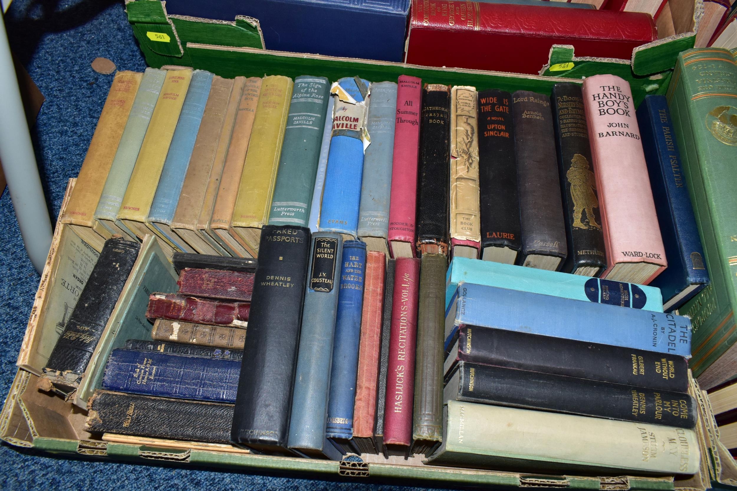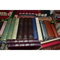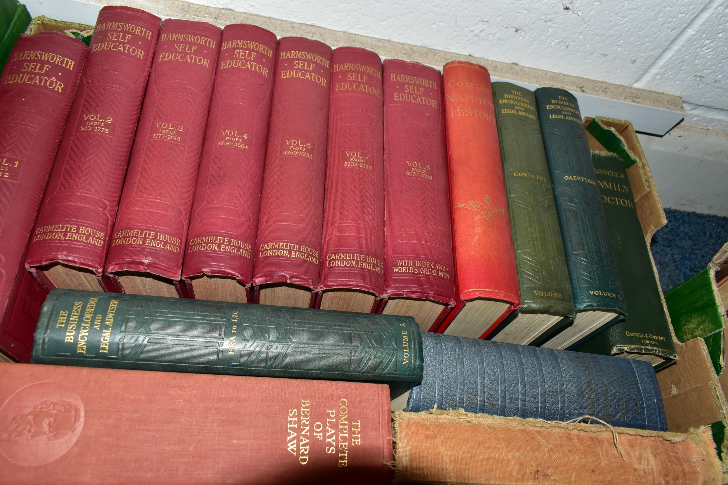 FIVE BOXES OF BOOKS containing approximately 125 older or antiquarian book titles in hardback format, subjects include royalty, history, poetry, plays, music, classical music scores including Handel's Messiah, circa 1810, classic novels and a large section of encyclopaedic works to include eight volumes of Harmsworth's Self Education, ten volumes of Newnes Pictorial Knowledge, two volumes of The Romance of the Nation, three volumes of Hutchinson's Story of the Nations and two volumes of Our King and Queen, A Pictorial Record, edited by J.A. Hammerton