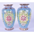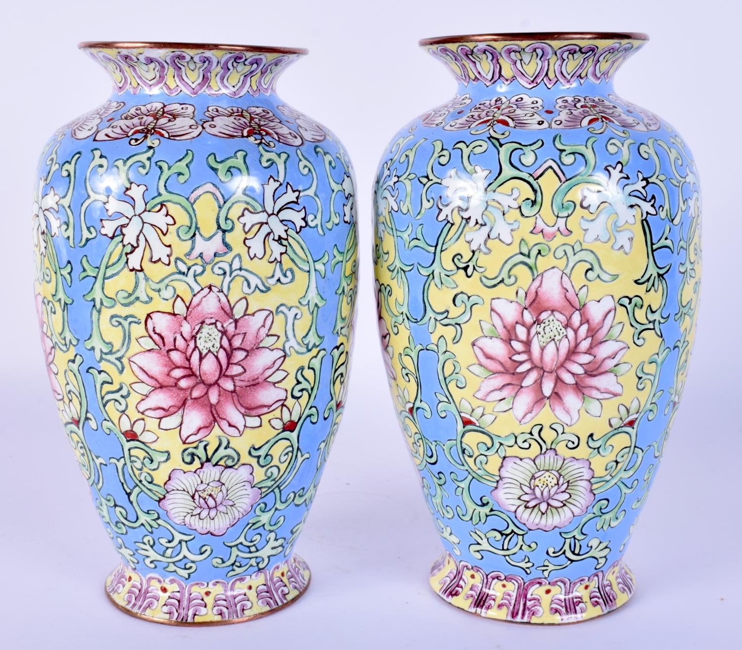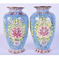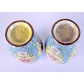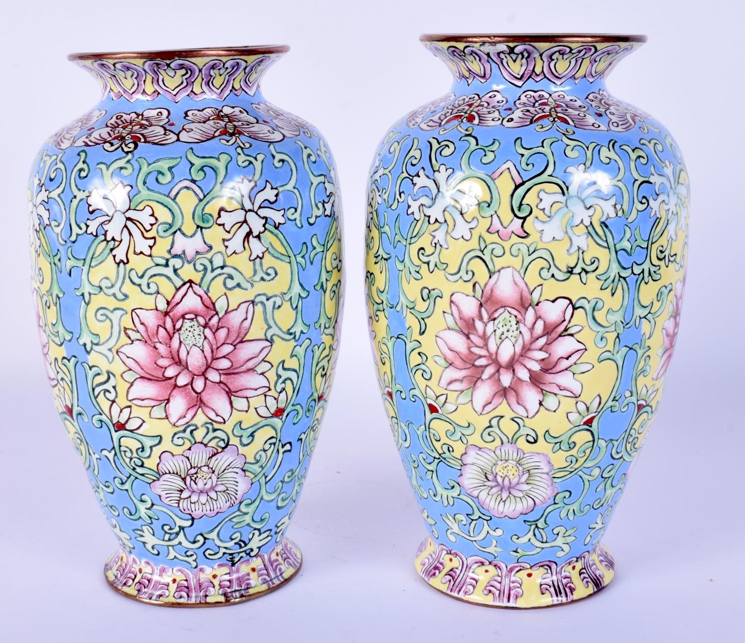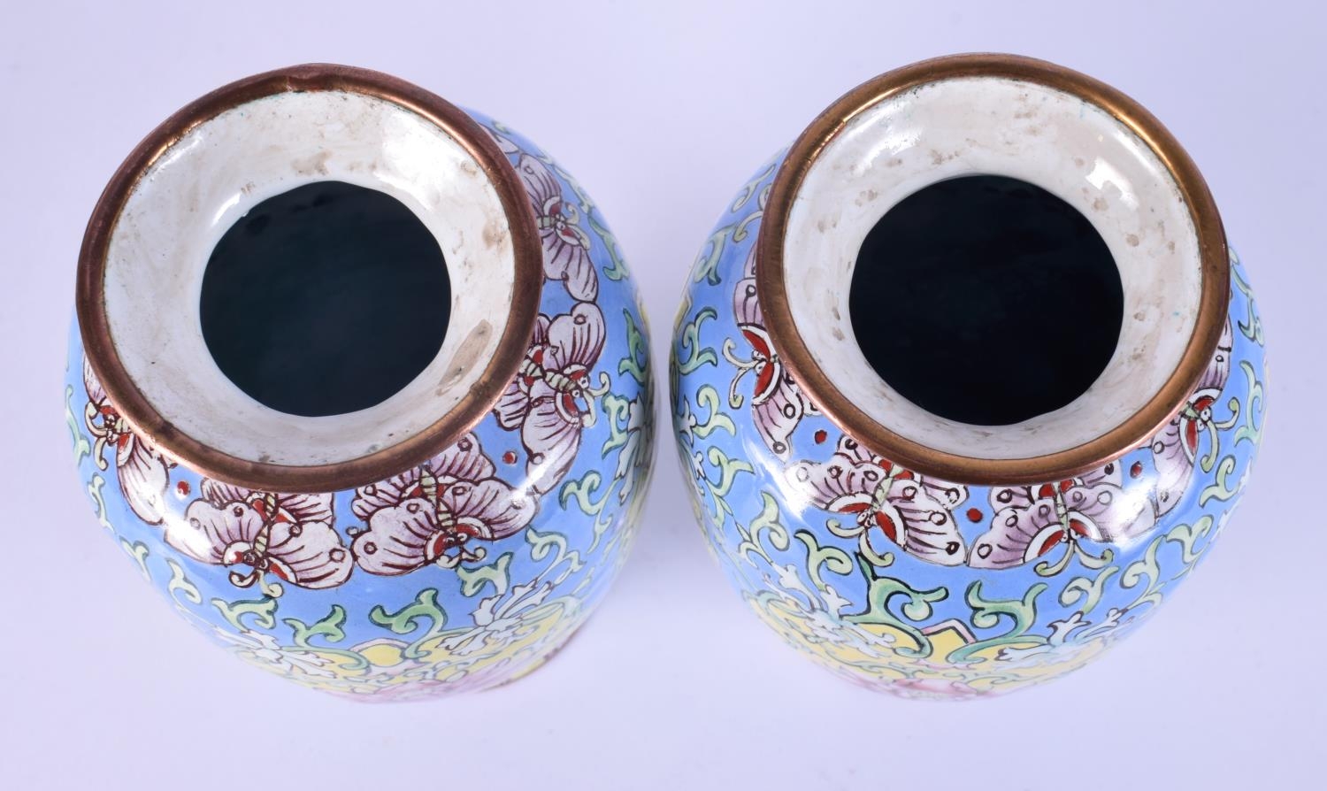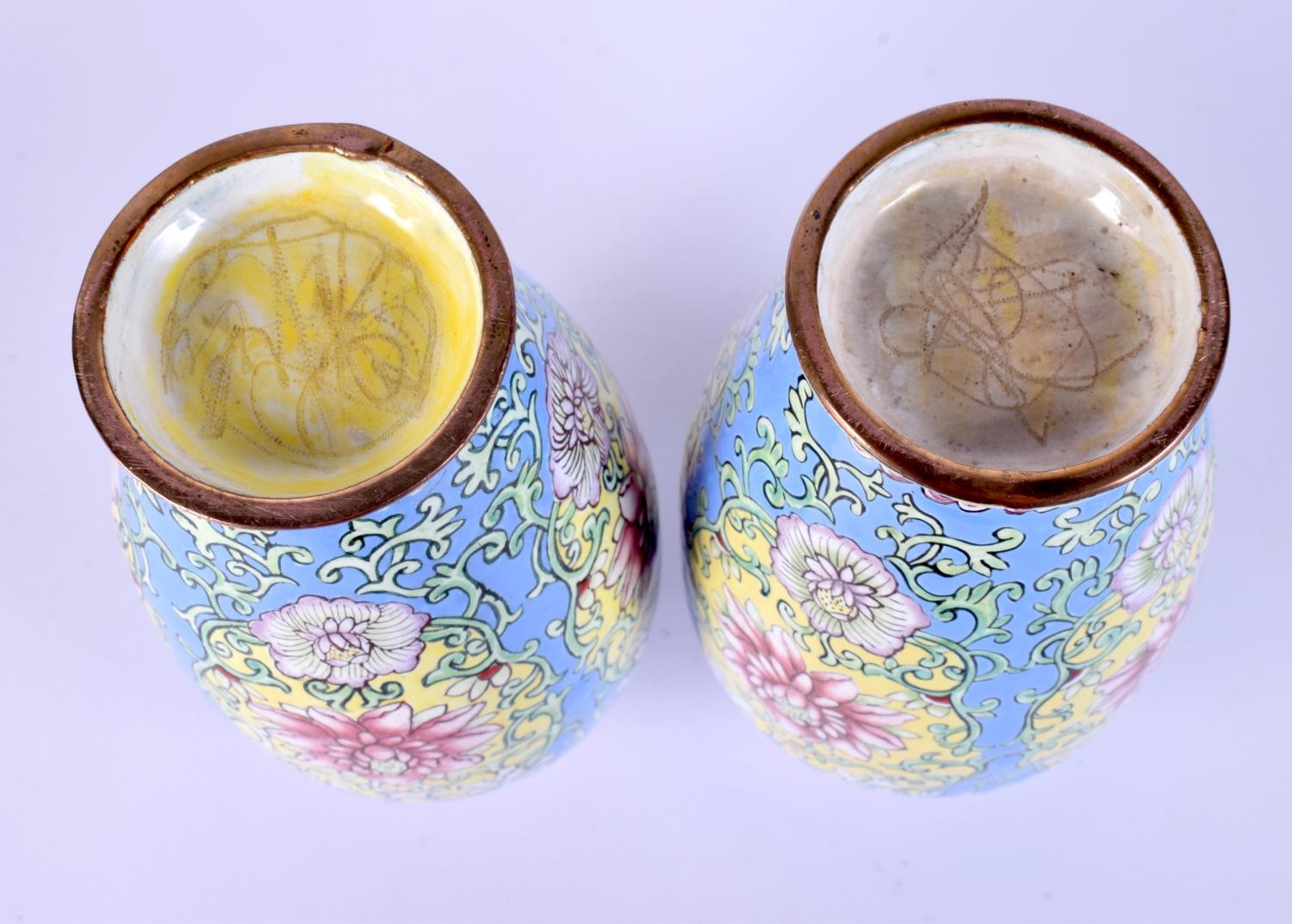 A FINE PAIR OF CHINESE QING DYNASTY CANTON ENAMEL VASES painted with bold foliage and vines. 14 cm high.