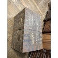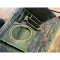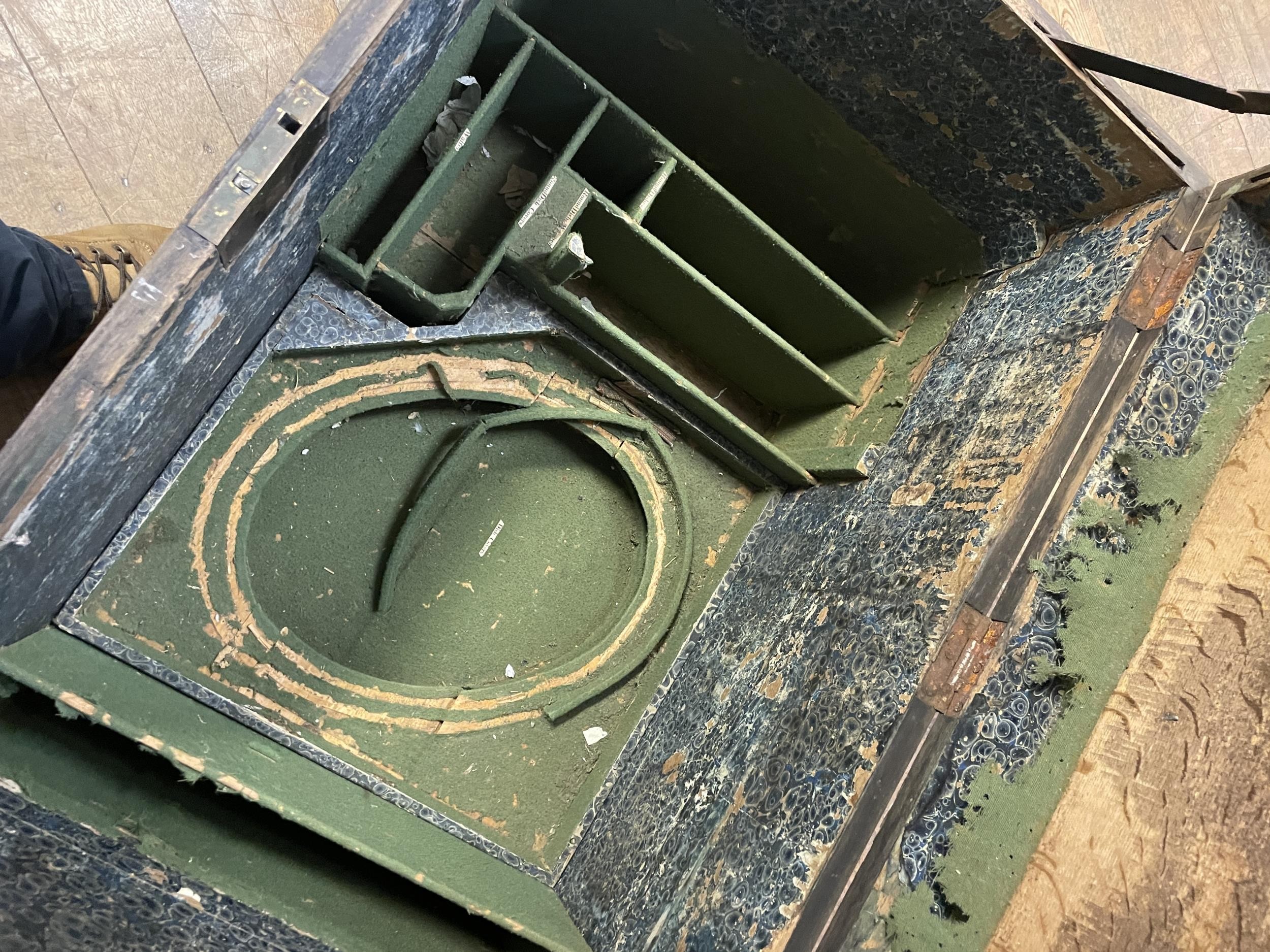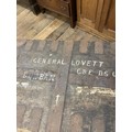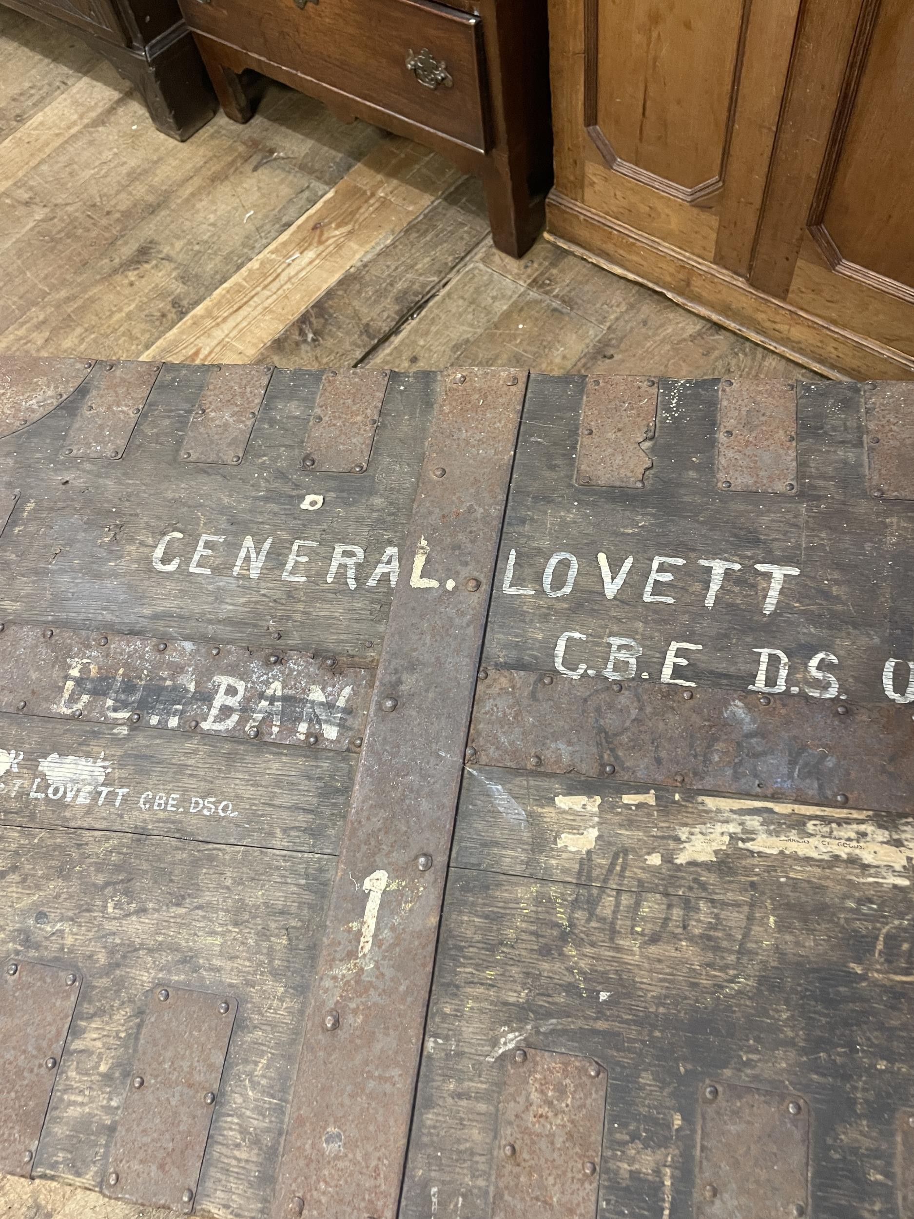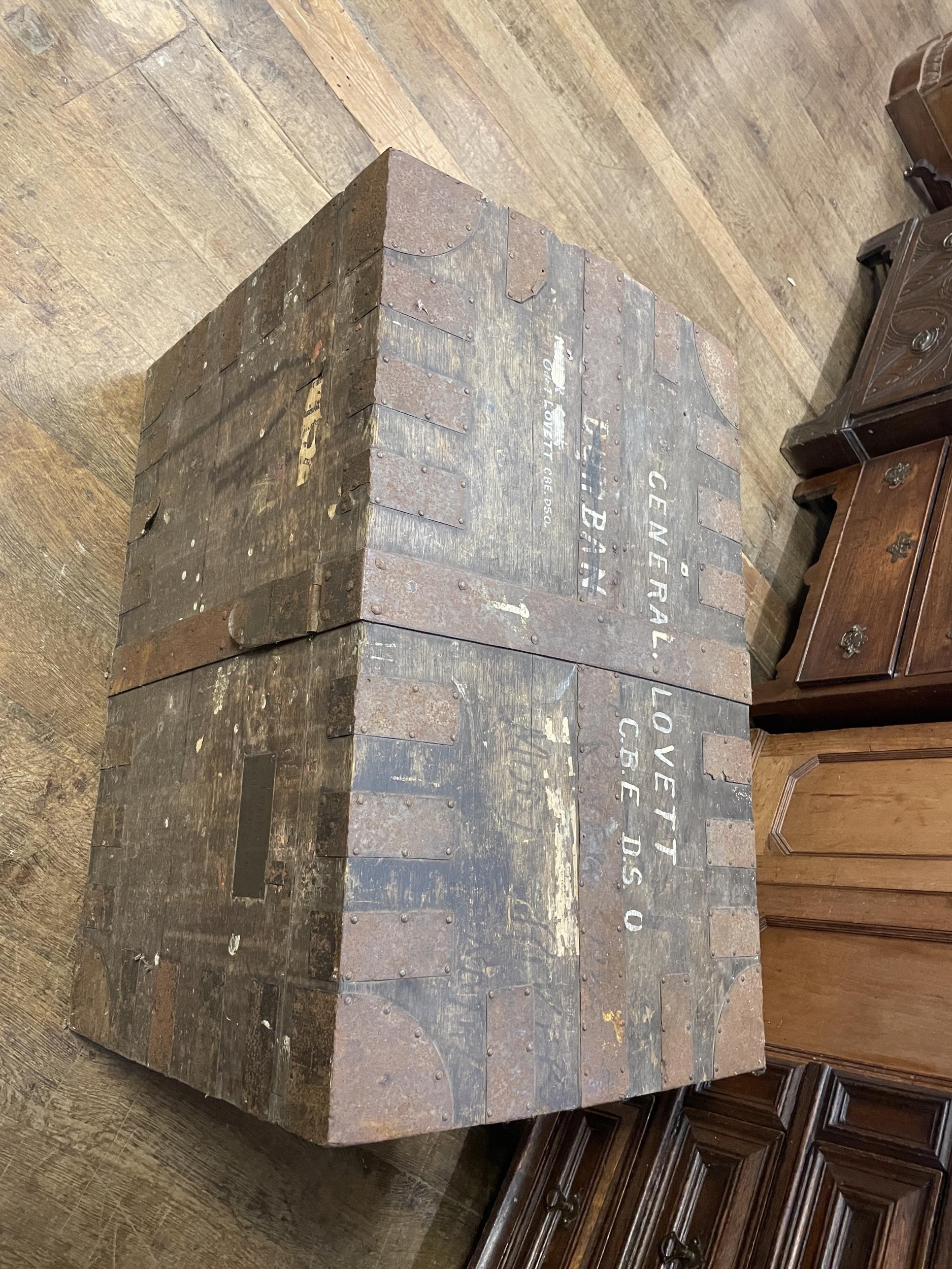 An oak and metal bound silver box, top painted General Lovett, in need of restoration, 87 cm wide