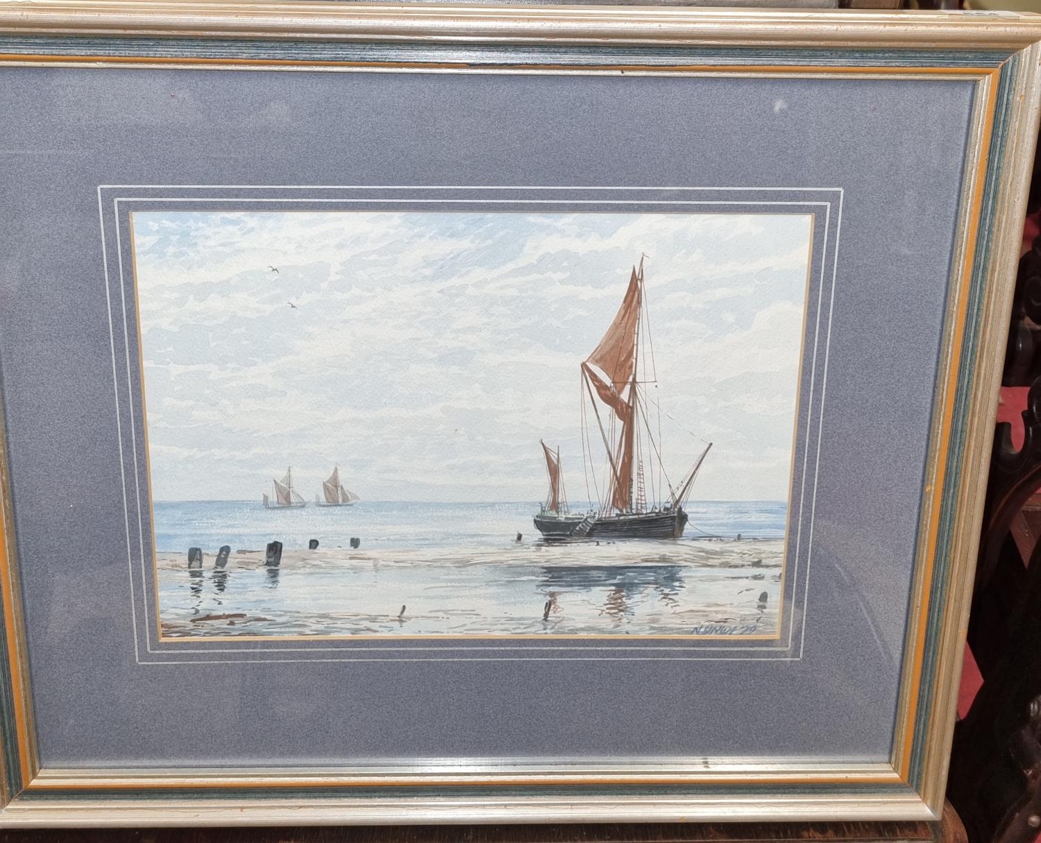 A 20th Century Watercolour of moored ships with ships in the distance. Indistinctly signed LR. 25 x 34 cm approx.