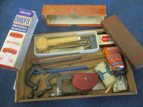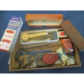 BOX OF VINTAGE MIXED CRAFT TOOLS, PEN TOOLS FOR LINO CUTTING, NUMEROUS RAZOR BLADES, UNI STONE, SMALL CLAMP ETC