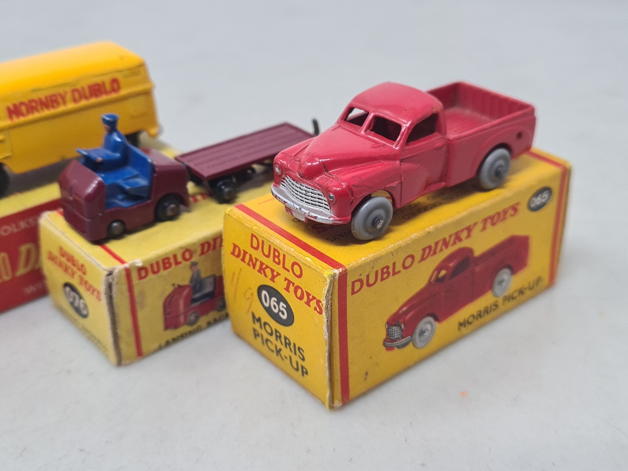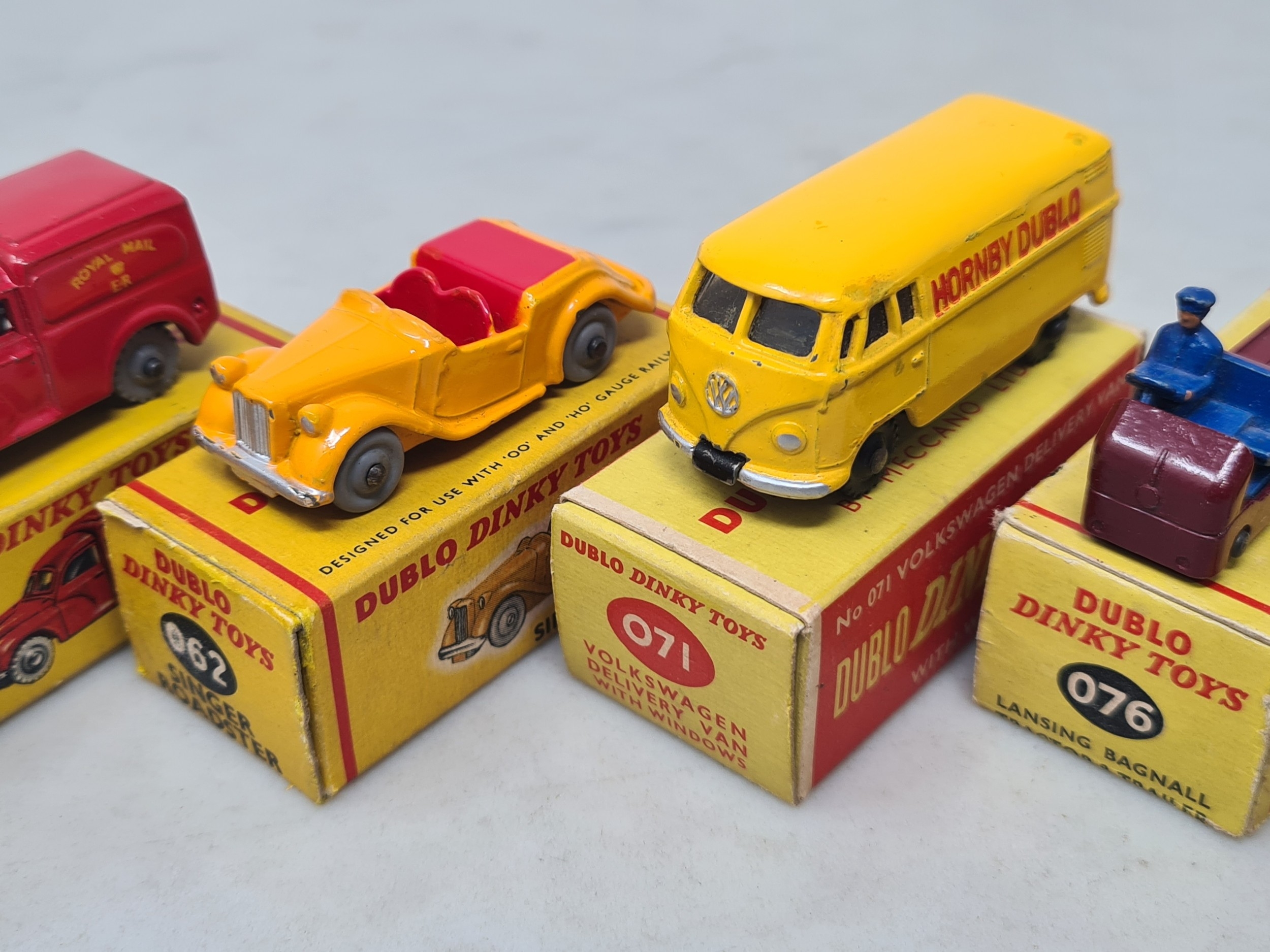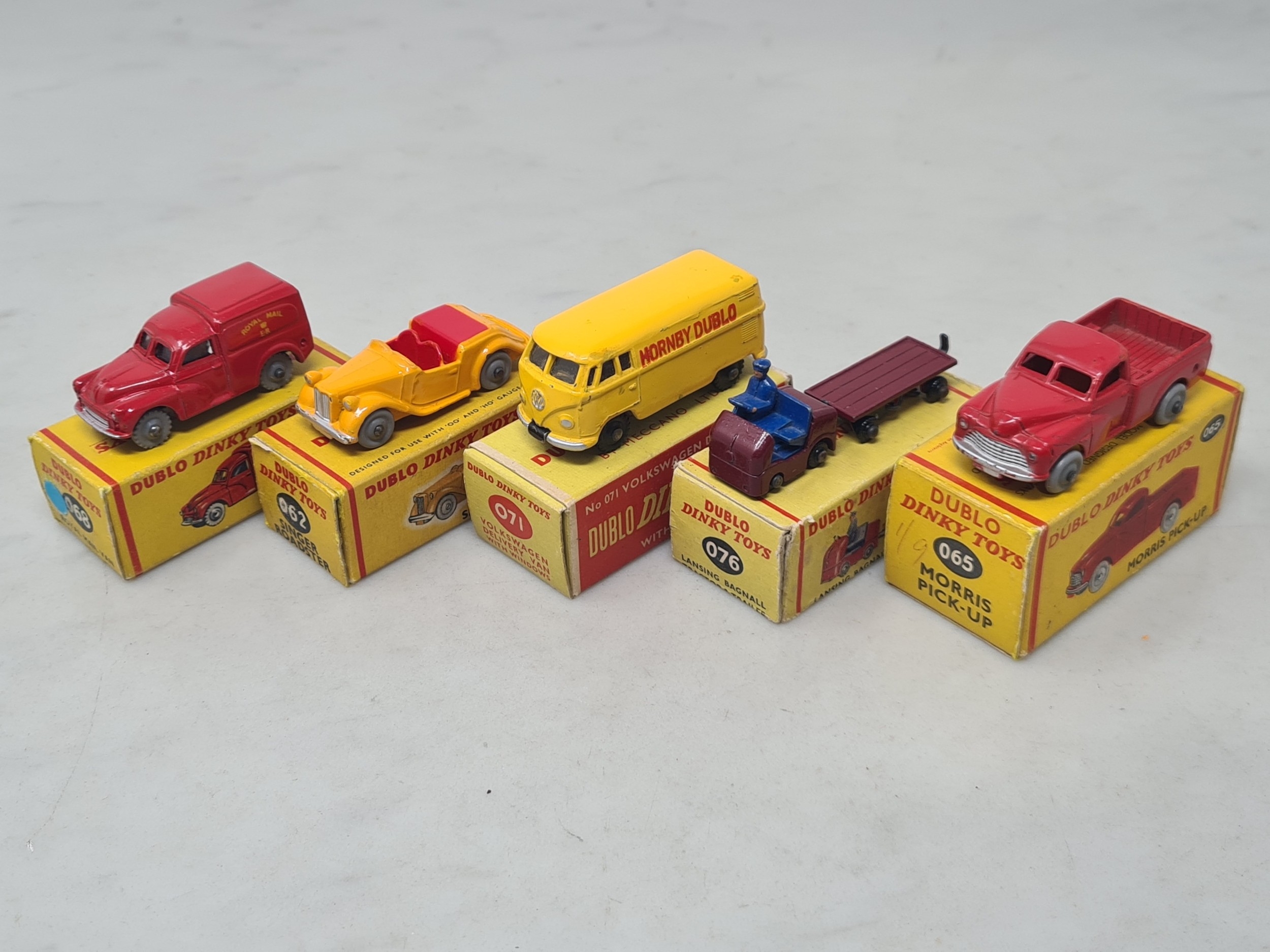 Five boxed Dublo Dinky Toys comprising 076 Lansing Bagnall Tractor and Trailer, 071 Volkswagen Delivery Van, 062 Singer Roadster, 065 Morris Pick-up and 068 Royal Mail Van, all VG-Ex, boxes VG-Ex