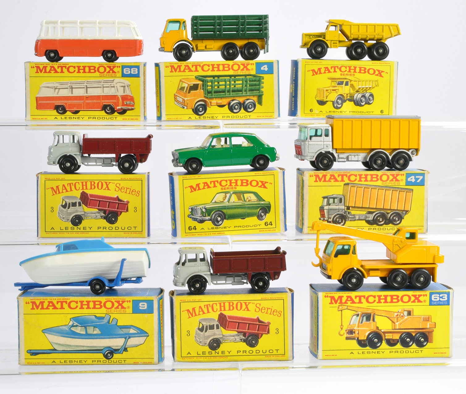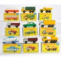 Matchbox Regular wheels comprising nine boxed issues as shown. Stake Truck, Bedford Tipper x 2, MG1100 etc. Mostly very good or excellent in some good but mostly very good/excellent boxes. Generally Ex-Shop Stock.
