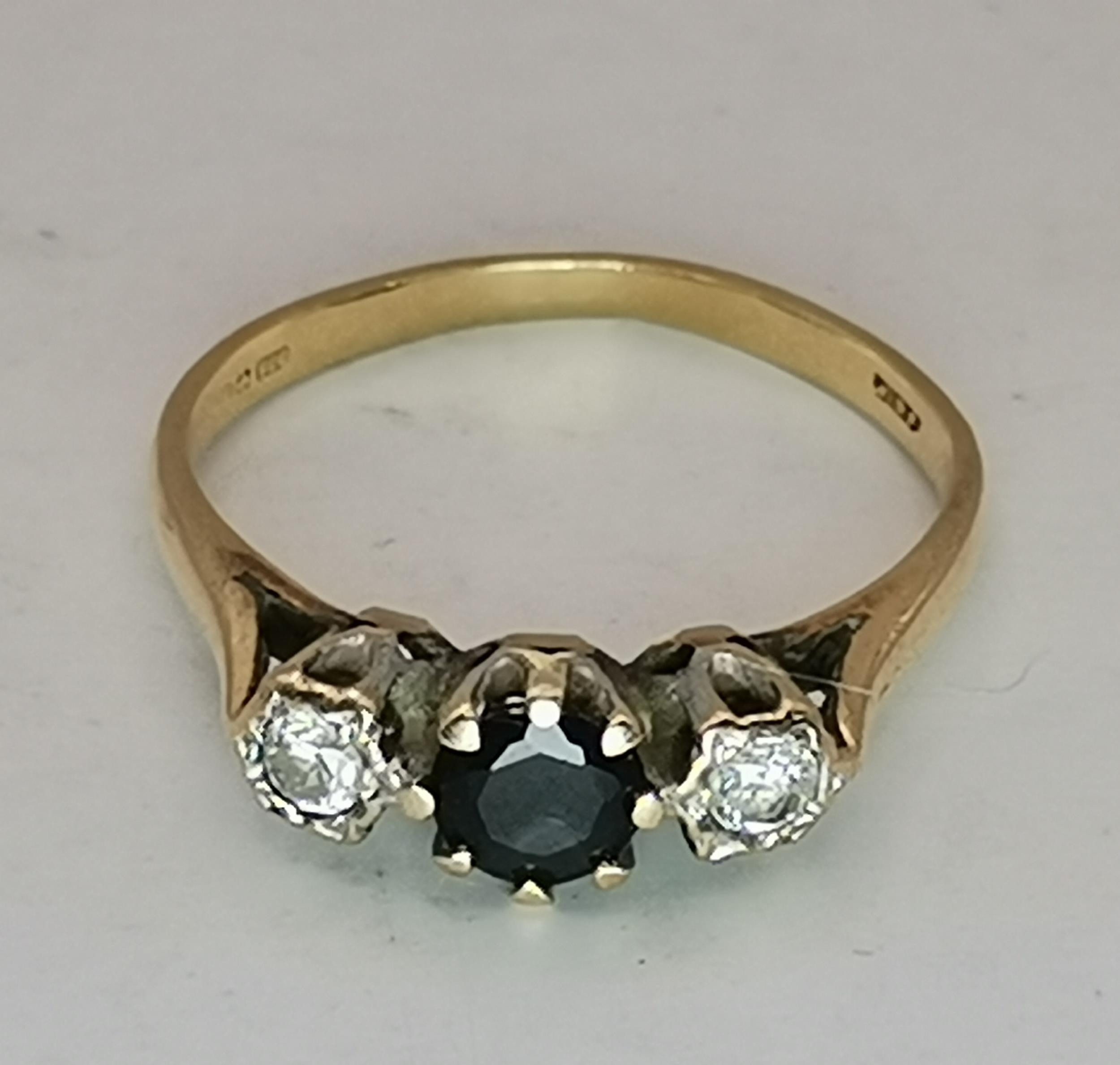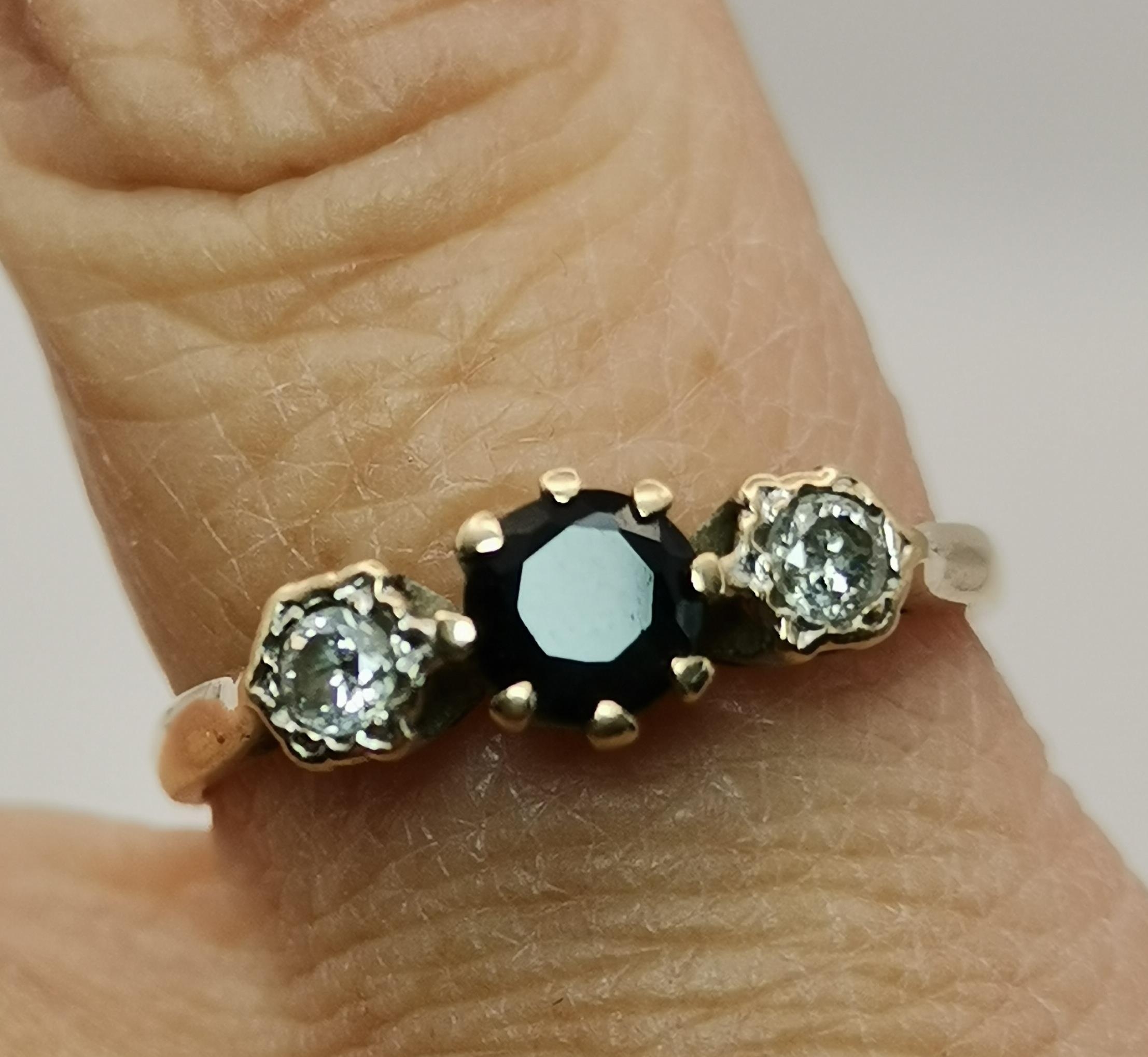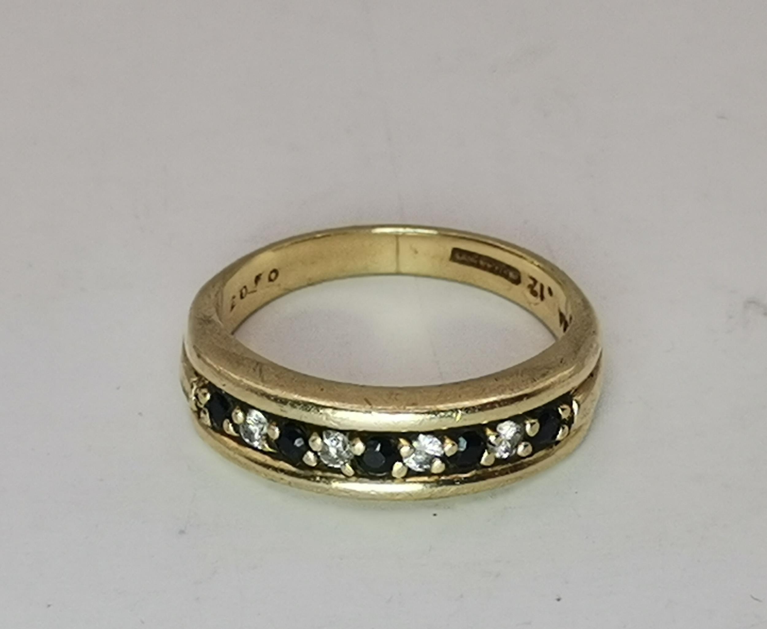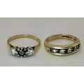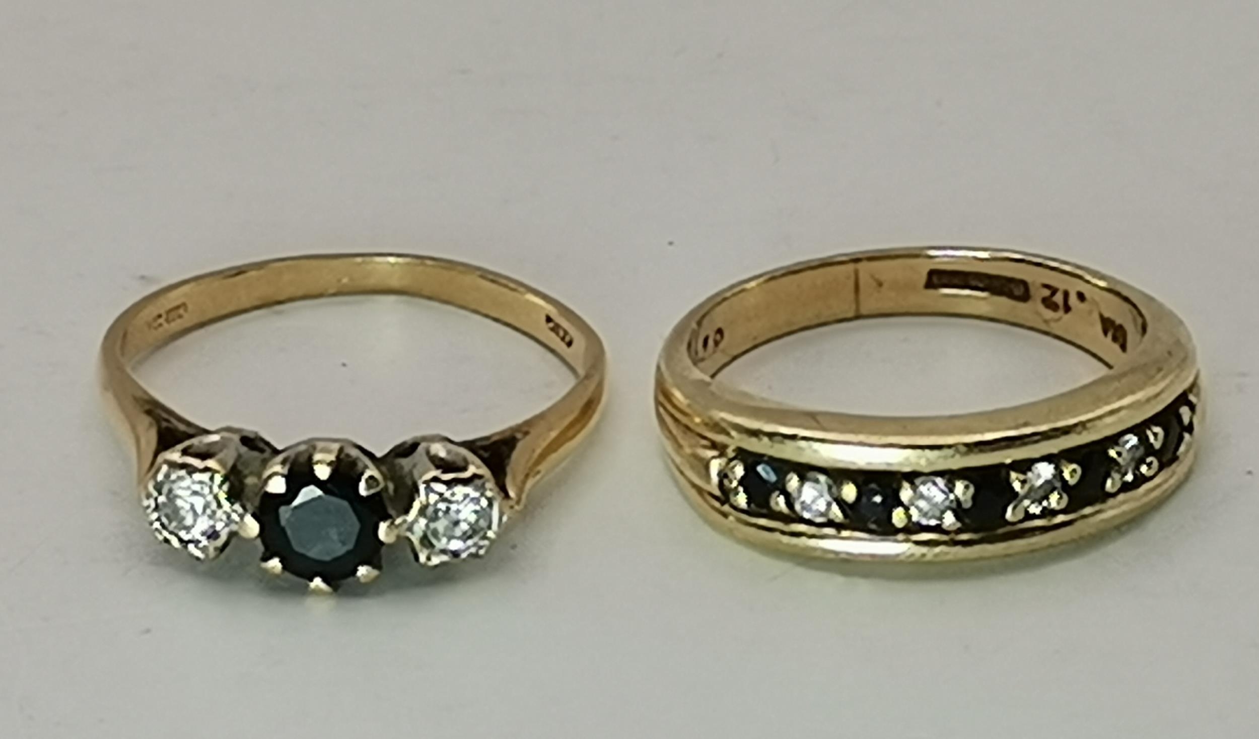 A 9 carat gold three stone ring, the central blue round stone flanked by two round white stones, claw set to an openwork gallery, hallmarked 375, ring size M; together with a 9 carat gold sapphire and diamond half-hoop ring, the five blue stones spaced by four diamonds, channel-set, hallmarked 375, stated diamond weight 0.12 carat, ring size M. (2) 5.3g gross