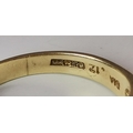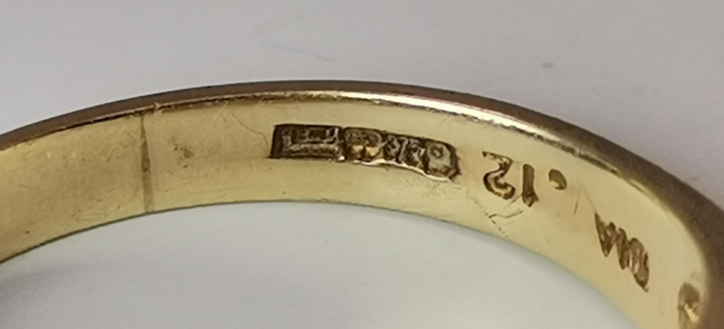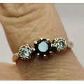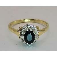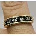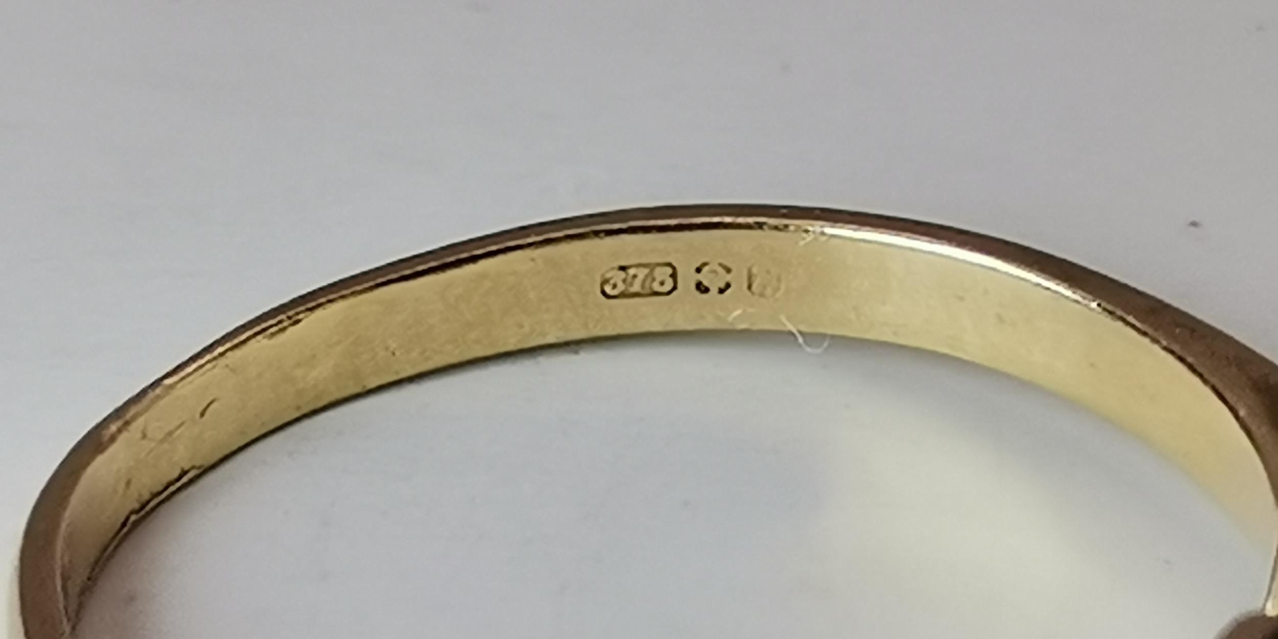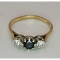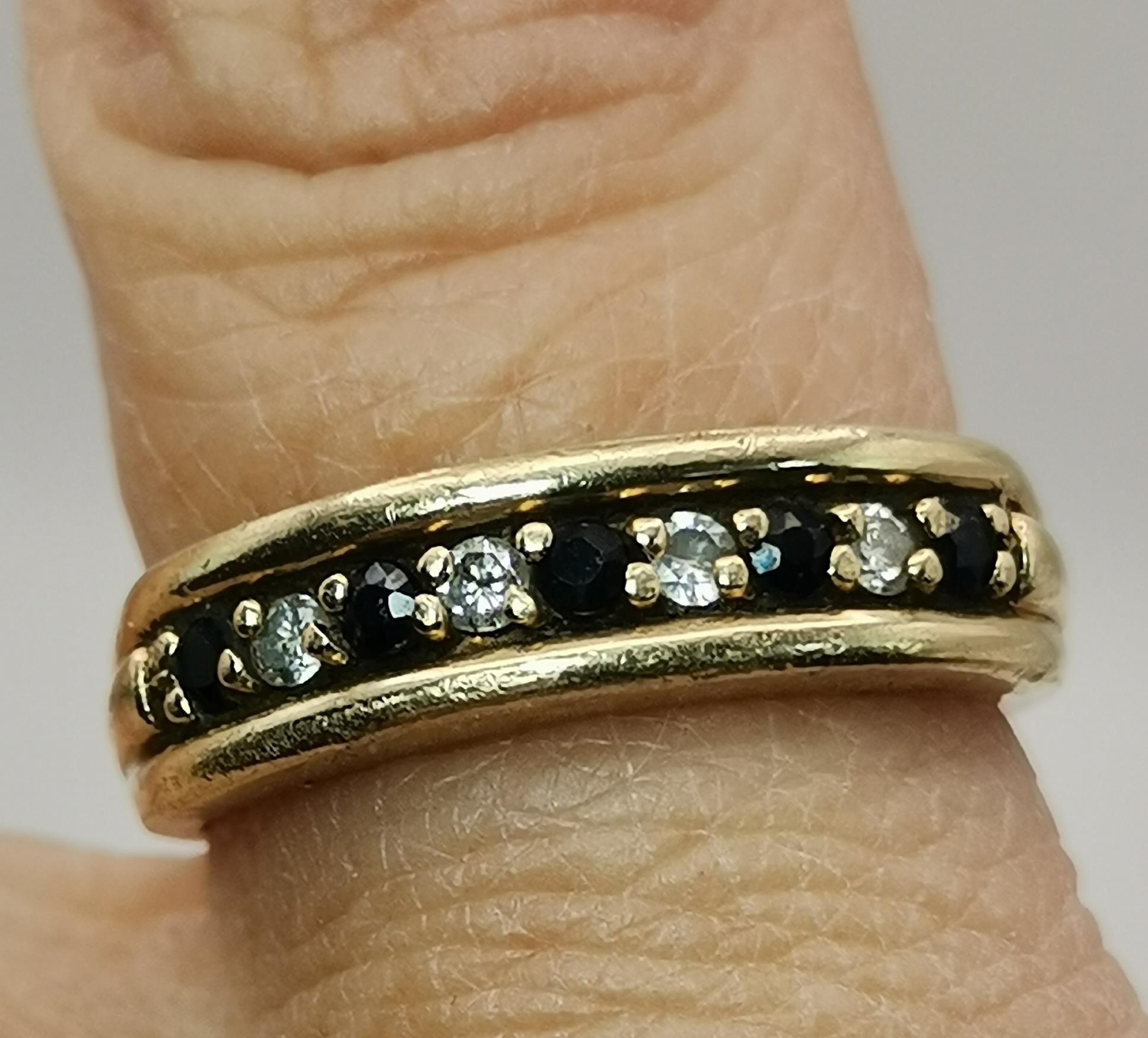 A 9 carat gold three stone ring, the central blue round stone flanked by two round white stones, claw set to an openwork gallery, hallmarked 375, ring size M; together with a 9 carat gold sapphire and diamond half-hoop ring, the five blue stones spaced by four diamonds, channel-set, hallmarked 375, stated diamond weight 0.12 carat, ring size M. (2) 5.3g gross